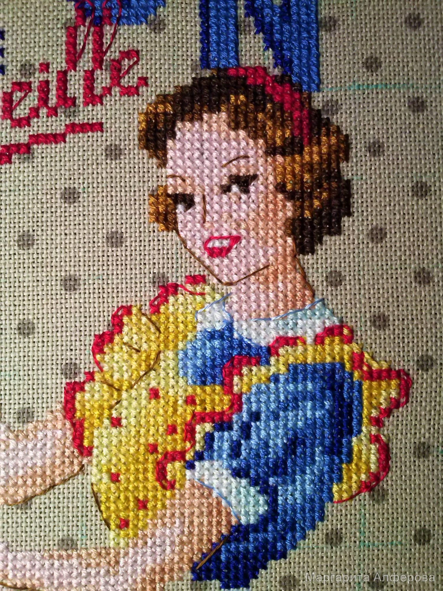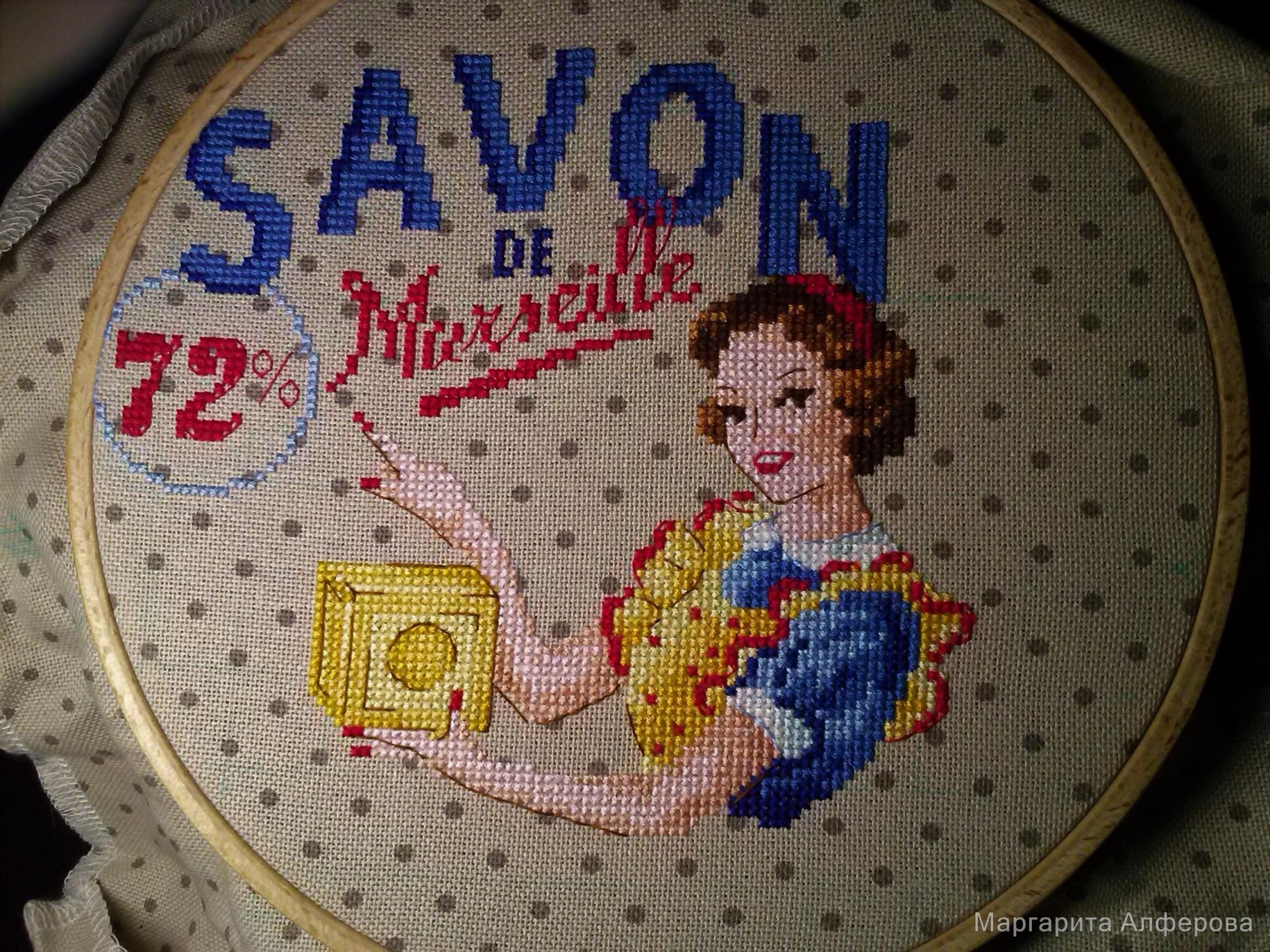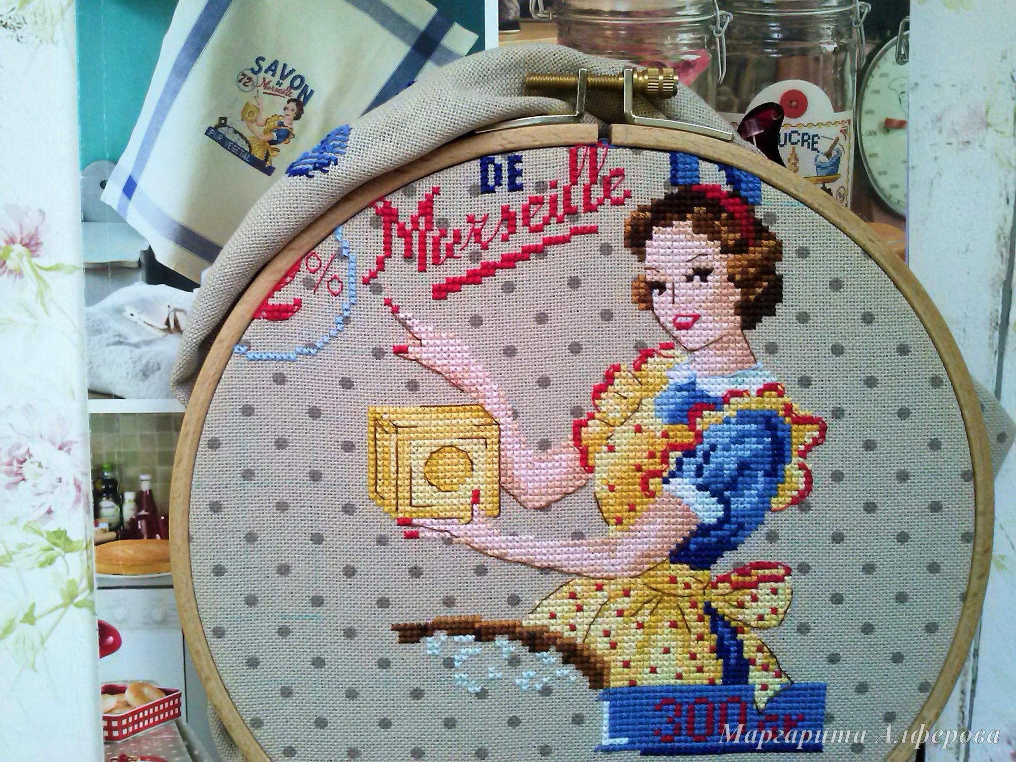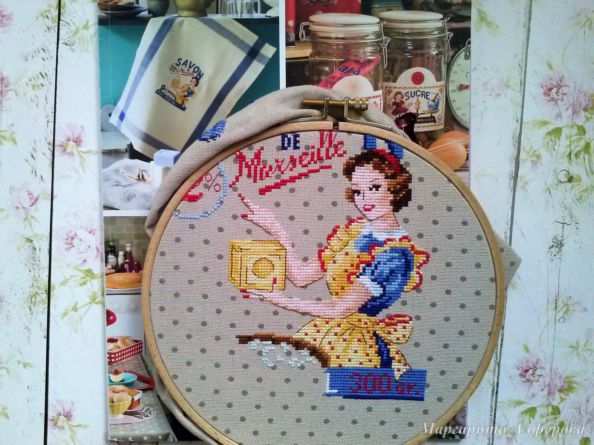 1 октября 2017 Привет - привет, мои дорогие! Как у вас проходит сегодняшний воскресный день? Вы уже готовы к наступающим трудовым будням? Что интересного вы успели за сегодня уже сделать и что планируете на вечер? Ой, у меня было столько планов на сегодня! Но на улице так сыро и холодно, в квартире не сыро, конечно, но тоже так холодно, что... брр... совсем ничегошеньки не хочется делать, а только спать, спать, спать... Да, мне вставать рано категорически противопоказано, а сегодня пришлось. Эх, вот теперь весь день и будет "спать, спать, спать..."! Ну что и на вас уже нагнала сонливость? Честно, я даже сейчас зевнула)) Все, делаю кофе и начинаю показывать что интересненького я вам сегодня принесла! Пришел мой долгожданный и любимый первый сборник лучших схем Вероник "Les plus belles creations de Veronique Enginger au point de croix"! В нем действительно каким-то чудесным образом собрано большинство моих самых любимых дизайнов! Даже не понимаю почему я только сейчас его купила? Вот - сокрооовище! А вот теперь два "сокровища" вместе И третье уже на подходе Угууу, будет еще и третье и, надеюсь, не последнее. Да-с, у кого-то золото и бриллианты, а у нас лен и книги! Обожаю! Влюблена всей Ритой в книги Veronique Enginger! Я уже писала, что больше всего у Вероник люблю серию Винтаж, с нее, собственно говоря, и началась моя страстная любовь к французской вышивке вообще и к Верноник Ажинер в частности. Не удивлюсь, если когда-нибудь я вышью все дизайны)) Не знаю как вас, а меня очаровывают все эти милые барышни на рекламных постах 50-х гг, аккуратненькие домохозяйки в кружевных передниках на тонкой талии и платьях в стиле "нью-лук"! Да, конечно же, заговорила я обо всем этом не случайно Еще летом я начала вышивать "Марсельское мыло". Точнее вышить его я хотела всегда, но никак не могла найти подходящий фон. Просто на белом, однозначно, нет. Некоторые вышивают на голубой клеточке, не плохо, но опять что-то не по мне. Этот дизайн вообще очень самостоятельный, такую картинку куда попало не прилепишь - не пришьешь. И так меня и одолевали сомнения пока Юля @apanjul ни подарила мне бежевую Мурано в горошек хаки. Как только я ее увидела, все! Как говорят, пазл сложился! То что надо! Она же один в один как винтажные обои - припыленный цвет, горошек, обои такого цвета очень часто видно в американских фильмах тех лет. Я несколько лет думала об этом дизайне и неужели теперь меня могло что-то остановить?! Не было цели вышить его быстрее, отложить все остальное и т.д., нет, я просто потихонечку начала его вышивать, по нескольку дней, раз в неделю и как-то вот так не заметно получилось, что в отличии от всех остальных начатых процессов этот уже подходит к концу. А раз уж сегодня я вам показываю мой новый сборник схем В.А. на обложке которого красуется "Марсельское мыло", то значит и процесс показывать самое время! Пожалуйста, встречайте! Veronique Enginger "Savon de Marseille" Думаю, все знают где находится прекрасный Марсель и он не нуждается в представлении. Если только несколько фото Марсельское мыло. Нет не так. Легендарное Марсельское мыло. Многовековая история, идеальное качество, я хотела написать о нем подробно, но потом подумала, что не буду утомлять вас историческими датами и хвалебными одами, а тоже просто покажу фото, в которых вы сами все увидите Сегодня а вот любимый винтаж, даже затрудняюсь сказать какие это годы И особо умиляет А теперь выливаю ос