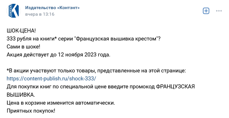 31 октября 2023 2 часа назад, Sagittarius сказал(а): Девочки, на сайте издательства "Контэнт" акция: некоторые книги серии «Французская вышивка» по 333 р. Я так давно мечтала об этих книгах надо брать, спасибо за наводку! Аленка-2, нельга, Толика и 3 других сказали спасибо Поделиться сообщением Ссылка на сообщение