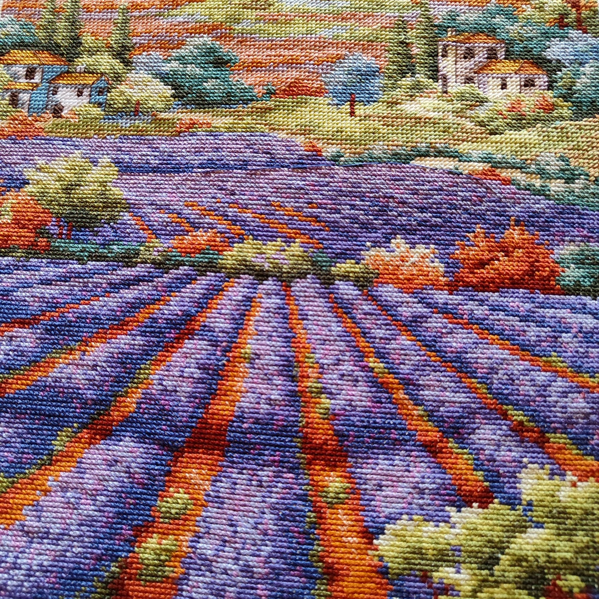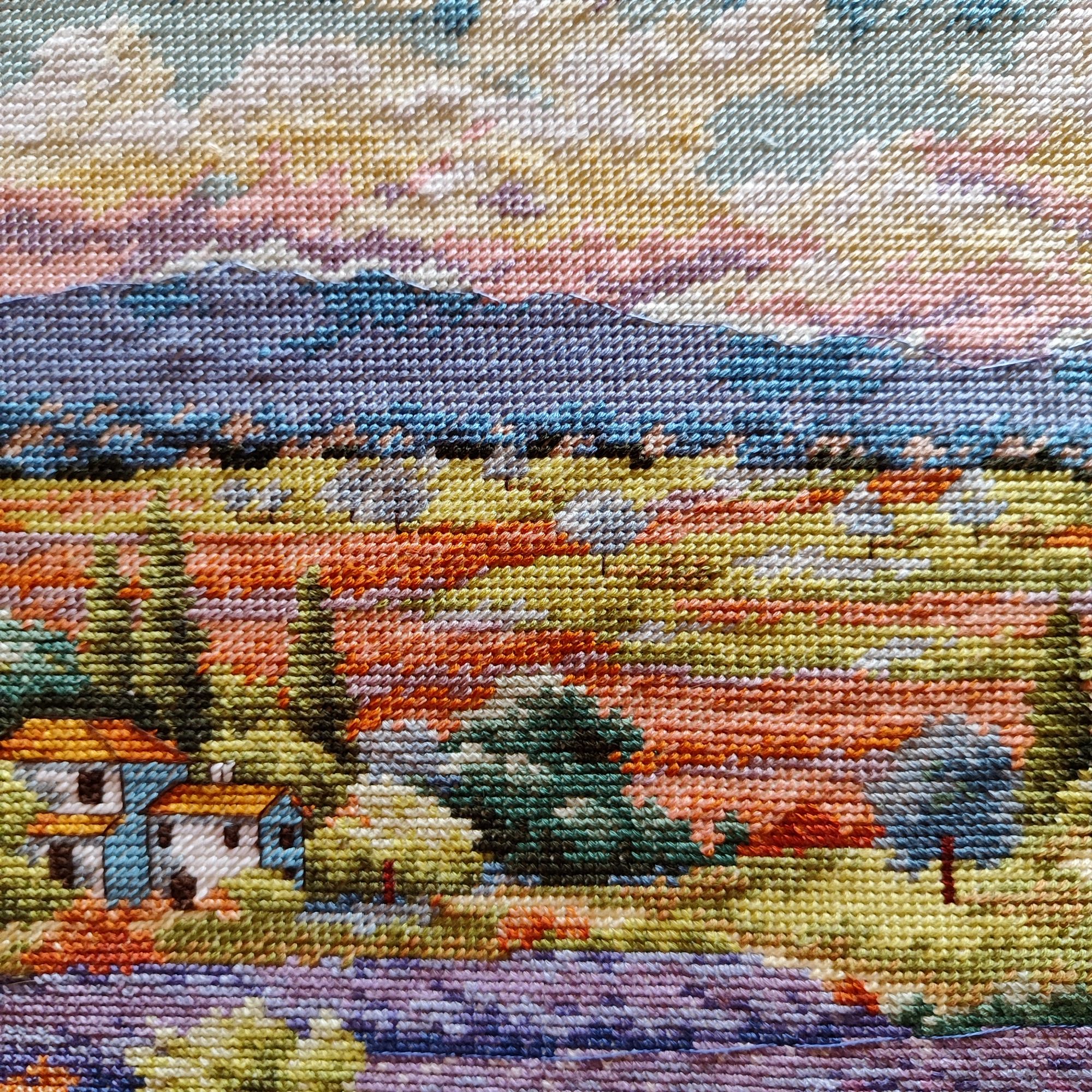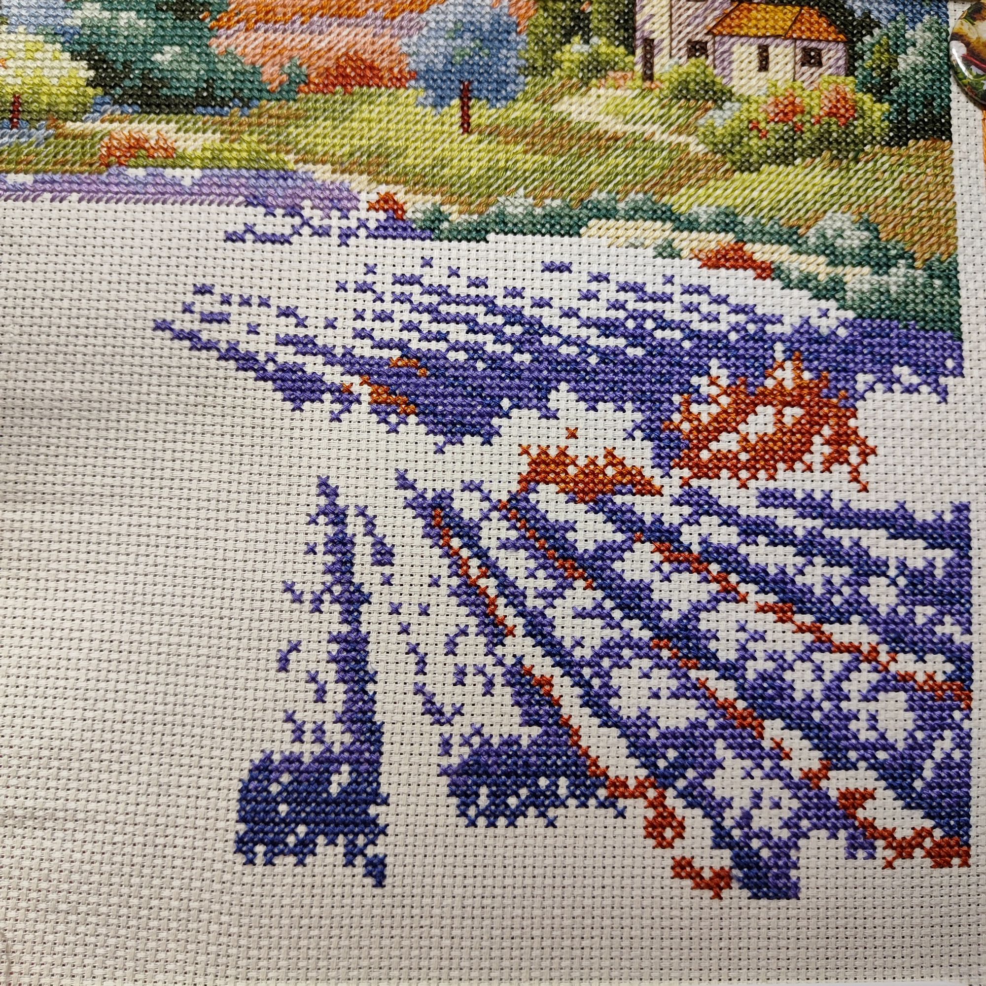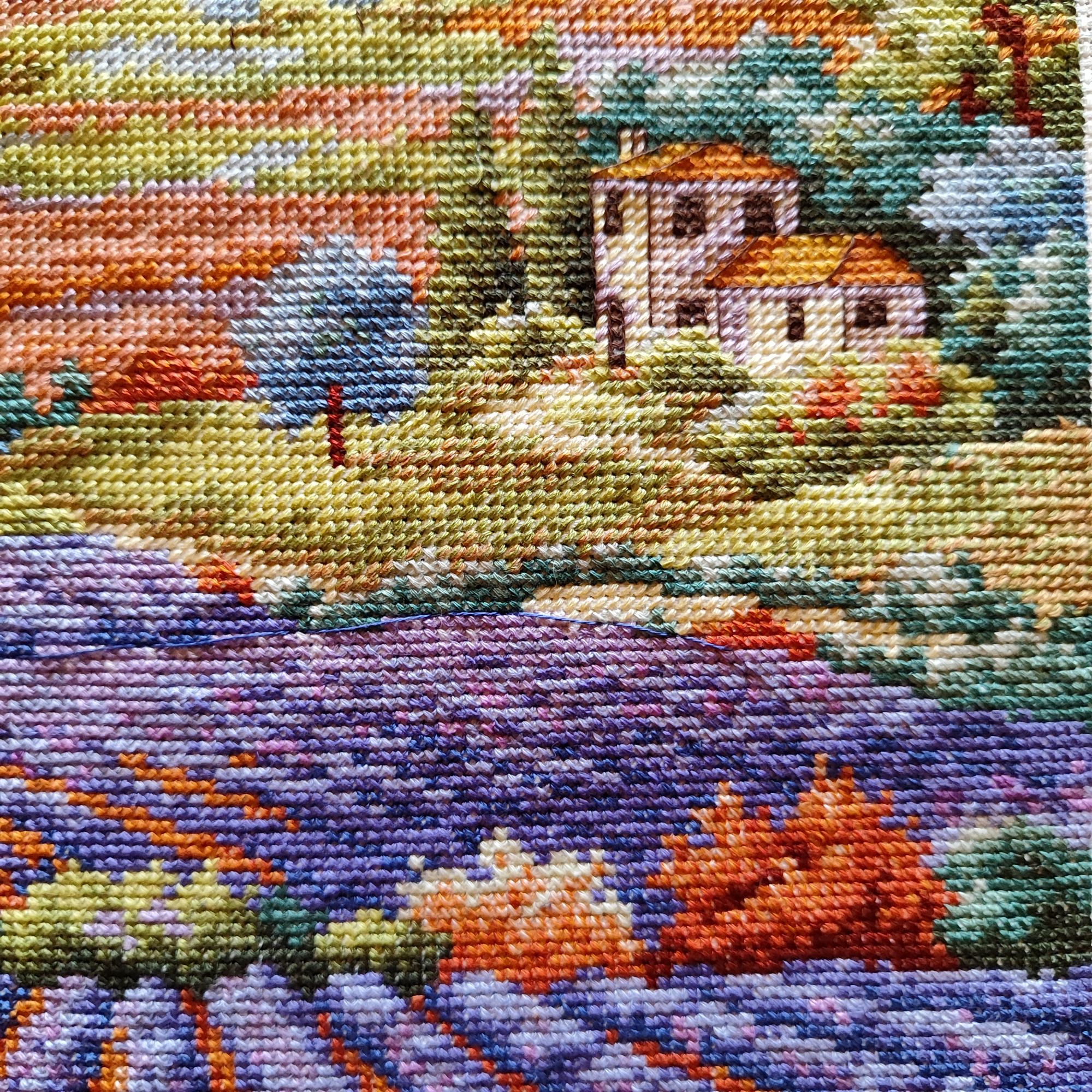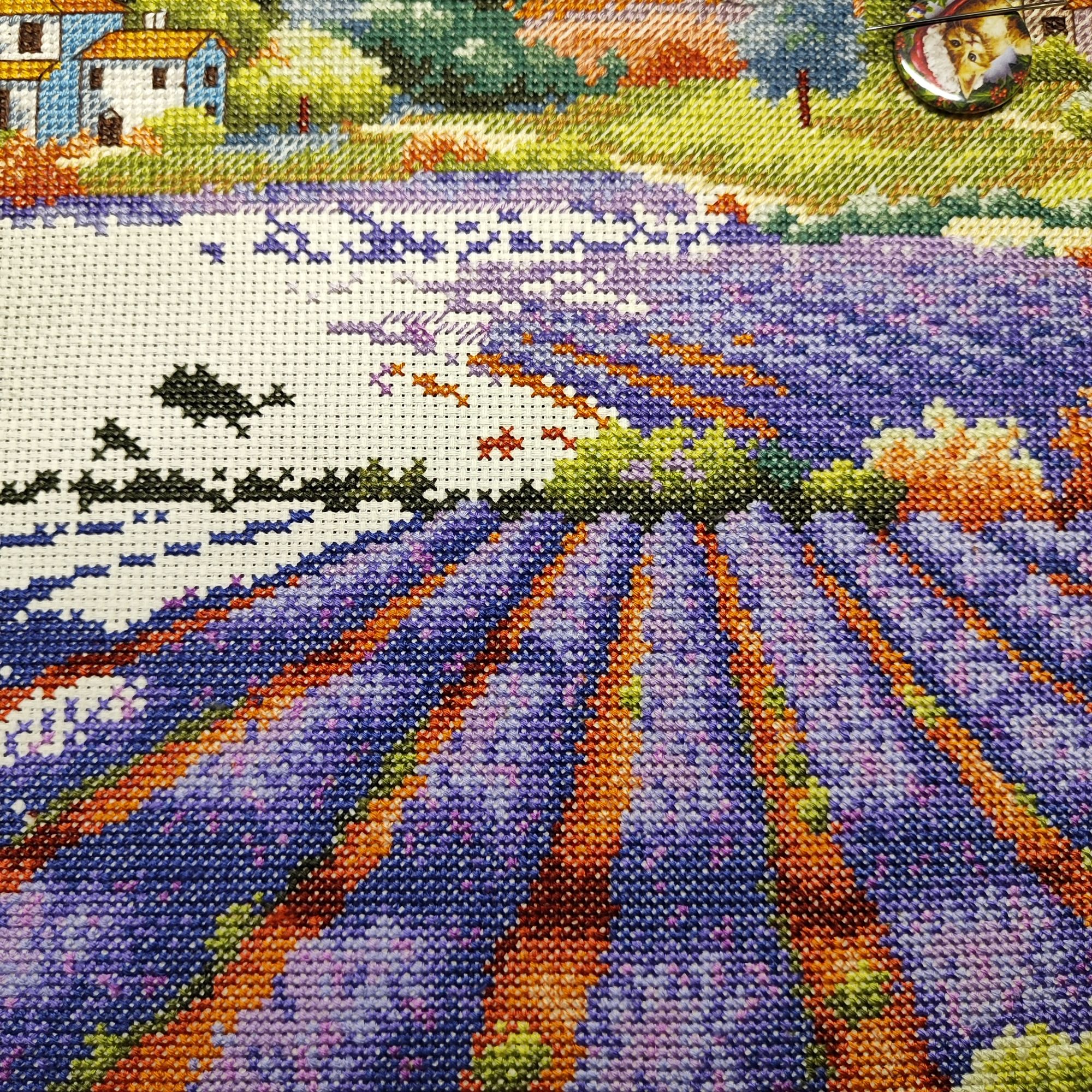 9 июля 2023 Как ни странно, в букетике от Иглы попались весьма неплохие нитки, на упаковке даже прилеплена наклейка, что набор укомплектован нитками Гамма, а они мне нравятся. Поэтому букет вышивается и забрасывать его,как предыдущие, желания пока не возникало. Нормальные такие нитки, послушные оказались. Бэк, конечно, все такой же, не по клеточкам, но я не заморачиваюсь. В принципе осталось вышить половинку, если не меньше. И продвигается лавандовое поле от Дим, почему-то я решила вышить сначала весь полукрест, который в верхней половине картины, а потом взяться за нижнюю часть, где один крестик. Мне кажется, нижняя часть даже поинтереснее будет, потому что там нитки ярче, мне не очень понравилось вышивать верхушку такими бледными оттенками)) работа, кстати, простая, бэка практически нет, в основном домики и небольшие стежочки в виде стволов у деревьев на заднем плане. Фро-J, Дикая белочка, Irina 1 и 19 других сказали спасибо Поделиться сообщением Ссылка на сообщение