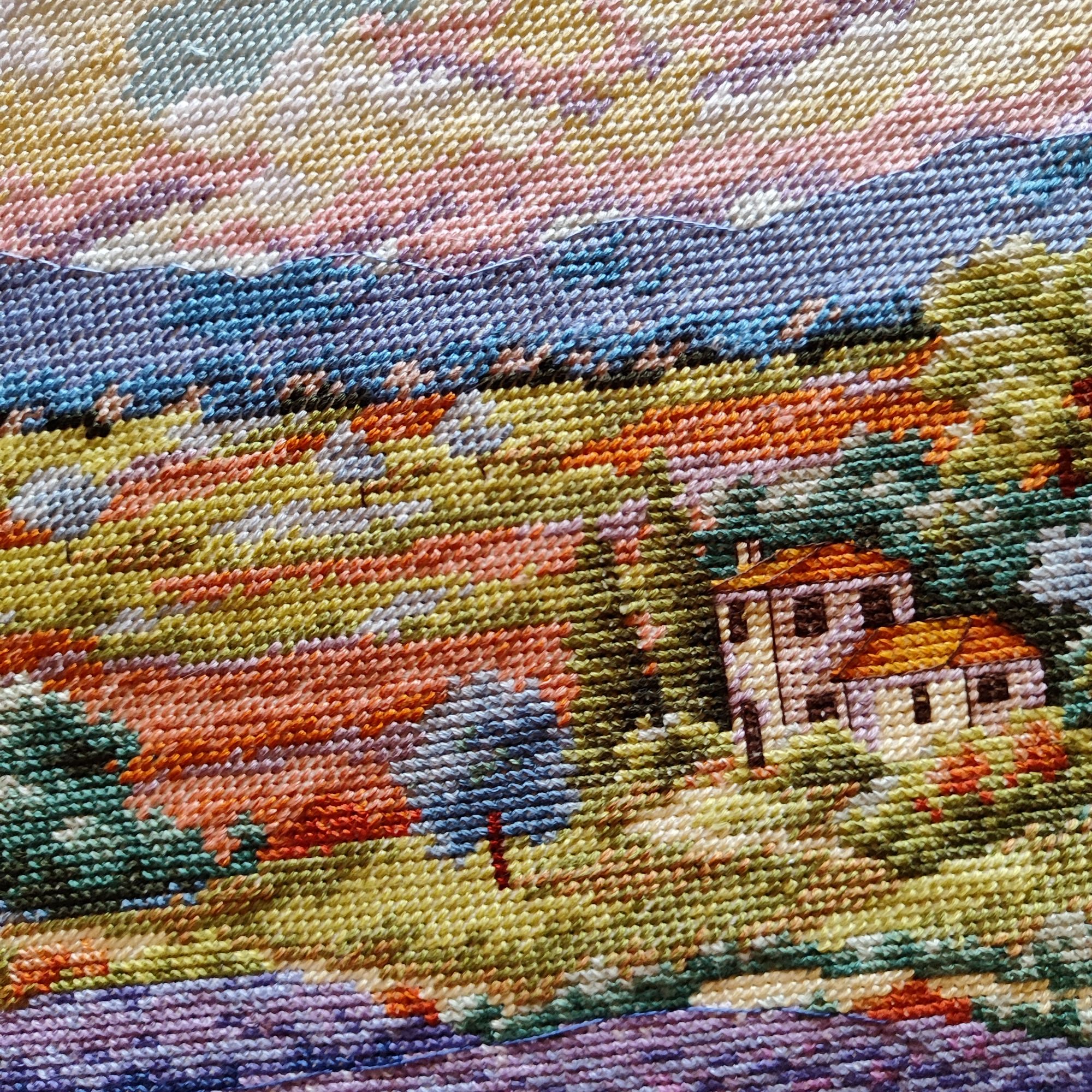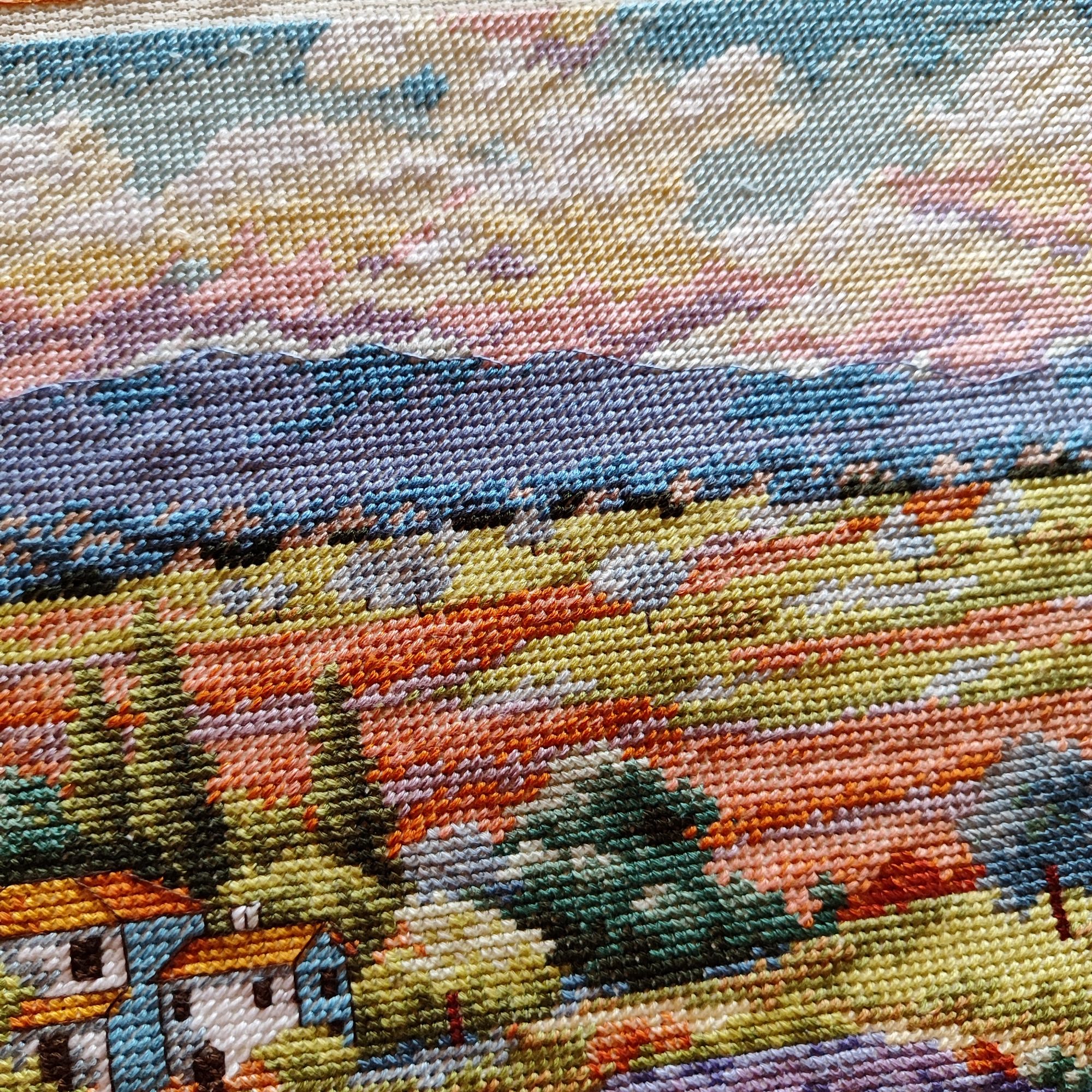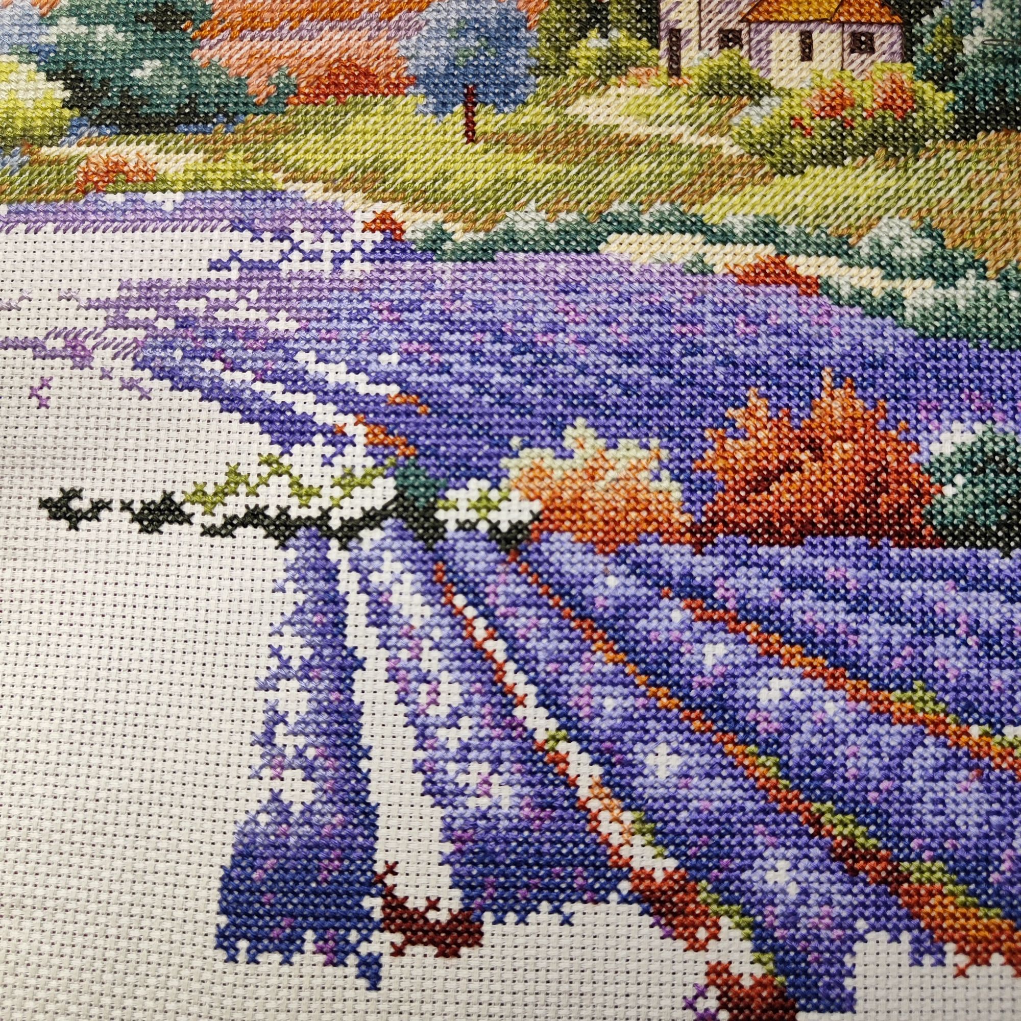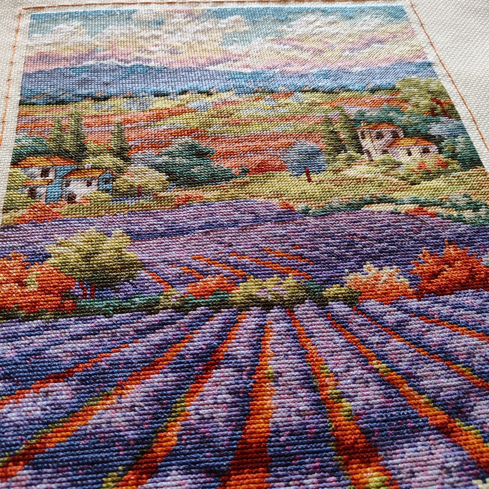 9 июля 2023 Как ни странно, в букетике от Иглы попались весьма неплохие нитки, на упаковке даже прилеплена наклейка, что набор укомплектован нитками Гамма, а они мне нравятся. Поэтому букет вышивается и забрасывать его,как предыдущие, желания пока не возникало. Нормальные такие нитки, послушные оказались. Бэк, конечно, все такой же, не по клеточкам, но я не заморачиваюсь. В принципе осталось вышить половинку, если не меньше. И продвигается лавандовое поле от Дим, почему-то я решила вышить сначала весь полукрест, который в верхней половине картины, а потом взяться за нижнюю часть, где один крестик. Мне кажется, нижняя часть даже поинтереснее будет, потому что там нитки ярче, мне не очень понравилось вышивать верхушку такими бледными оттенками)) работа, кстати, простая, бэка практически нет, в основном домики и небольшие стежочки в виде стволов у деревьев на заднем плане. Фро-J, Дикая белочка, Irina 1 и 19 других сказали спасибо Поделиться сообщением Ссылка на сообщение