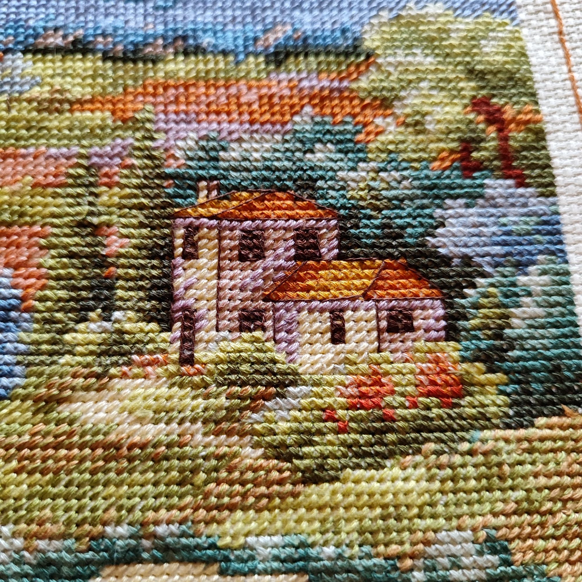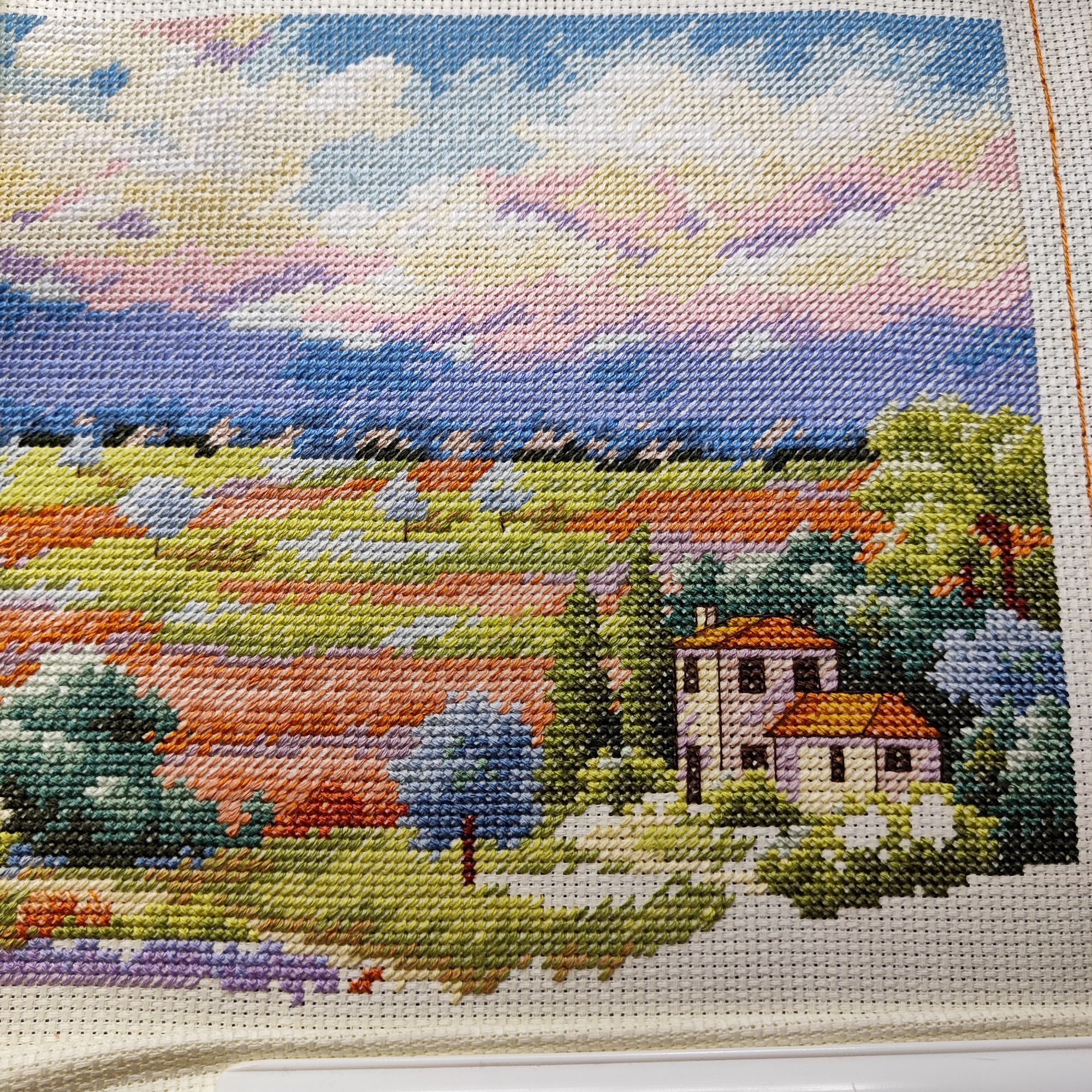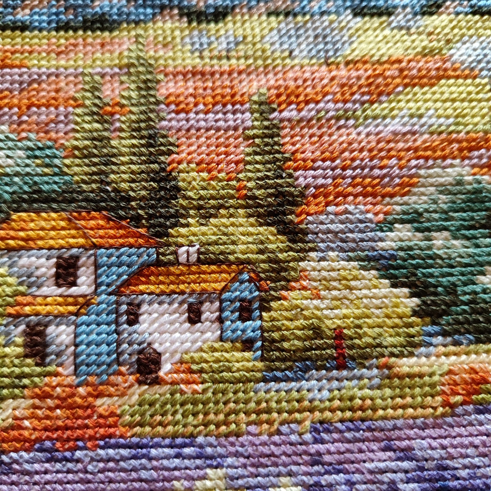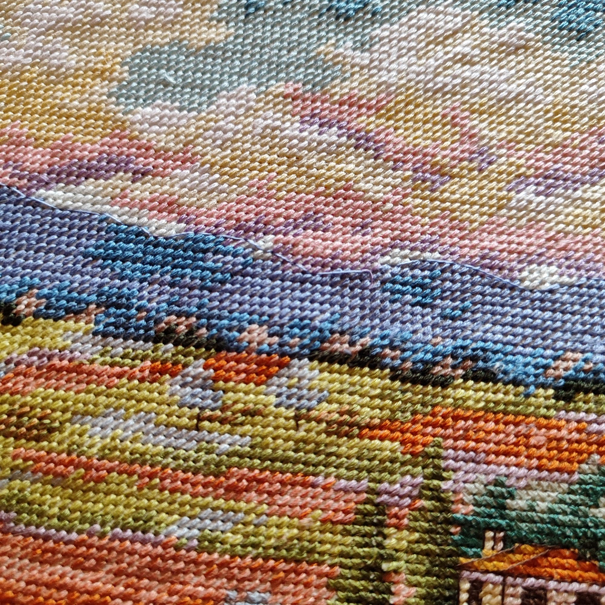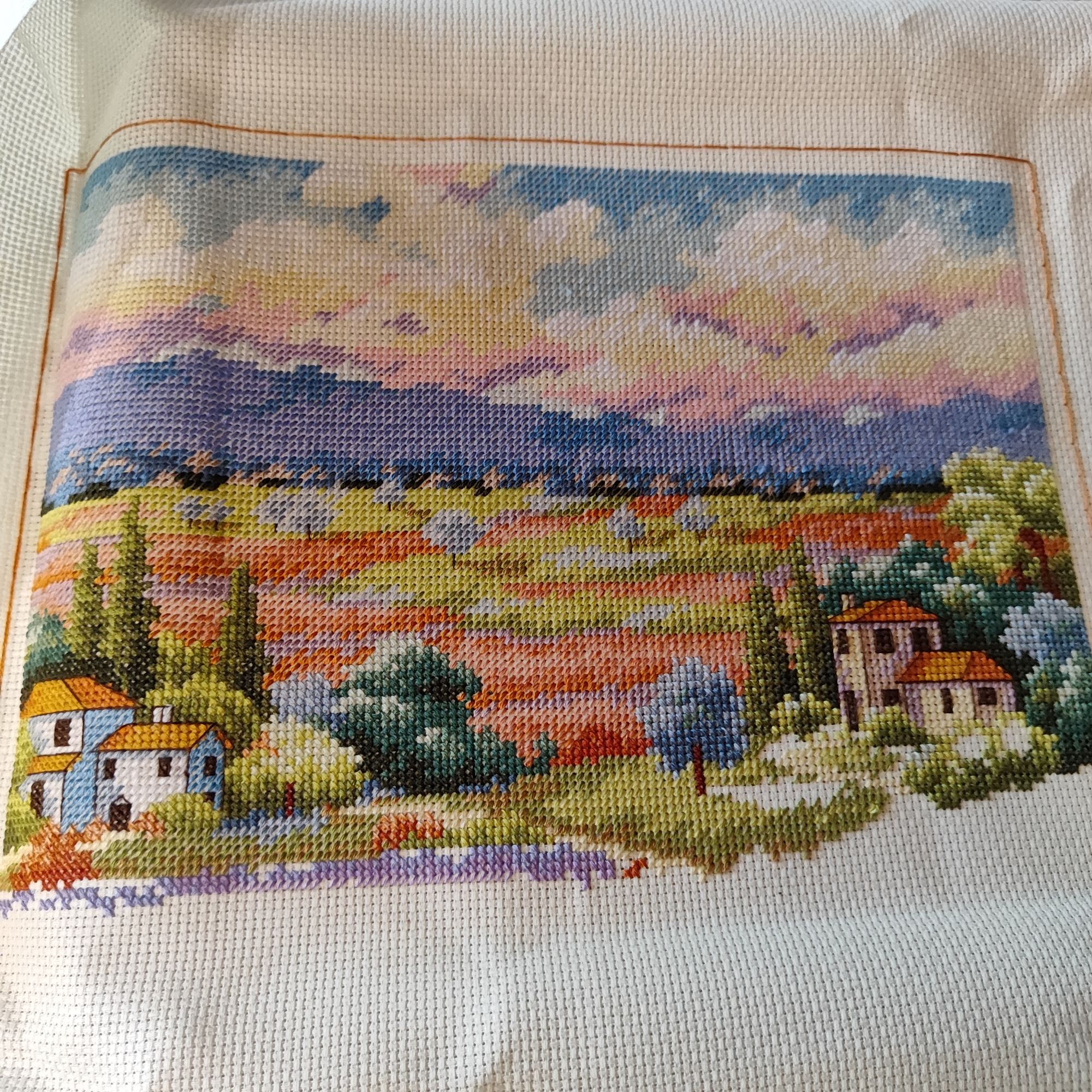 9 июля 2023 Как ни странно, в букетике от Иглы попались весьма неплохие нитки, на упаковке даже прилеплена наклейка, что набор укомплектован нитками Гамма, а они мне нравятся. Поэтому букет вышивается и забрасывать его,как предыдущие, желания пока не возникало. Нормальные такие нитки, послушные оказались. Бэк, конечно, все такой же, не по клеточкам, но я не заморачиваюсь. В принципе осталось вышить половинку, если не меньше. И продвигается лавандовое поле от Дим, почему-то я решила вышить сначала весь полукрест, который в верхней половине картины, а потом взяться за нижнюю часть, где один крестик. Мне кажется, нижняя часть даже поинтереснее будет, потому что там нитки ярче, мне не очень понравилось вышивать верхушку такими бледными оттенками)) работа, кстати, простая, бэка практически нет, в основном домики и небольшие стежочки в виде стволов у деревьев на заднем плане. Фро-J, Дикая белочка, Irina 1 и 19 других сказали спасибо Поделиться сообщением Ссылка на сообщение