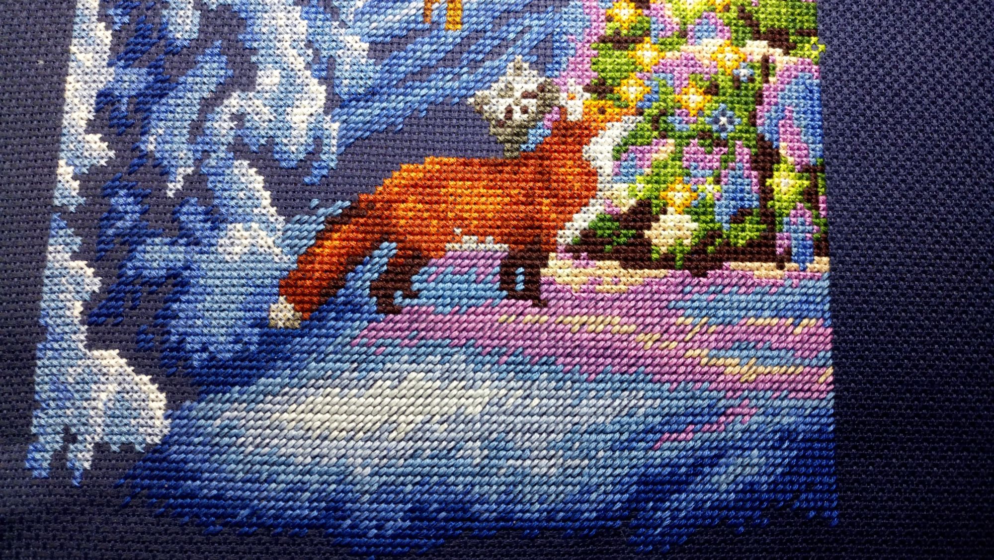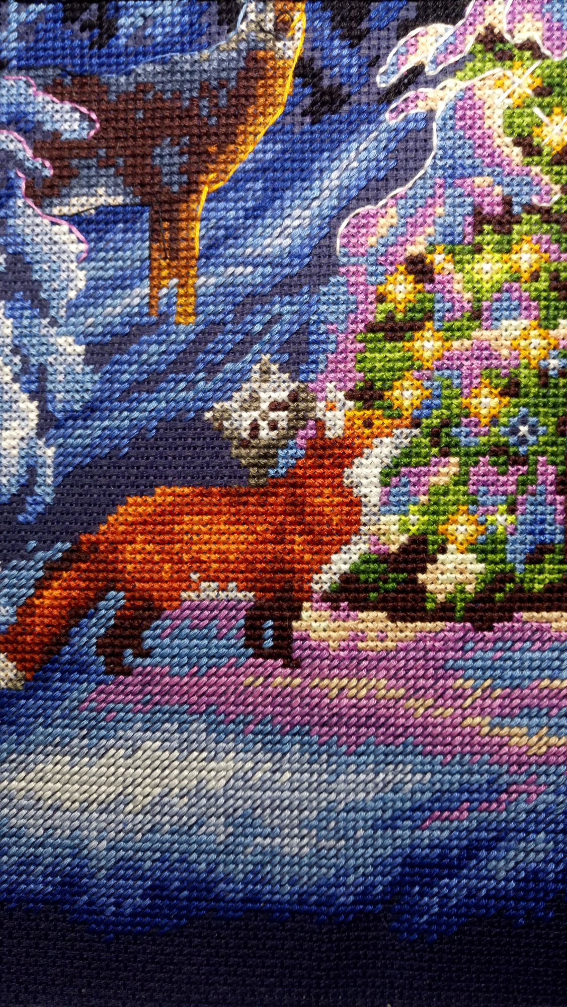 9 декабря 2018 Ну вот. Разделила всю картину на четыре части, в итоге на каждую четвертушку уходит неделя. Очень надеюсь, что управлюсь с этим сюжетом до нового года, совсем не хочется перетаскивать работы с этого года на другой (ну вот такая я зануда))). Не думала, что можно передать сверкание елочки такими обычными оттенками! И все, как у Дима обычно - вышиваешь какими-то странными на первый взгляд нитками, которые вообще не подходят (как порой кажется)), а в итоге получается вот такое волшебство! Из кучки невразумительных серых крестиков появляется мордочка енота! И яркая лисичка подошла к елочке И снег возле ёлки. Ну казалось бы, к чему здесь эти оттенки розового, жёлтого и синего, а получается отблеск сверкающей ёлки на снегу, ну здорово же! Процесс мне очень нравится, никаких сложностей с тёмной канвой, все мне прекрасно видно, никакого дискомфорта нет. Вышивать нескучно потому, что есть ёлка, где много разных цветов таких ярких, насышенных. Бэк, кстати, тоже ненапряжный, в общем, нравится мне этот новогодний сюжет))) татьяна0674, Чивава, Luba52 и 29 других сказали спасибо Поделиться сообщением Ссылка на сообщение