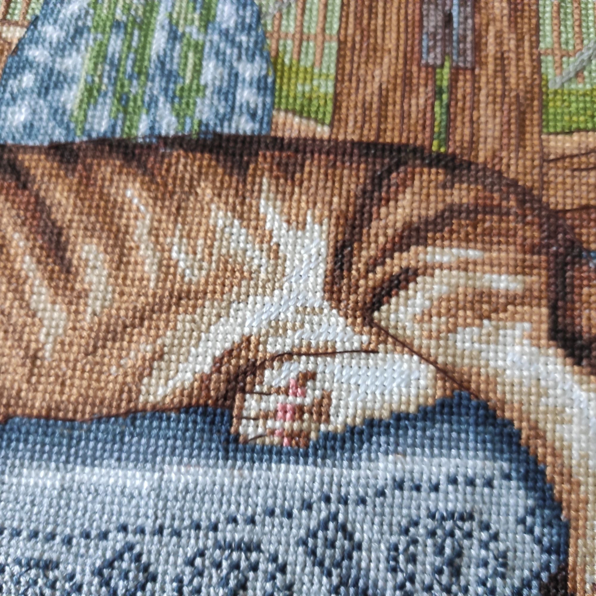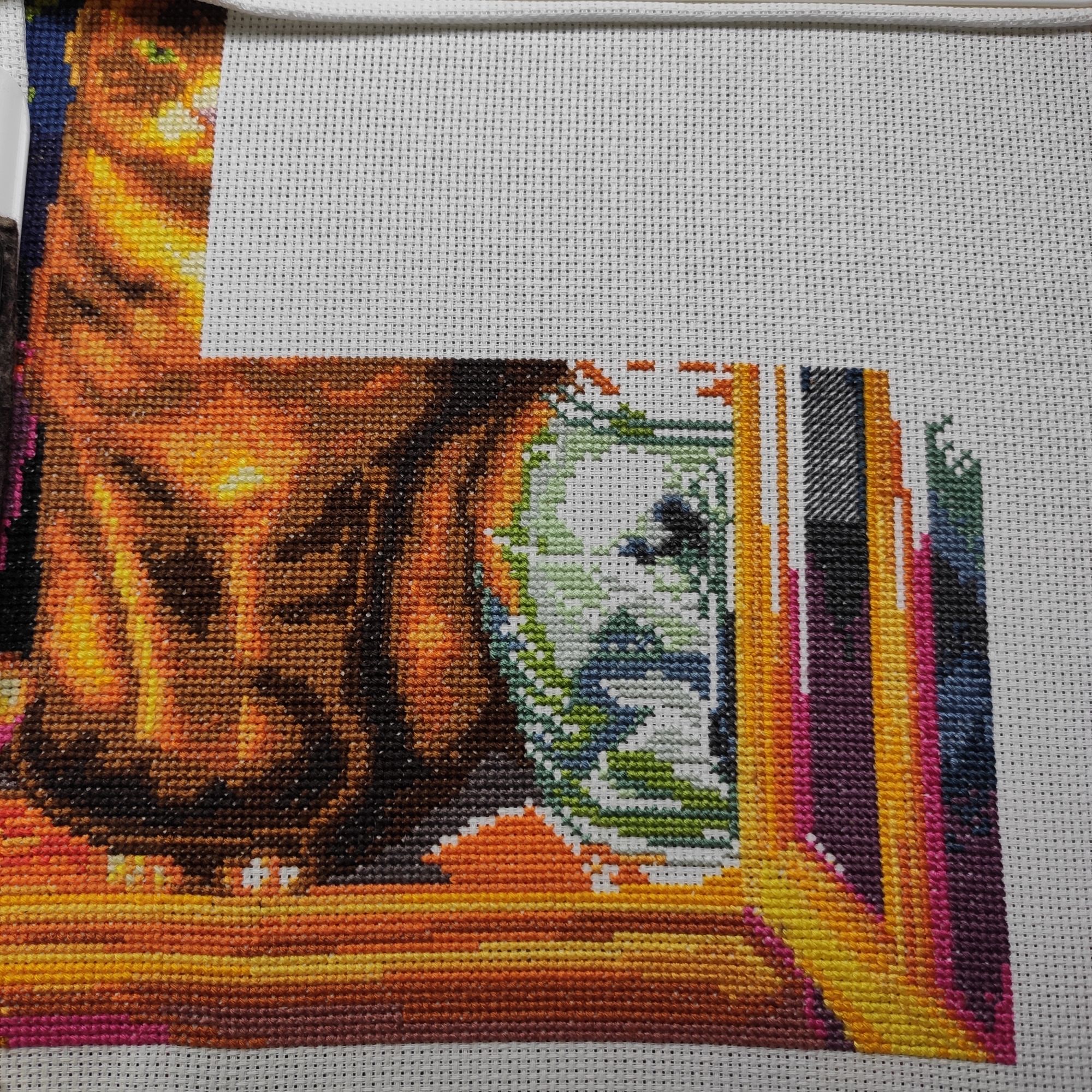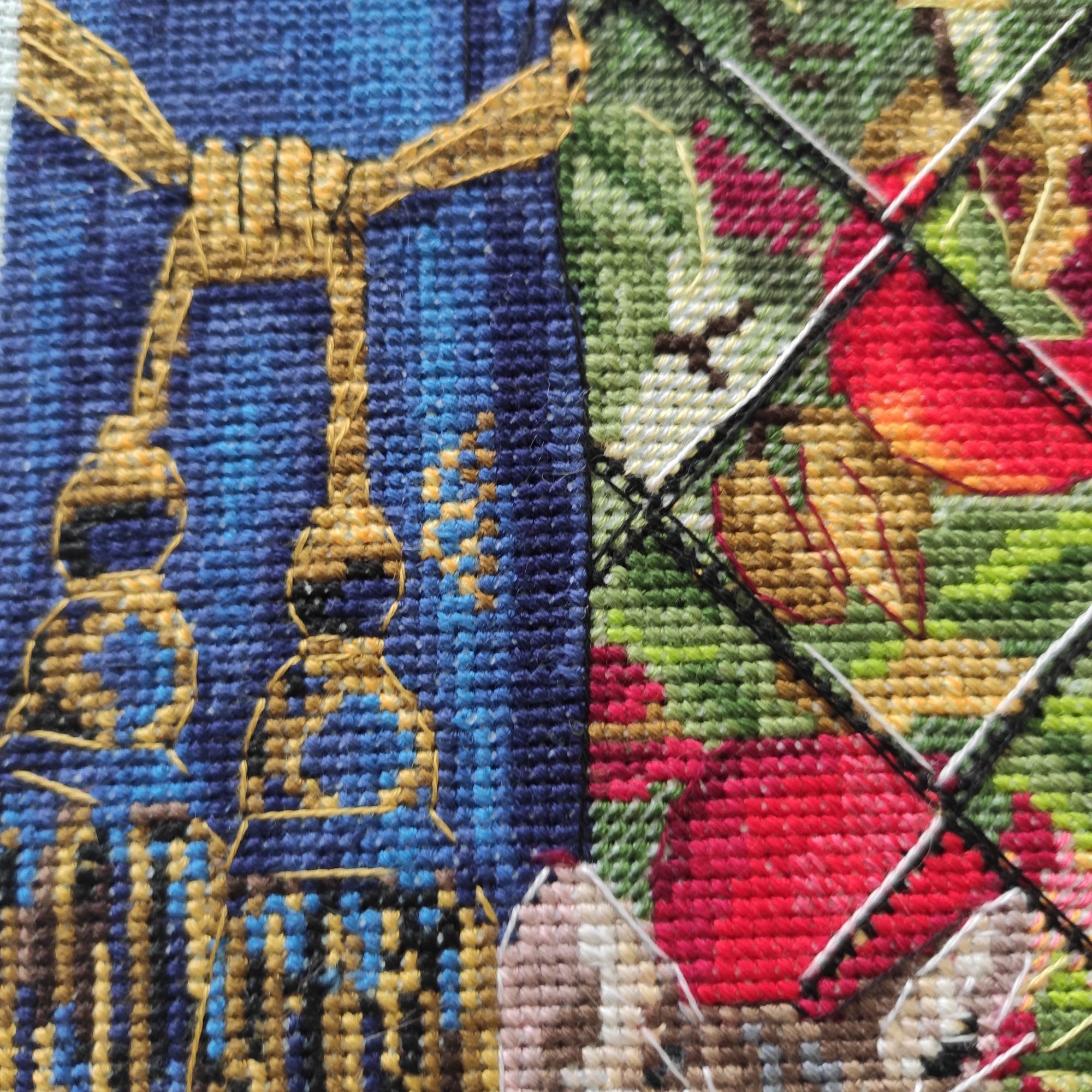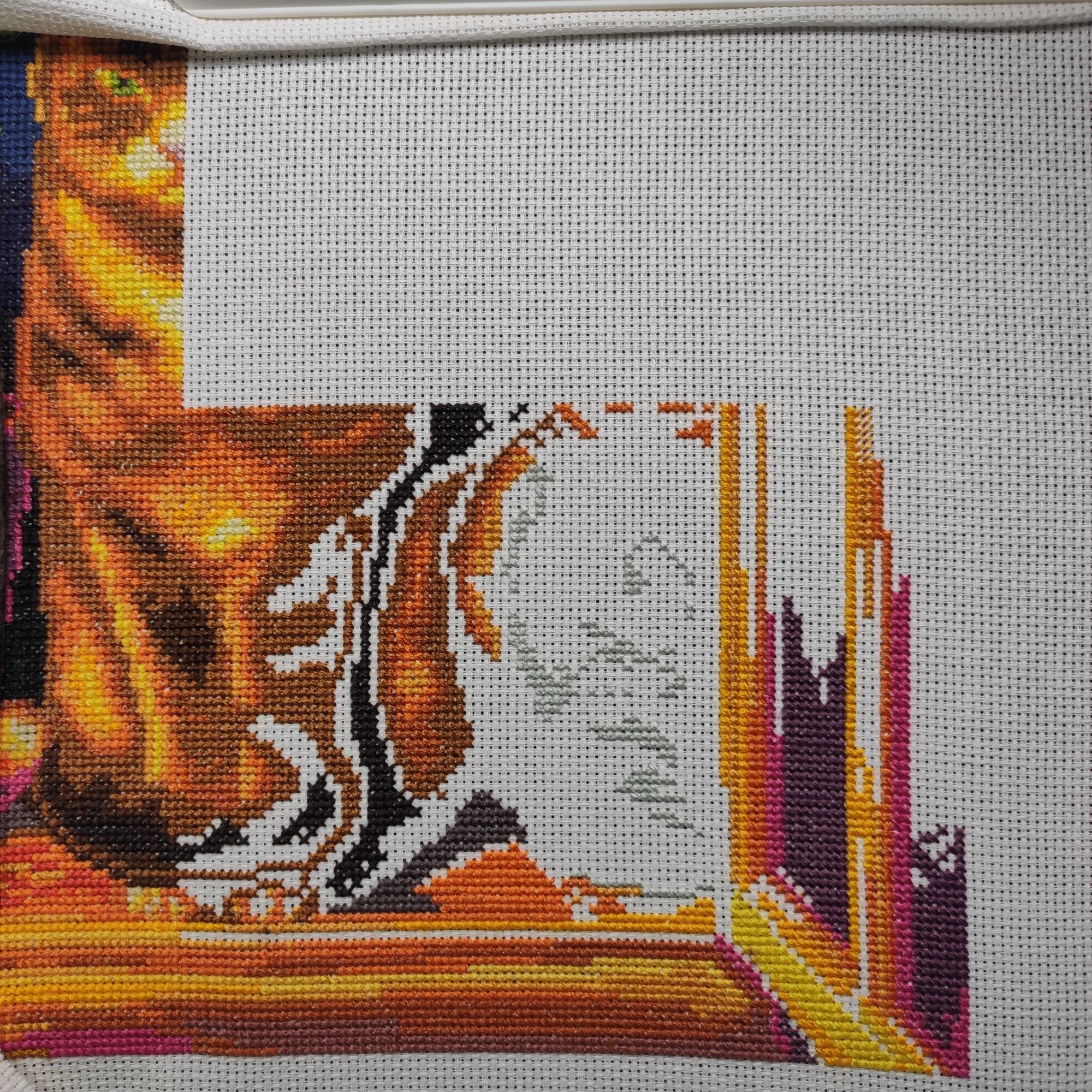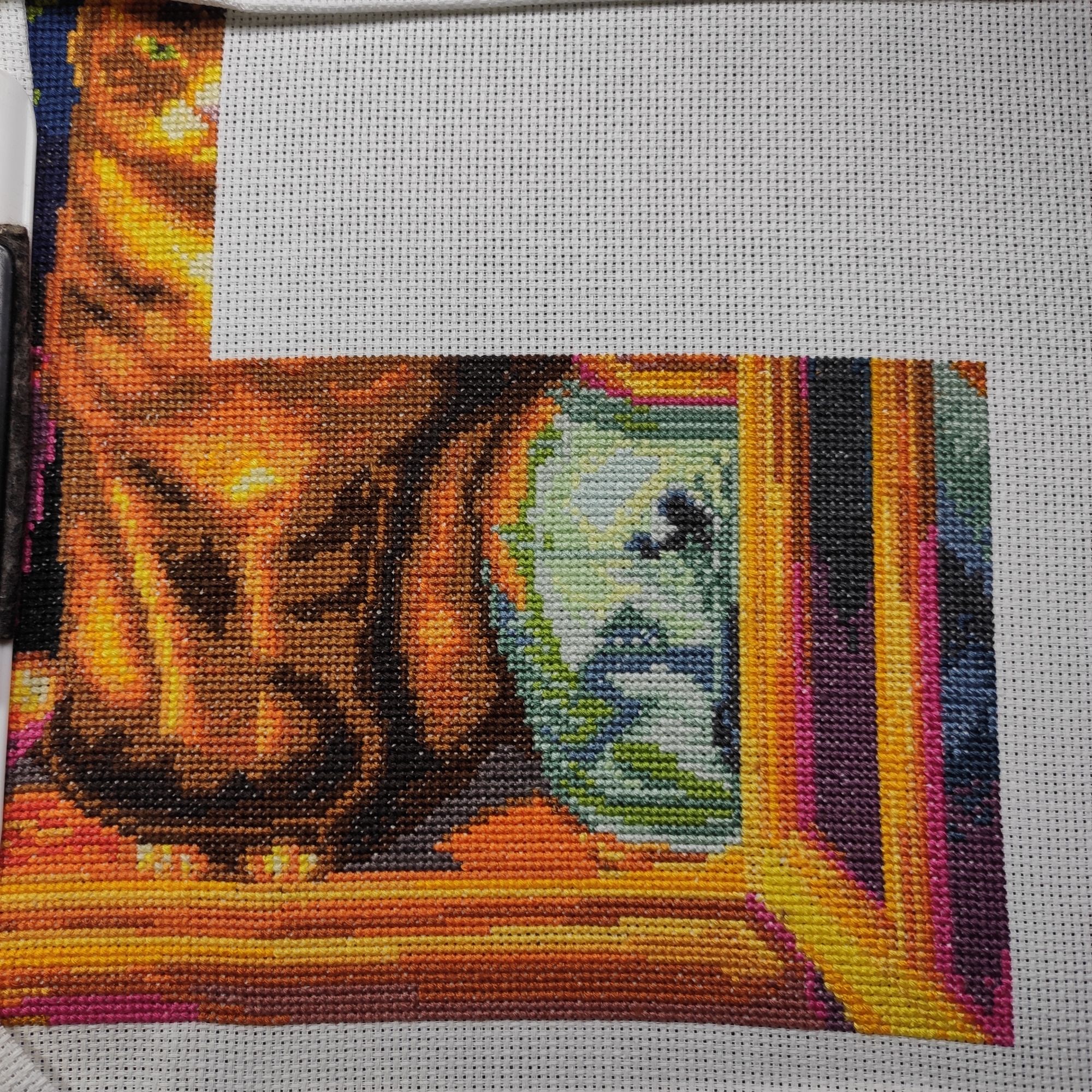 12 ноября 2021 Итоги вышивальных будней). Вкус лета, вышито три листа. Никаких трудностей, даже бэк нравится. Много полукреста в одну и две нитки. Следующий фрагмент будет уже с котиком! Кузя. Остался один лист. Довольно странная цветовая гамма, но мне нравится) немного передохнуть от психоделических оттенков можно на вазе, что я и сделала. Тигр прям очень быстро штопается, несмотря на то, что шерсть (почесываюсь сижу))). После моих риолисовских подсолнухов с тыквами эта схема просто релакс, поэтому отрываться не хочется. На прошлых выходных немного гобелена вышила, работа будет долгая, мелкая основа, нужен хороший яркий свет. Схема очень удобная, крупная, вышивается все в 2 нити. Также на выходных вышила почти половину наших шариков от Панны. Пожадничали с нитками, можно было бы и побольше положить, я нервничаю, когда у меня ниток мало. Голубые используются в полукресте в 3 нитки и в блендах по 2, но их впритык, мне так не нравится. У меня за городом не очень яркая лампа, поэтому фото такие получились. Муня, sunny981, vikkovesh и 19 других сказали спасибо Поделиться сообщением Ссылка на сообщение