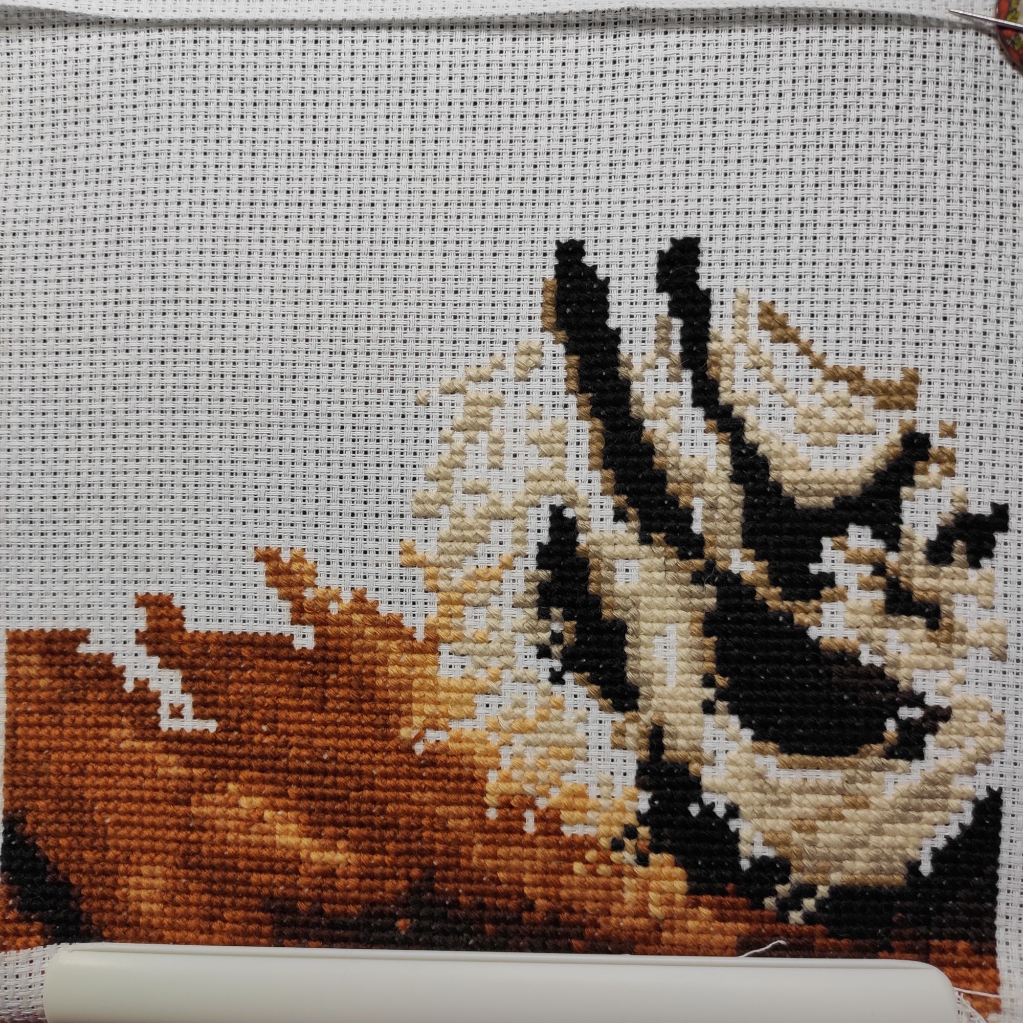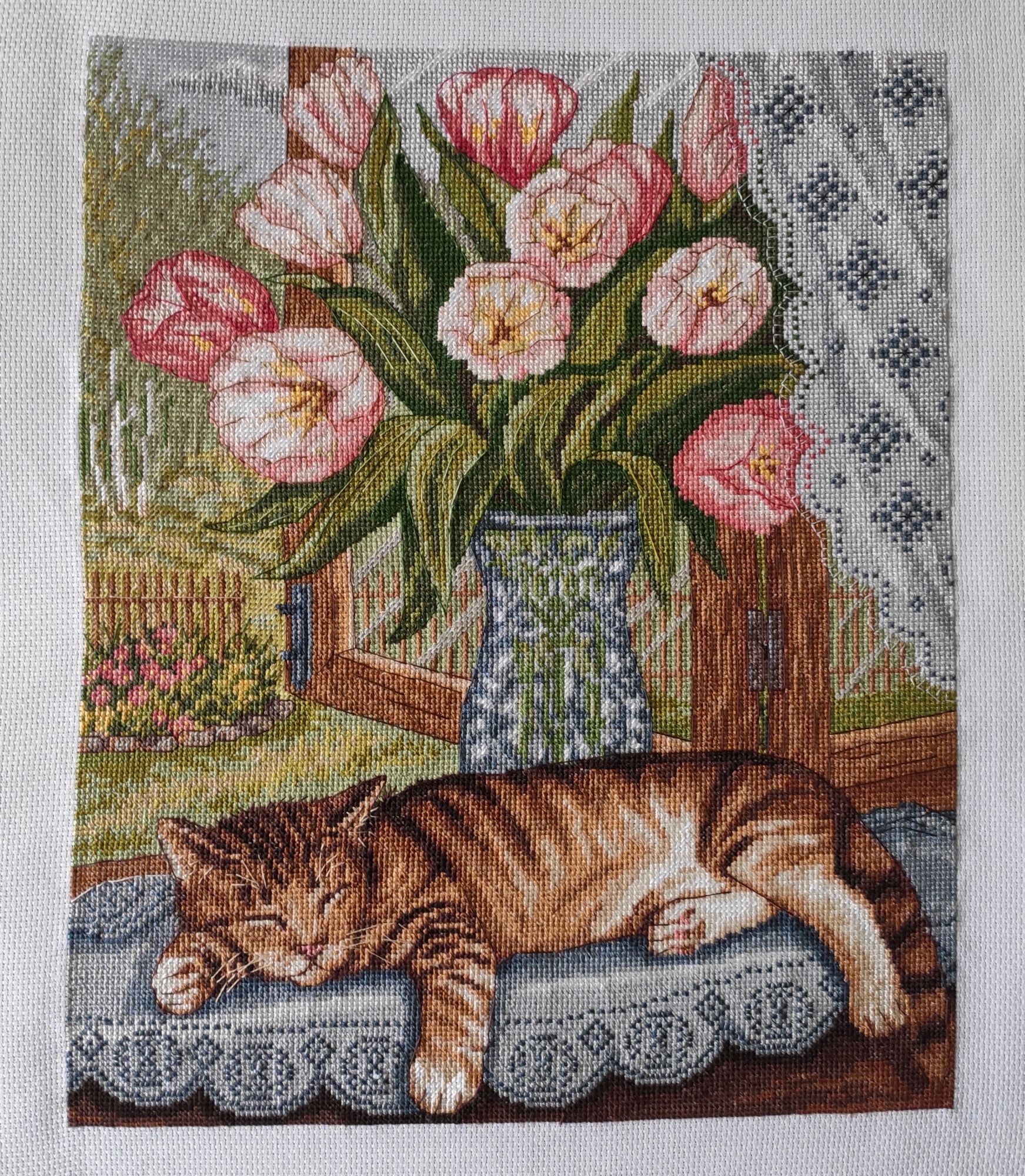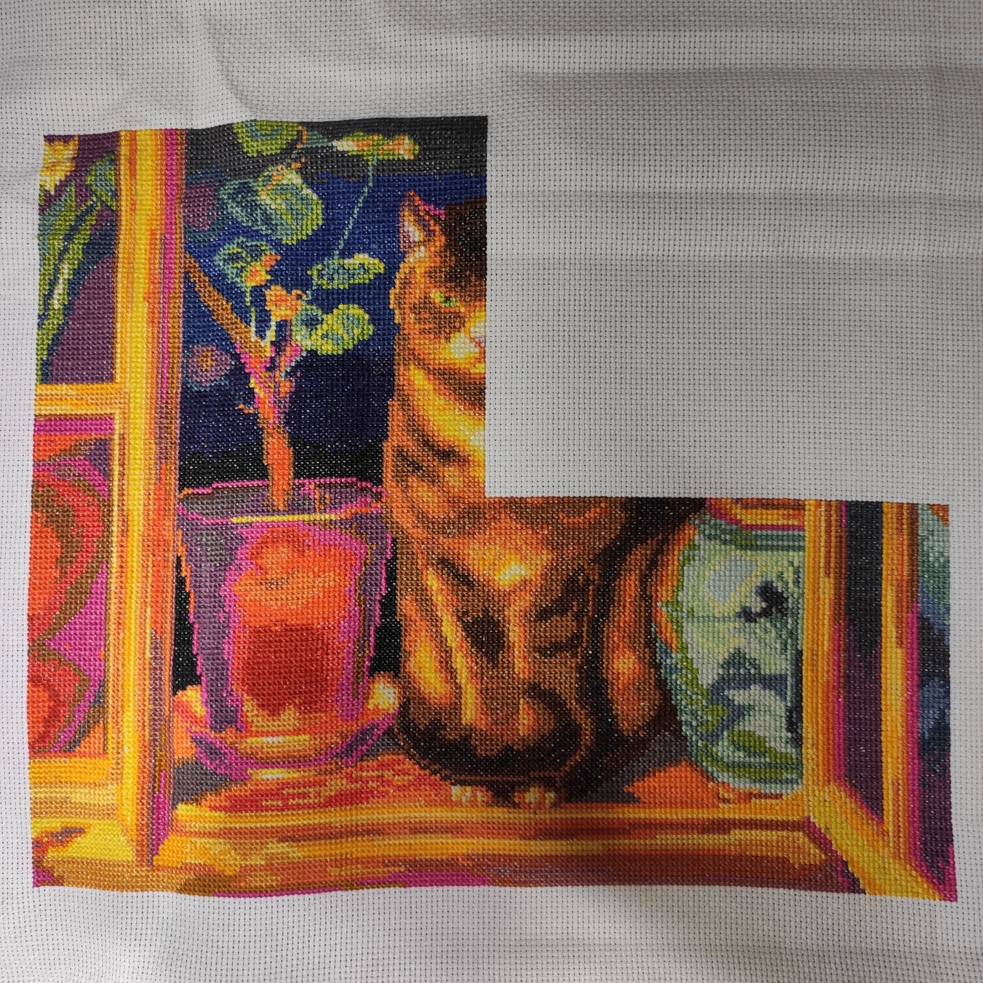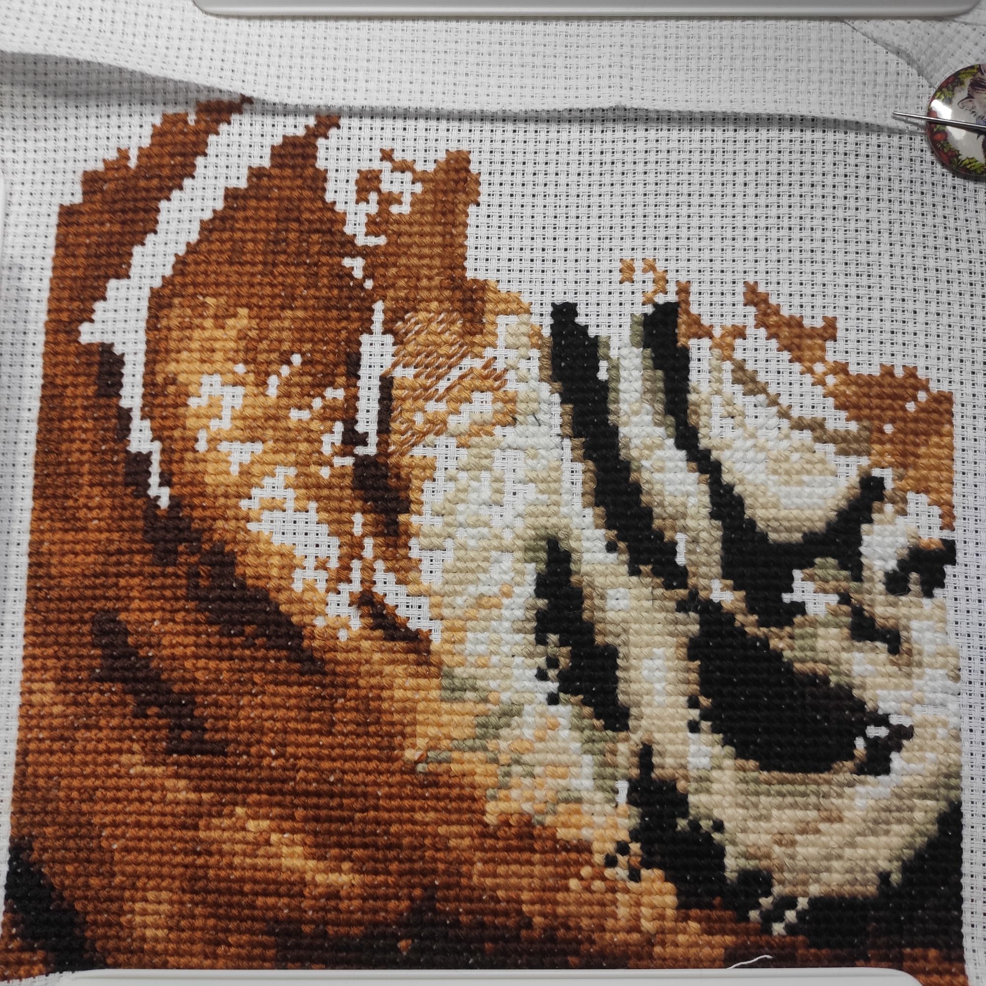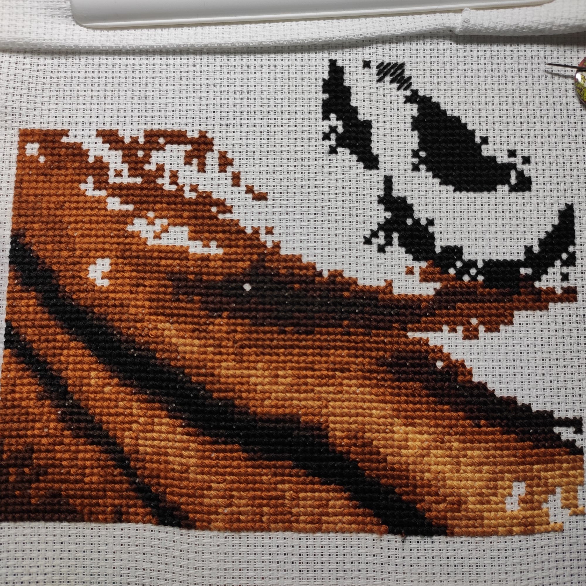 12 ноября 2021 Итоги вышивальных будней). Вкус лета, вышито три листа. Никаких трудностей, даже бэк нравится. Много полукреста в одну и две нитки. Следующий фрагмент будет уже с котиком! Кузя. Остался один лист. Довольно странная цветовая гамма, но мне нравится) немного передохнуть от психоделических оттенков можно на вазе, что я и сделала. Тигр прям очень быстро штопается, несмотря на то, что шерсть (почесываюсь сижу))). После моих риолисовских подсолнухов с тыквами эта схема просто релакс, поэтому отрываться не хочется. На прошлых выходных немного гобелена вышила, работа будет долгая, мелкая основа, нужен хороший яркий свет. Схема очень удобная, крупная, вышивается все в 2 нити. Также на выходных вышила почти половину наших шариков от Панны. Пожадничали с нитками, можно было бы и побольше положить, я нервничаю, когда у меня ниток мало. Голубые используются в полукресте в 3 нитки и в блендах по 2, но их впритык, мне так не нравится. У меня за городом не очень яркая лампа, поэтому фото такие получились. Муня, sunny981, vikkovesh и 19 других сказали спасибо Поделиться сообщением Ссылка на сообщение
