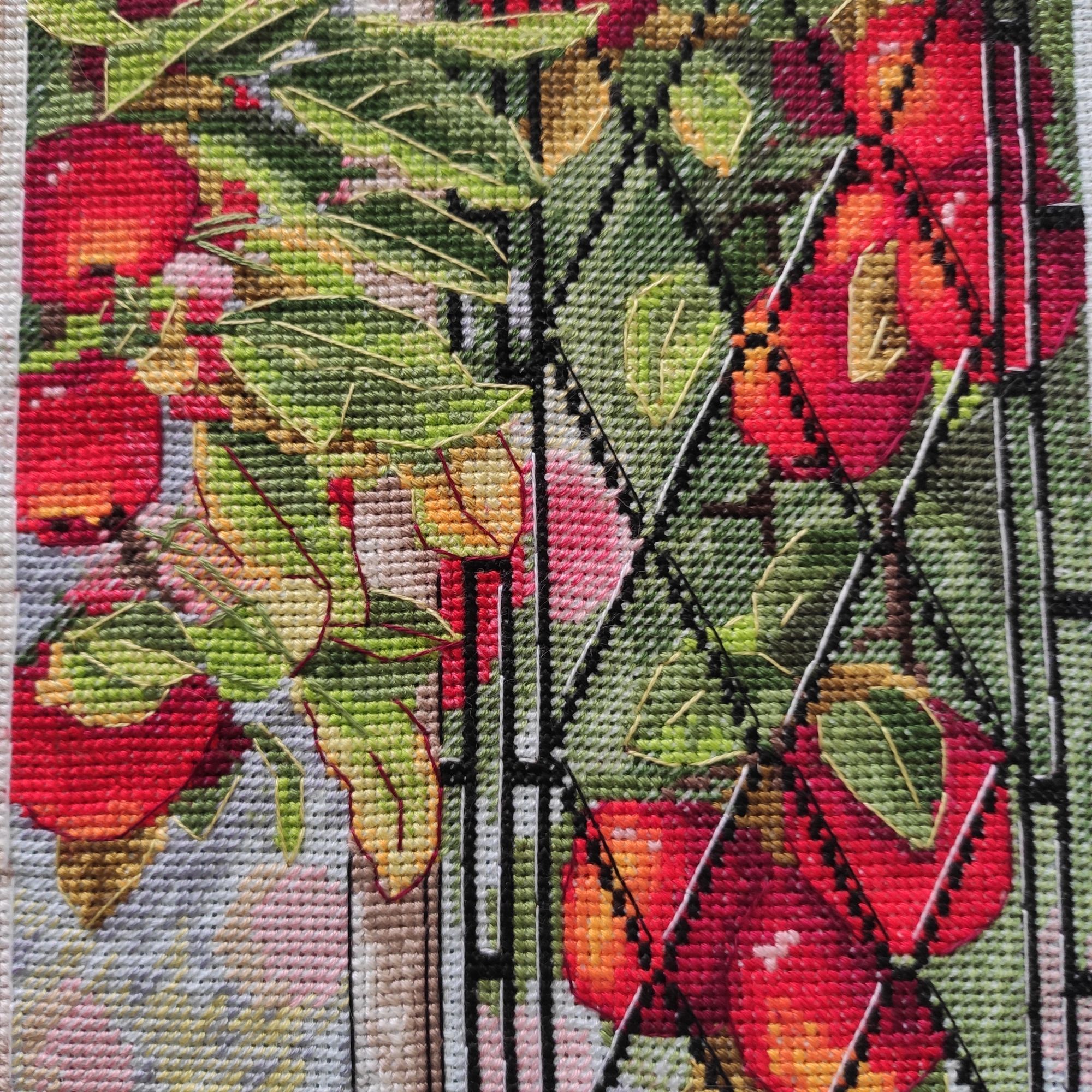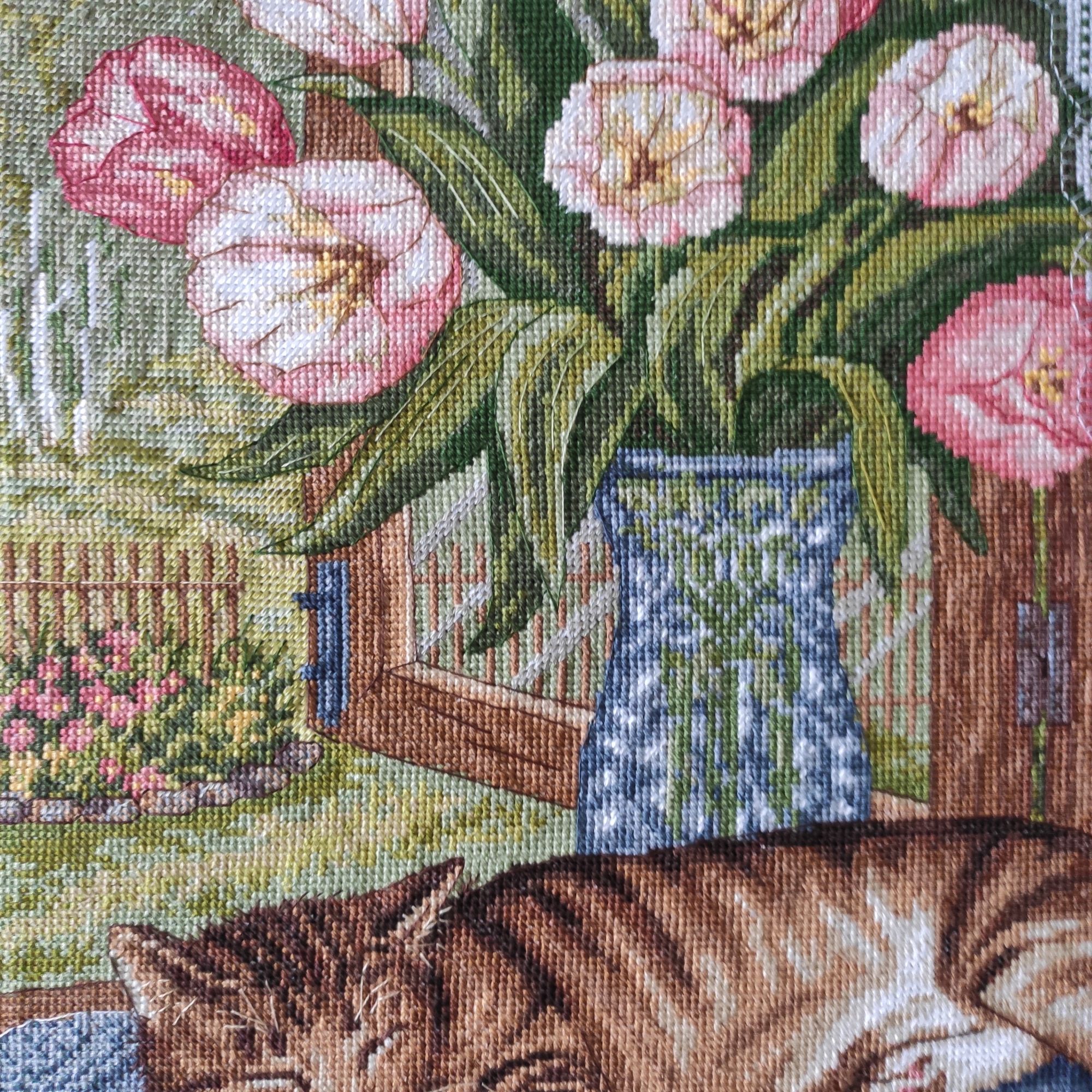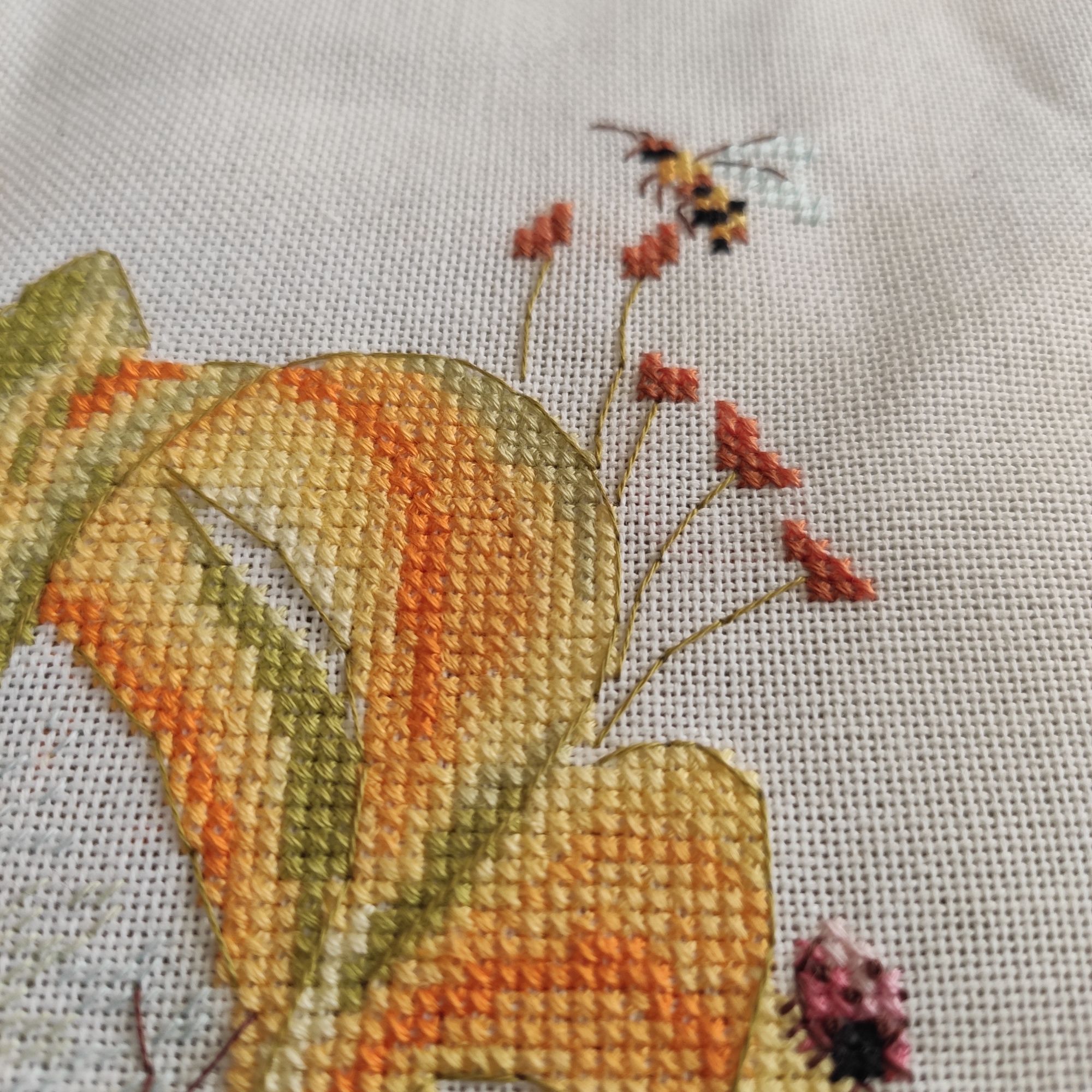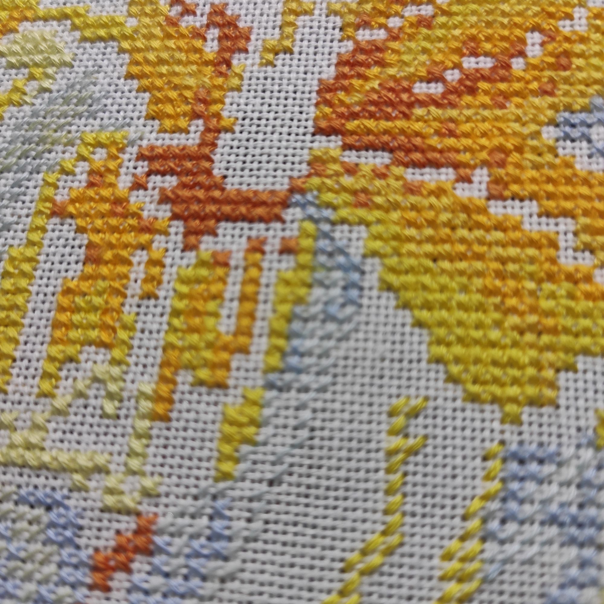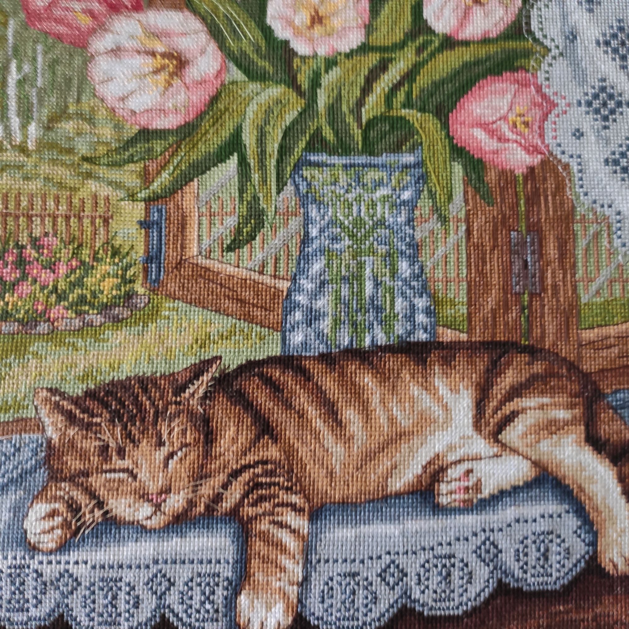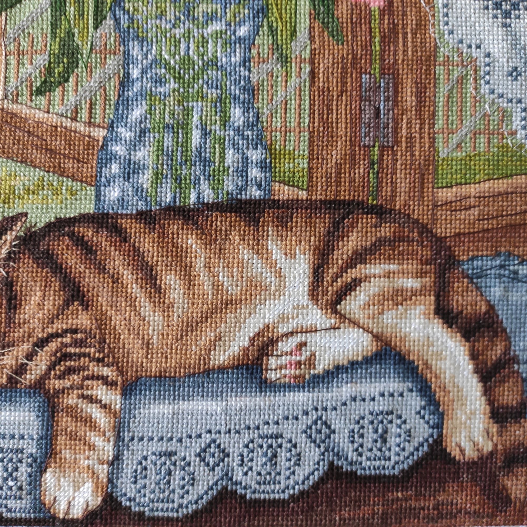 12 ноября 2021 Итоги вышивальных будней). Вкус лета, вышито три листа. Никаких трудностей, даже бэк нравится. Много полукреста в одну и две нитки. Следующий фрагмент будет уже с котиком! Кузя. Остался один лист. Довольно странная цветовая гамма, но мне нравится) немного передохнуть от психоделических оттенков можно на вазе, что я и сделала. Тигр прям очень быстро штопается, несмотря на то, что шерсть (почесываюсь сижу))). После моих риолисовских подсолнухов с тыквами эта схема просто релакс, поэтому отрываться не хочется. На прошлых выходных немного гобелена вышила, работа будет долгая, мелкая основа, нужен хороший яркий свет. Схема очень удобная, крупная, вышивается все в 2 нити. Также на выходных вышила почти половину наших шариков от Панны. Пожадничали с нитками, можно было бы и побольше положить, я нервничаю, когда у меня ниток мало. Голубые используются в полукресте в 3 нитки и в блендах по 2, но их впритык, мне так не нравится. У меня за городом не очень яркая лампа, поэтому фото такие получились. Муня, sunny981, vikkovesh и 19 других сказали спасибо Поделиться сообщением Ссылка на сообщение
