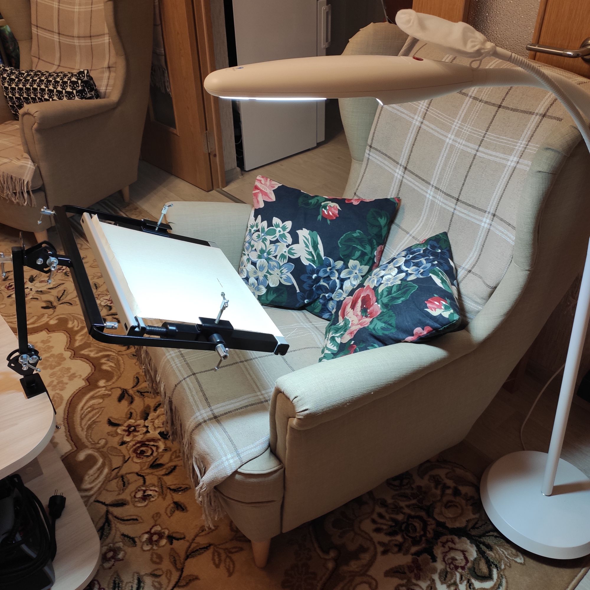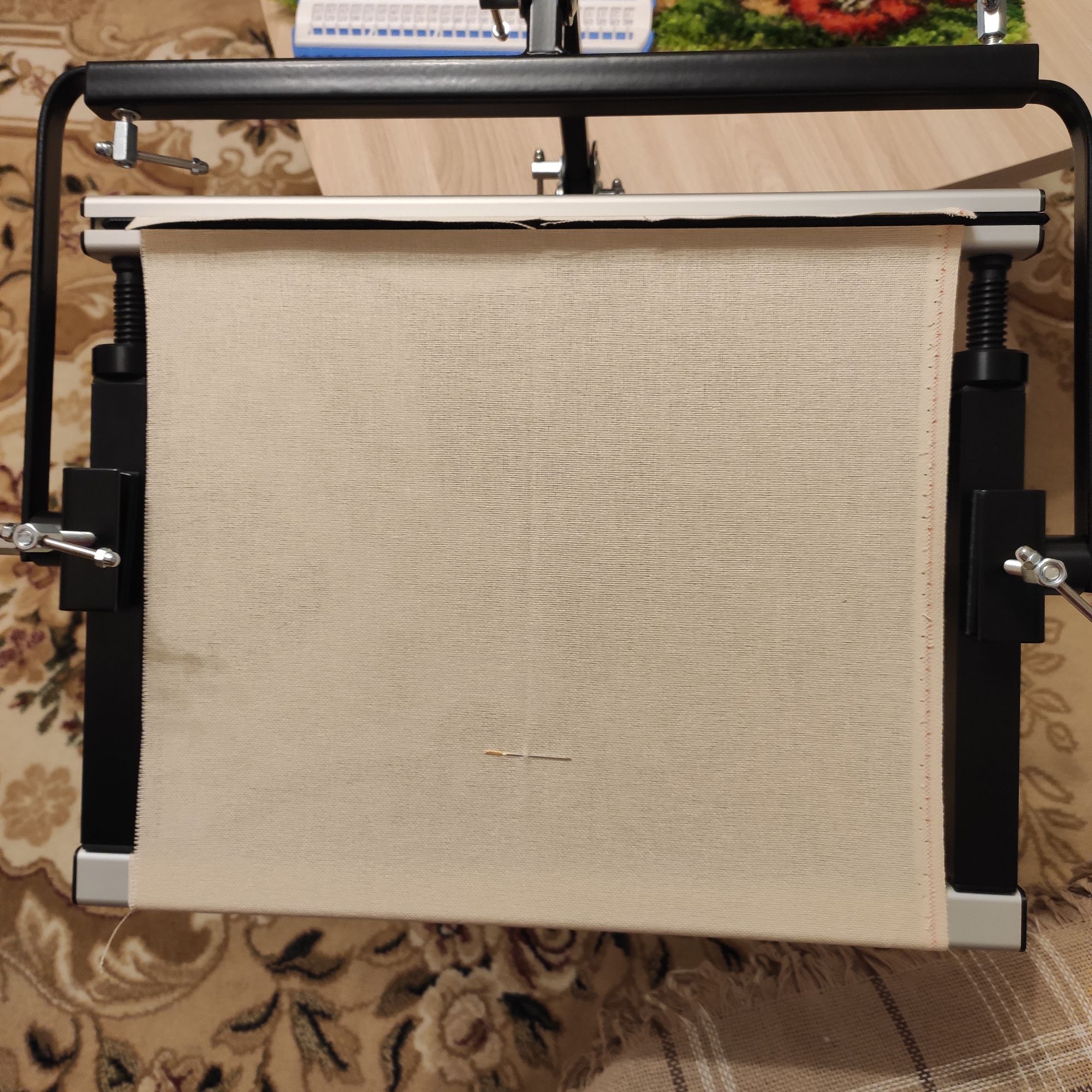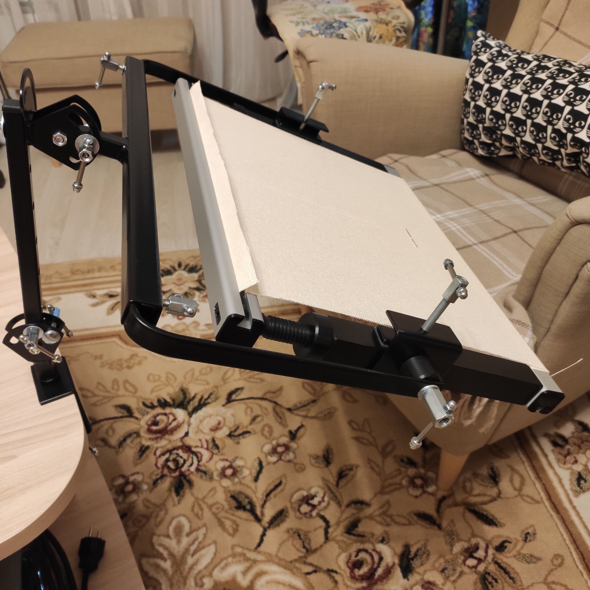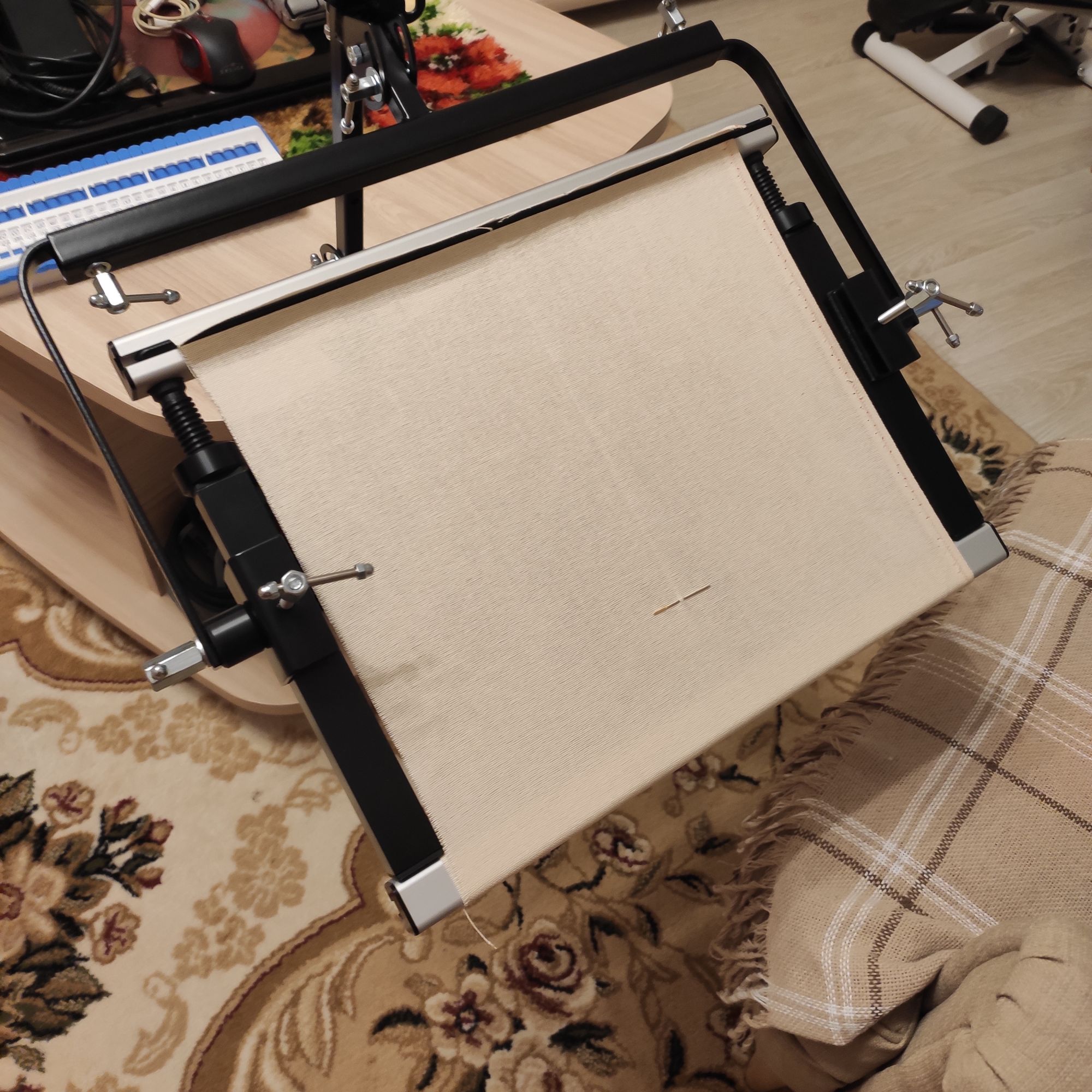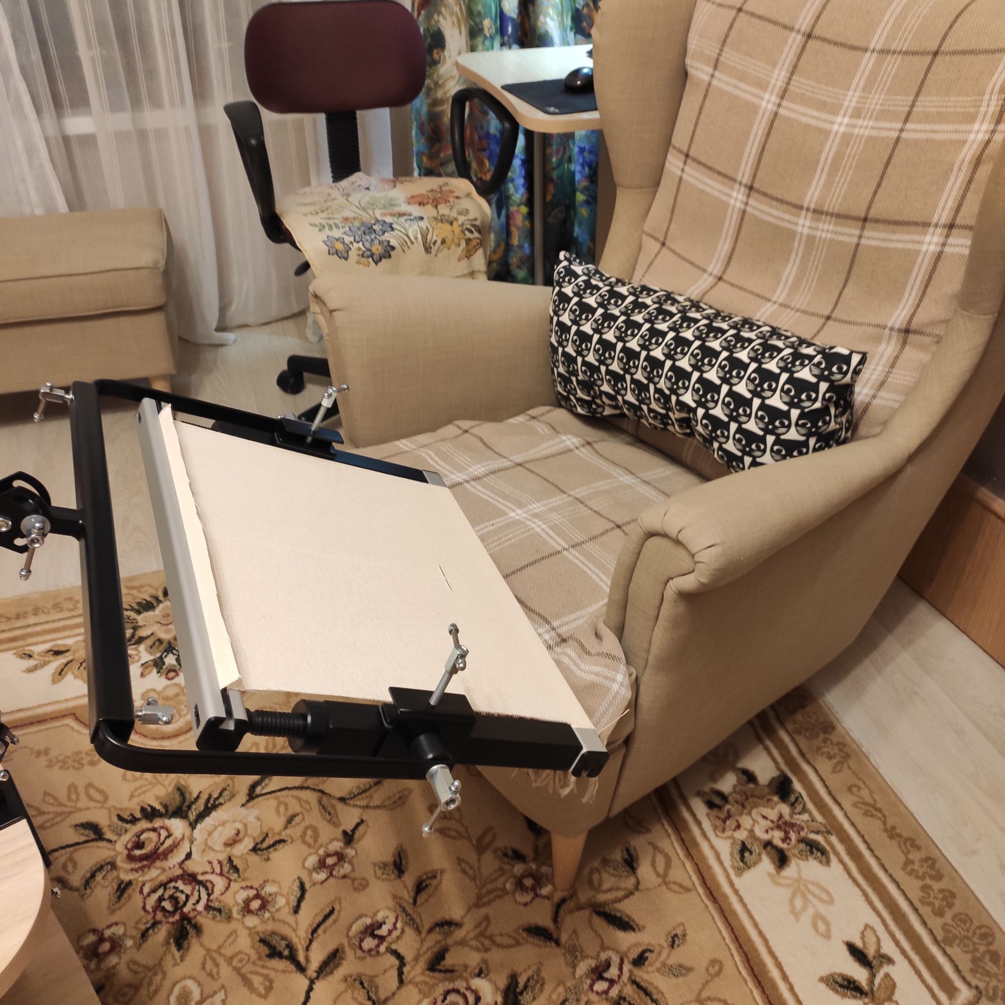 18 февраля 2022 Все привет! Ну наконец-то у меня появилось желание покопаться в своих любимых железках, а заодно оборудовать всё-таки себе рабочее место в удобном кресле муж, правда, тоже постоянно говорит,что как только садишься в кресло, спать охота)) Я решила попробовать-таки свои рамы , рамы у меня ещё старого образца от ЯВышиваю. Хочу попробовать и понять, надо ли мне ещё какой-нибудь размер. Здесь у меня рама небольшая, всего 40 см. Есть ещё 60, но сейчас она мне не нужна, буду пробовать вышивать пока на этой и заодно начну новый процесс, давно хотела). Что я сделала. У меня есть Зея (с ней я езжу в отпуск и она моя любимица именно в поездках). Есть ещё дополнительная палочка (Гудстич делает, называется Журавлик). По сути, журавлик это та же Зея, только длиннее и в ней дырок больше. Сначала я попробовала на Журавлик прицепить раму - неудобно, слишком высоко получилось. Решила попробовать только на Зею. Вообще на нее не рекомендуют вешать рамы, но 40 см нормально. Потому что в итоге Зее приходится держать не только себя ,раму ,но и сам держатель рамы, а он довольно увесистый. Минут 15, пока прикрепила, пока настроила и вот, наконец могу вышивать именно в кресле. А заодно и телик смотреть, потому что он только в одной комнате Щас буду тестировать )) Рама, кстати, огонь. Натяжка барабанная, у меня такой никогда не было. Alina1989, татьяна0674, Дикая белочка и 19 других сказали спасибо Поделиться сообщением Ссылка на сообщение
