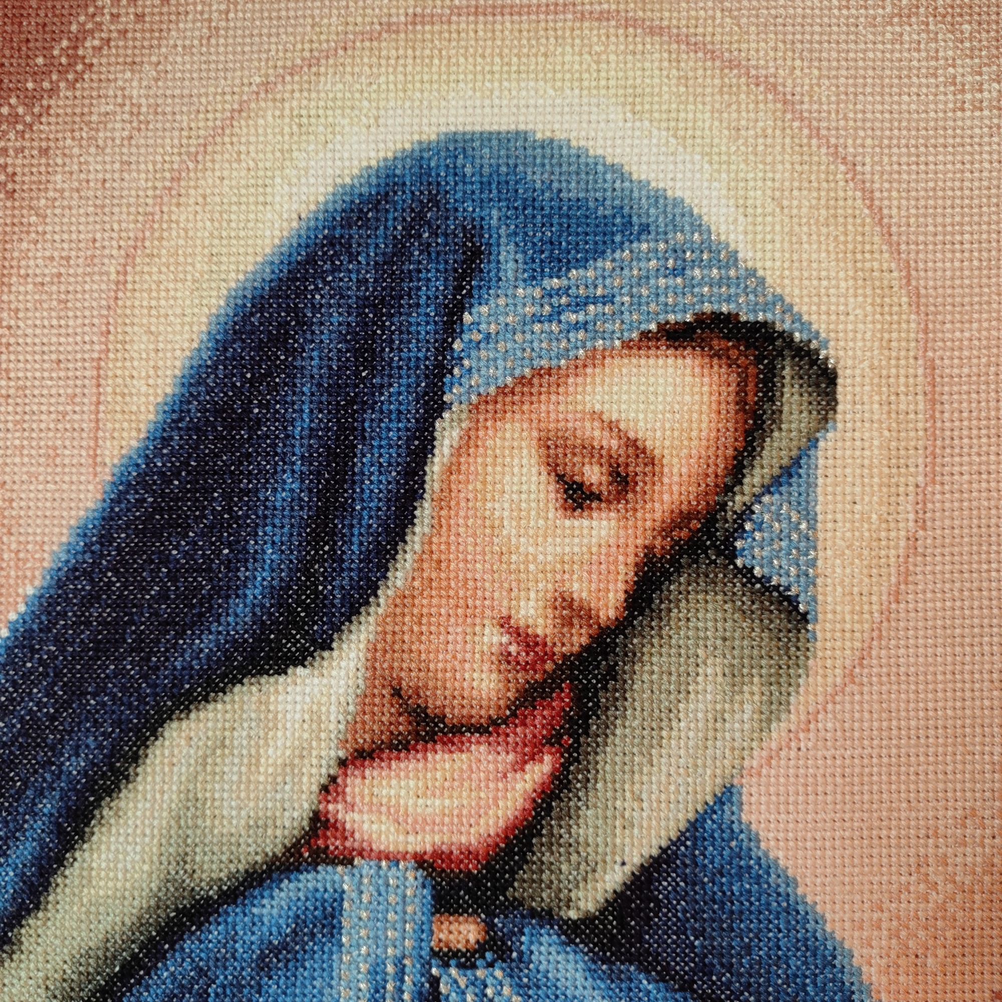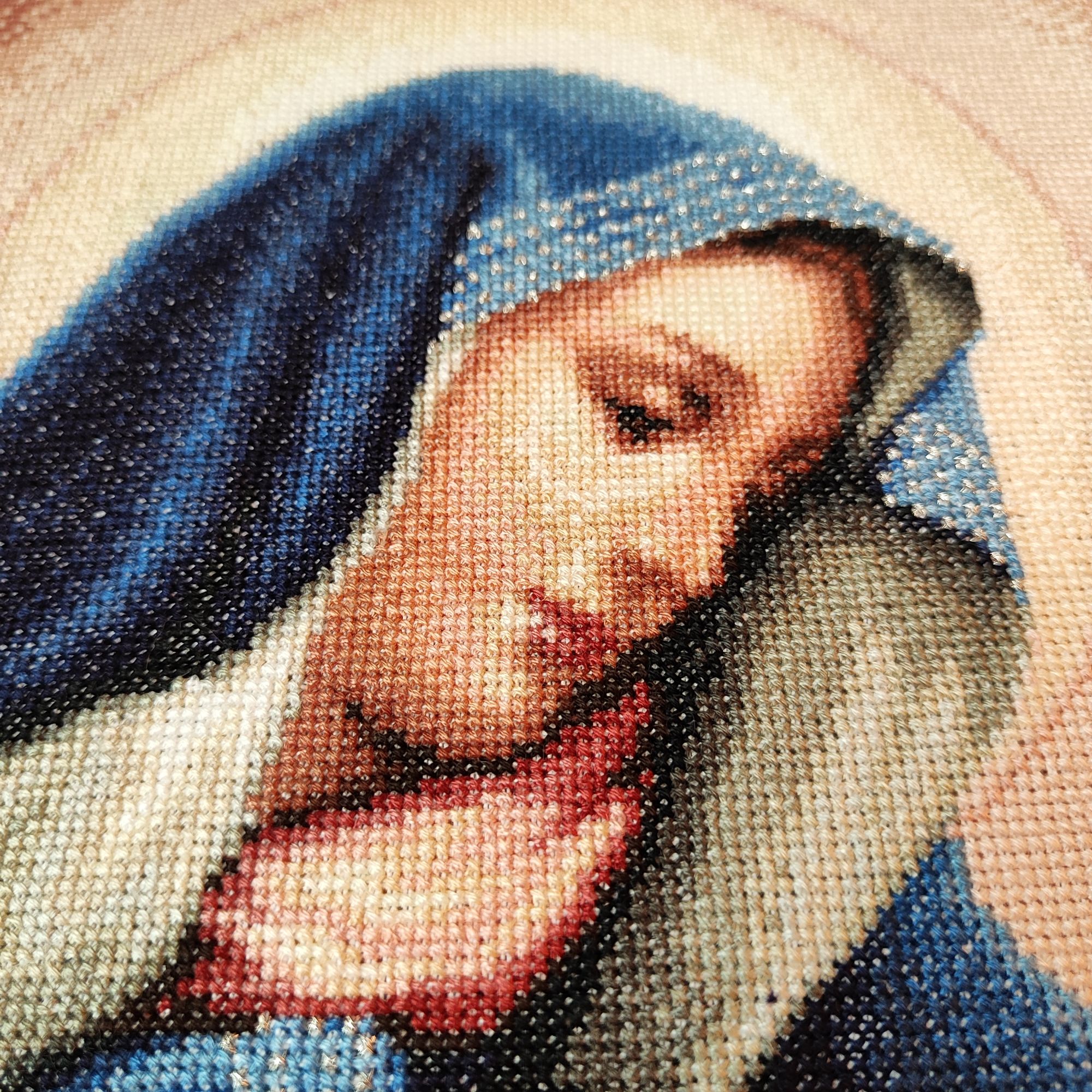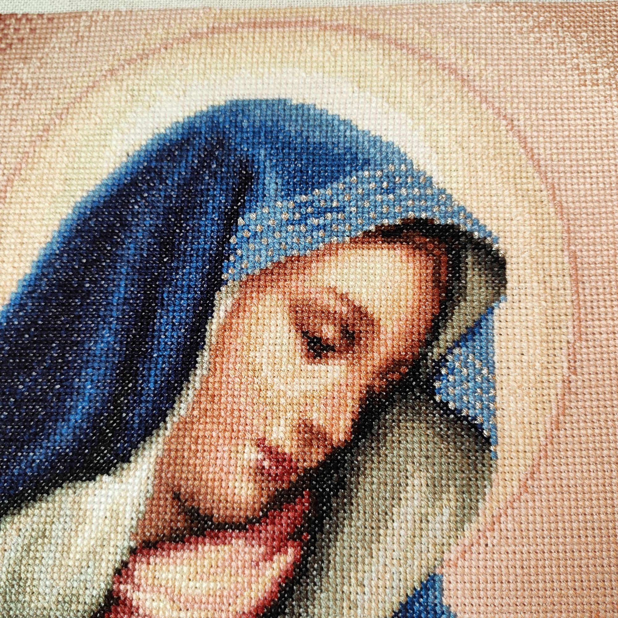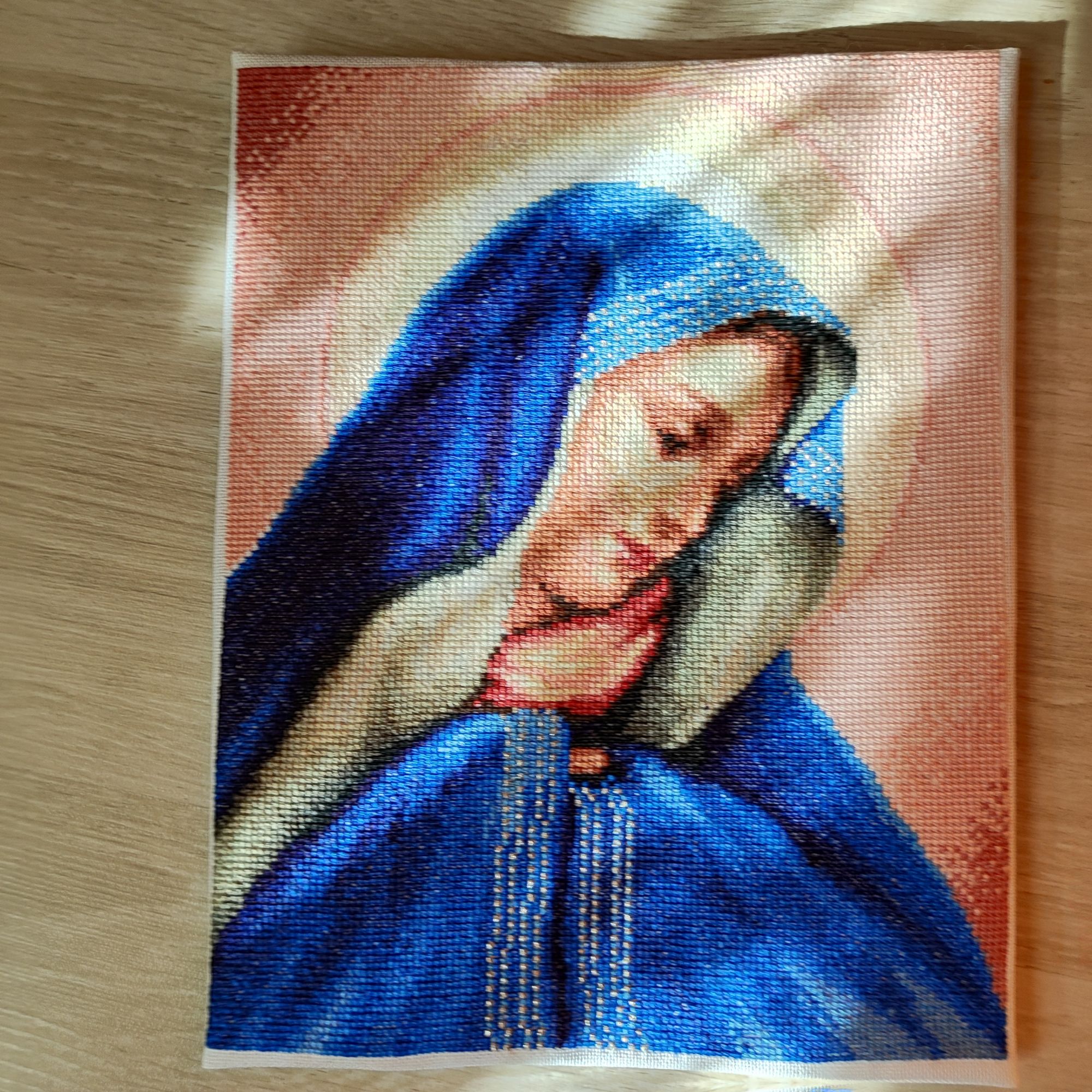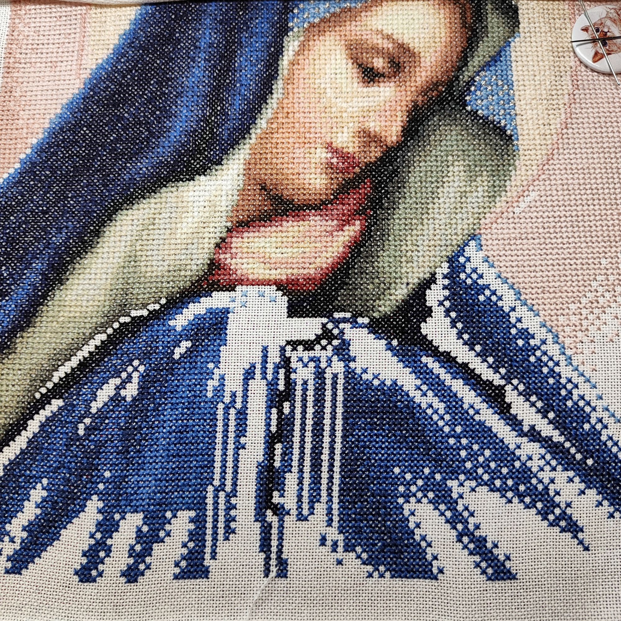 9 октября 2022 Готова моя Мадонна. Вышита в общей сложности за 34 дня.. Схема очень хорошо проработана, похожа на схемы Клейтона, только нет узкокрестиков. Большие участки зашивки одного цвета, хорошо проработано лицо. Я заметила канву на равномерку ,но все равно немного "светит". Канва в наборе 14, и думаю,что также были видны просветы. Но для меня это все некритично,я же не буду на не смотреть впритык) осталось много ниток одного из розовых оттенков и пара синих, некоторых ниток осталось буквально по 2 ниточки, причем я на всякий случай не разбрасывалась ими и старалась более-менее экономно использовать. Работу вышивала с удовольствием и с определенным посылом (не скрою), и когда садилась за неё, ощущала спокойствие. Хочется оформить и не убирать, надеюсь, что полежит она в рулончике недолго,и займет свое место на отдельной полочке. Фро-J, Аленка-2, svetlana62 и 19 других сказали спасибо Поделиться сообщением Ссылка на сообщение