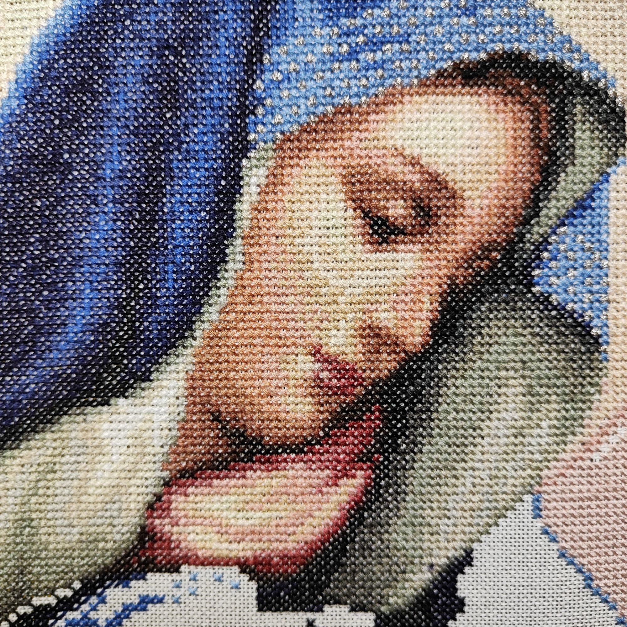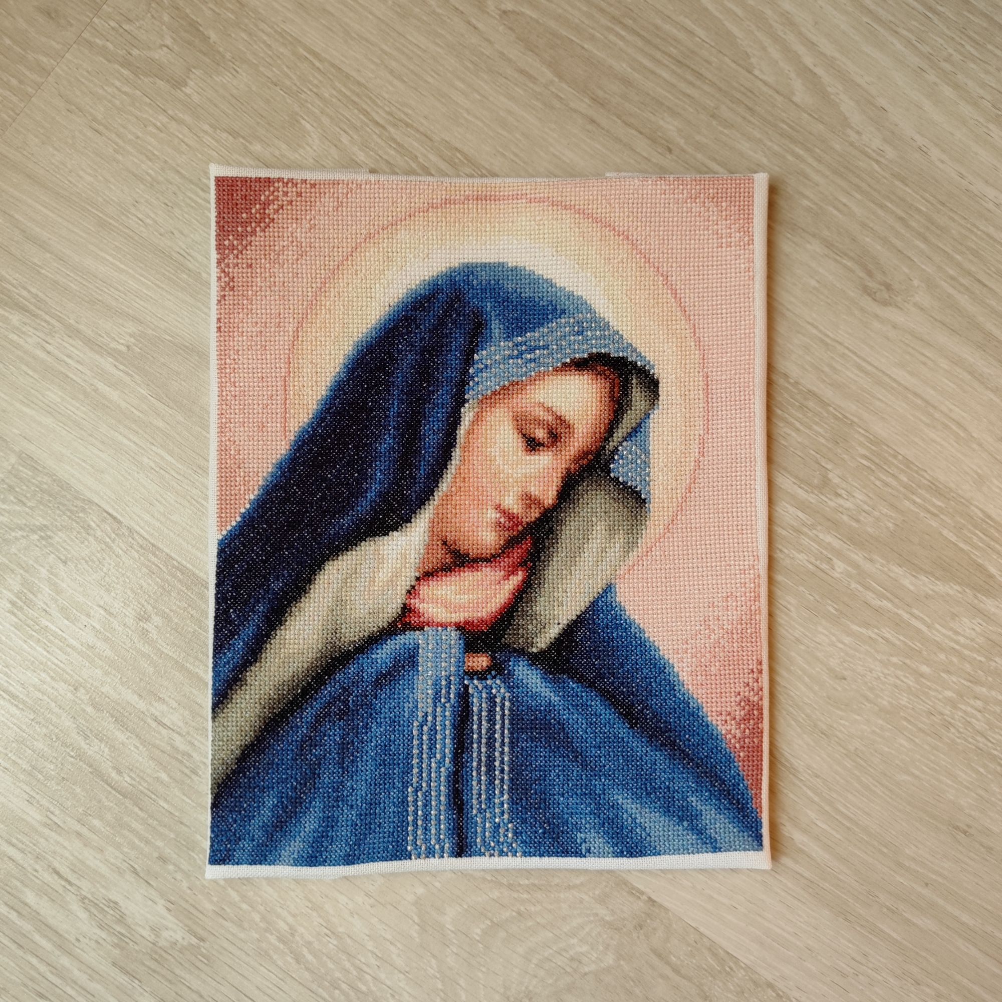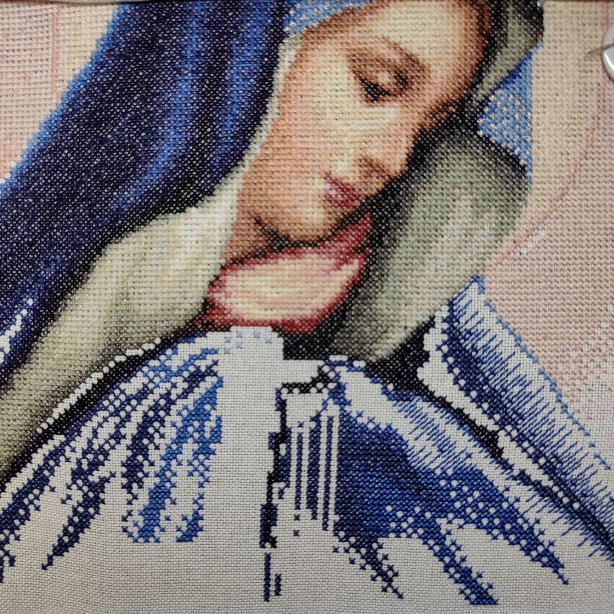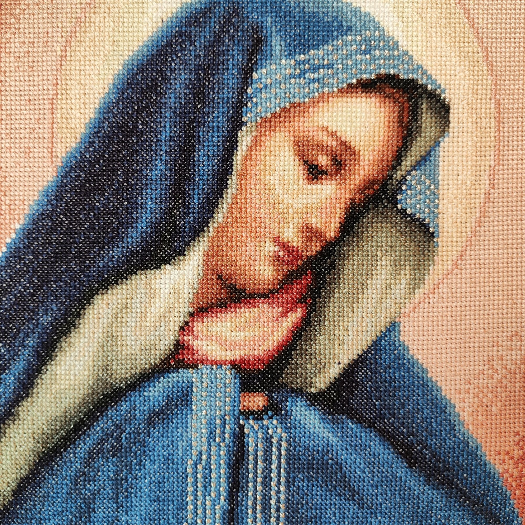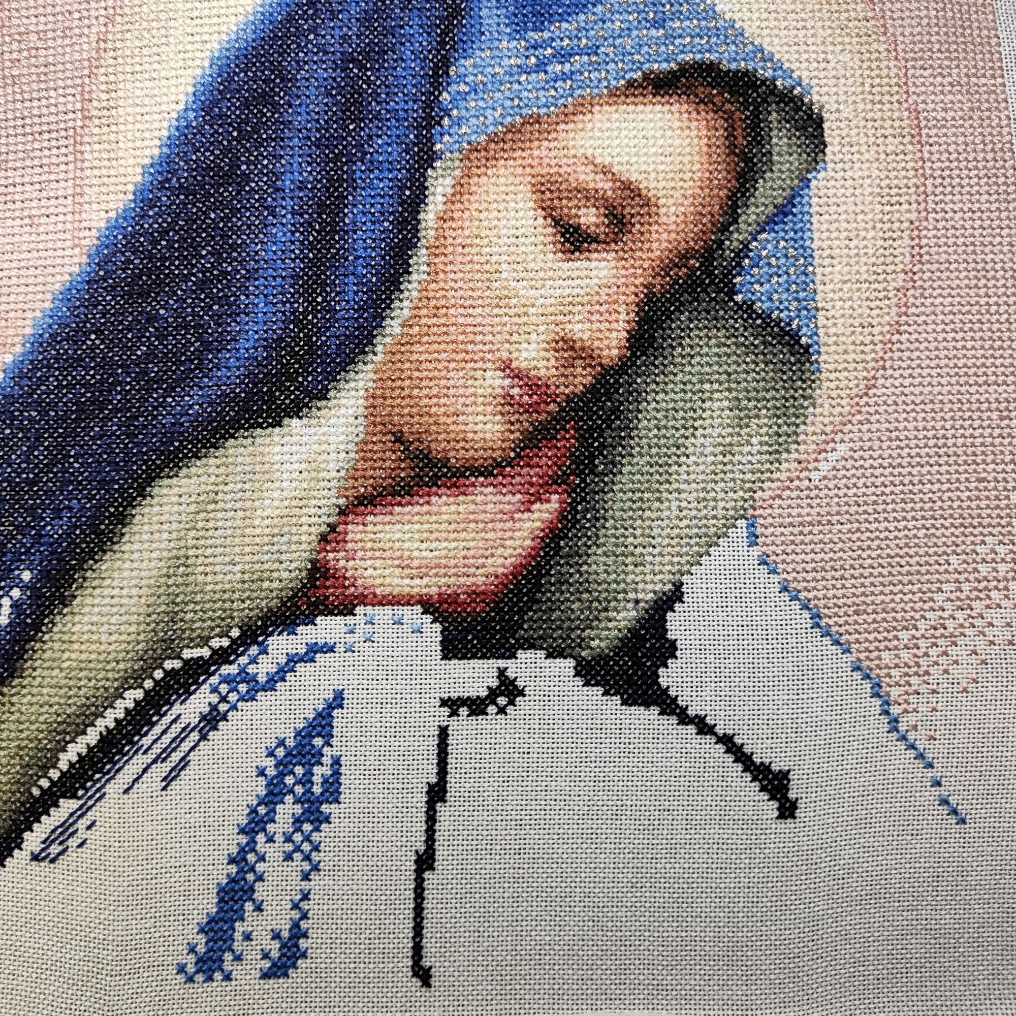 9 октября 2022 Готова моя Мадонна. Вышита в общей сложности за 34 дня.. Схема очень хорошо проработана, похожа на схемы Клейтона, только нет узкокрестиков. Большие участки зашивки одного цвета, хорошо проработано лицо. Я заметила канву на равномерку ,но все равно немного "светит". Канва в наборе 14, и думаю,что также были видны просветы. Но для меня это все некритично,я же не буду на не смотреть впритык) осталось много ниток одного из розовых оттенков и пара синих, некоторых ниток осталось буквально по 2 ниточки, причем я на всякий случай не разбрасывалась ими и старалась более-менее экономно использовать. Работу вышивала с удовольствием и с определенным посылом (не скрою), и когда садилась за неё, ощущала спокойствие. Хочется оформить и не убирать, надеюсь, что полежит она в рулончике недолго,и займет свое место на отдельной полочке. Фро-J, Аленка-2, svetlana62 и 19 других сказали спасибо Поделиться сообщением Ссылка на сообщение