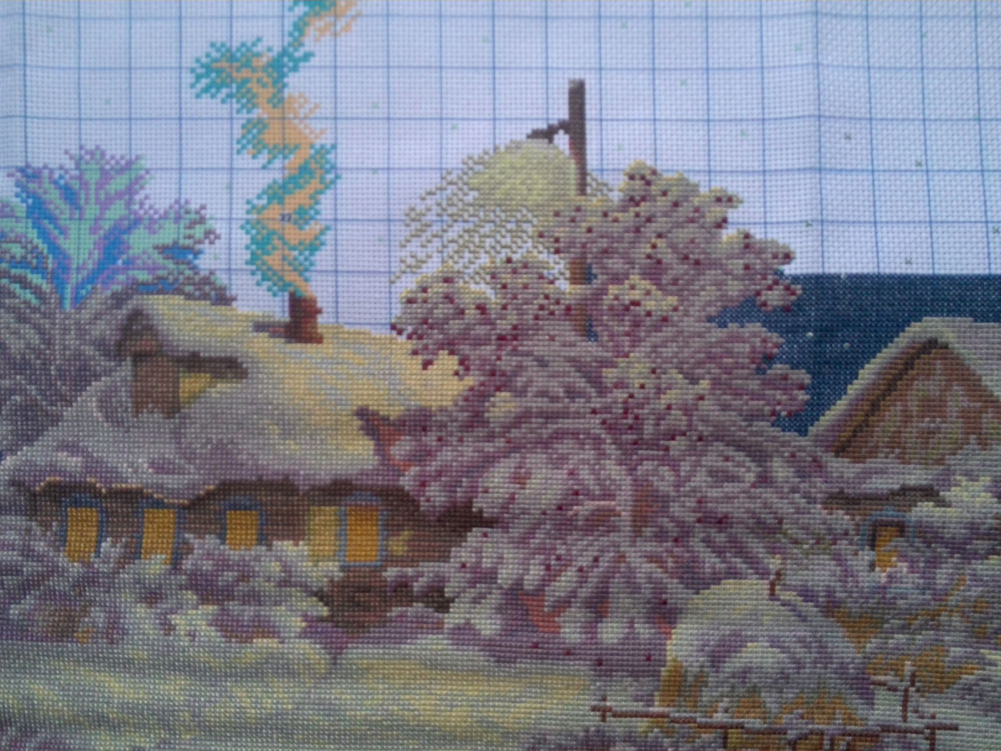 19 января 2020 Фотографии получились темноватые.... солнца нет.... да и мой планшет регулярно начинает дурить... я вышиваю по канве с нанесенной схемой, поэтому на отшитом полотне слегка фонит нанесенная схема, цвет нанесенного рисунка не всегда совпадает с отшитым цветом мулине. Бэка много, бэк еще не делала. Небо зашиваю остатками от других наборов, цвет близкий (почти он) ДМС 3750 ( антик темно синий), звезды на небе - серебристый металлик. Фрузелки на рябине не делала, просто зашила крестиком соответствующего цвета. Вышиваю без пялец, скручивая в рулон, поэтому на отшиве видны волны от скручивания... На данный момент проблема в следующем : я вышила столб, цвет от фонаря по схеме.... Я не знаю, как зашить фрагмент вышивки от фонаря до крыши дома.... Какими цветами мулине зашить этот фрагмент???.... Как свет от фонаря должен дойти до крыши дома???..... Поделиться сообщением Ссылка на сообщение
