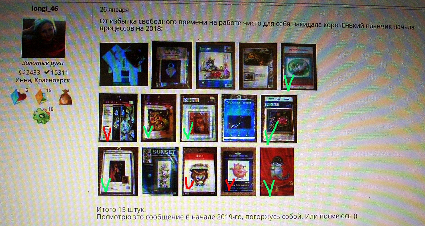 13 января 2019 Девочки, всем горячий воскресный привет! Я пришла подводить итоги своего вышивального 2018-го Буду щас беззастенчиво хвастаться и нагло себя хвалить Исполнилось 2 года, как я сижу на крестиках (вот время летит!), перестаю чувствовать себя начинающей. В этом году я освоила равномерку и бисер, осилила первую большую работу на черной канве, научилась более-менее прилично шить без разметки и полюбила турецкие пяльца, что сделало процесс более мобильным - я теперь даже машину мыть езжу с вышивкой! В январе я составляла примерный списочек из 16 пунктов, которые планировала начать: Из этих 16 начато было всего 9 (с зелеными галочками), а из этих 9-ти полностью готовы 3 (с красными галочками). Статистика, может, и не самая офигенная, но!!! Сверх плана я начала еще 18 процессов, итого 27 новых процессов за год! И на конец года имею 17 готовых работ! Вот моя вышивальная кучка тщеславия за 2018 )) Плюс подаренная маме Умиление Плюс забытый у нее же новогодний Кабанчик Тут идут аплодисменты, переходящие в овации......... Еще я в этом году оформила целых 7 работ - 1 сама и 6 в багетках! Первый раз переделала брак, первый раз поругалась с багеткой из-за того, что про мою работу вообще забыли и т.п... Будет что вспомнить )) А еще большим достижением этого года считаю обуздание хомяка! )) Я всего 3 раза за год делала заказы, причем искала уже конкретные наборчики. Скупила их всех и успокоилась. Правда был еще жуткий летний всплеск по ножничкам -маячкам-магнитикам, но я его списываю на тлетворное влияние красноярских вышивальщиц )) Знакомство с которыми считаю тоже одним из самых больших везений этого года Кто угадает, какие ножички чаще всего тырят мои котики - тот молодец! )) Из грустного - одна старая дура на работе не смогла пережить моих горящих глаз, нажаловалась генеральному и мне заблокировали Стич ((( Дома не получается столько времени сидеть в интернете, поэтому круг общения на форуме резко сузился, некогда сейчас узнавать новых интересных вышивальщиц, успеть пробежаться бы по знакомым темам. Очень жаль ((( Но пока так ((( Наверно, на этом пока все. Когда-нибудь стану старой мудрой перечницей, которая презирает аиду и выдает каждый год по голдену, перечитаю свой отчетик и посмеюсь )) А планы на 2019 пока строятся Всем тьмок! TheSunniestDay, titania, ALT и 17 других сказали спасибо Поделиться сообщением Ссылка на сообщение