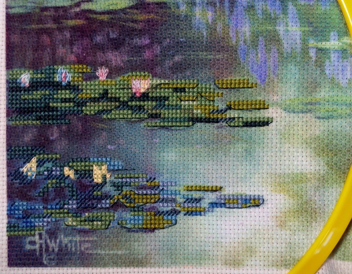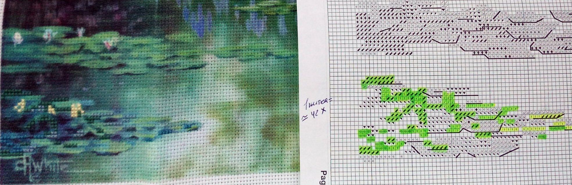 21 октября 2018 Раскопала еще один долгострой с 2009 года. Девочки, в гаечке уже есть! Только фото "стало" нужно добавить. Итак, Кандамар Дизайн "Японский мостик Монэ" Вот что было вышито за один день в 2009 году: Вот это наковыряла за два дня: Стало: Проблема, из-за которой я тогда забросила этот процесс в том, что схема вообще не соответствует тем цветовым пятнам, которые есть на канве: Через силу поковыряла и забросила. Думала вообще не буду заканчивать. Правда, теперь совесть замучила из-за того, что в гаечке процесс есть, но никуда не движется. Решила подвинуть. Подумала, что надо проявить творческий подход и шить примерно подходящие по цвету пятна, невзирая на схему. Нитки беру по ключу и творю! ))) Надолго меня не хватает. Все-таки удручает полное непонимание, как и куда двигаться. Все исключительно наощупь. В моем наборе еще один прикол. Ниток зеленых цветов на два больше, чем в ключе! Значков на всех не хватило. )))) Один из них я вижу на глаз на фото с обложки набора, а вот второй сегодня применяла чисто творчески, т.к. непонятно, где его планировал применить производитель. А, да! Еще пришлось творчески оббэкать лилии, т.к. иначе это просто непонятные розовые и голубые пятна. На схеме для них бэка нет. sette venerdi, Ксен40, maui и 8 других сказали спасибо Поделиться сообщением Ссылка на сообщение