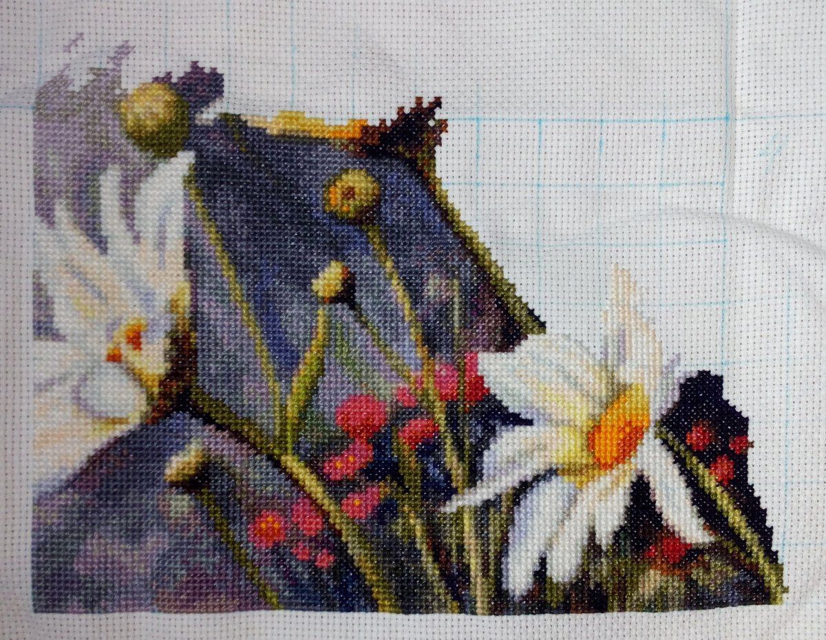 6 июля 2019 19 часов назад, almmatea сказал(а): А еще который отчет любуюсь травой в дизайне с лошадкой, даже схему такую откопала) Спасибо, Мария! Лошадка очень милая! Недавно искала отшивы по этой схеме, но там почему-то оказалась какая-то блеклая эта трава. То ли с цветопередачей что-то не то, то ли с ключом. Но я цвета брала по ключу, сверял с живой картой DMC. Думаю, что это "у них" что-то не то. Смущало, конечно, что фон между листьями такой темный, но решила довериться автору. А сейчас вижу, что так ярко выделяются эти камыши - прелесть! Вообще, нравятся схемы этого дизайнера. В будущем еще что-нибудь вышью. У нее классные животные! Домик, наверное, возьму прямо сейчас. Руки так и чешутся вышить хотя бы еще один лист! У Ромашек самым сложным был левый нижний угол, с которого я начала. Ни одну нить не удавалось дошить даже до середины. Вот: Когда начались ромашки, схема хотя бы стала осмысленной. Но 70 цветов - это не шутки! Напоминает Кастом Крафтс, но там 40-50 цветов. Так что, можешь представить. Приложила кусочек схемы из правой части, где уже есть ромашки (левую почеркала и выбросила уже). almmatea, Ксен40, maui и 7 других сказали спасибо Поделиться сообщением Ссылка на сообщение