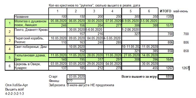 15 августа 2020 Девочки, все фото из этого сообщения НЕ для гаечки! Хочу подвести итоги своей не особо-то удавшейся игры. Май я хотела сделать месяцем продвижений и затеяла Процессный бой (идея стырена у Лили Сплошные крестики). Выбрала шесть процессов, некоторые из которых застряли: Начала бросать кубик и выполнять выпавшие задания. Сначала дело пошло хорошо и две недели я играла даже с каким-то азартом. Крестики на работах прибавлялись и это не могло не радовать! Пиратский корабль, Риолис: Церковь в Овере, Куадрос: Тюльпановая драма, Дим: Тут даже в какой-то момент забыла сфотографировать и выполнила два задания. Свет побережья, вроде бы тоже старый Дим - Сансэт: Пинто, Джанетт Крювз Дизайн: Молитва о душевном покое, Амишоп (копия Дима, давно снятого с производства): Потом - притормозилась и стала отвлекаться. Находила другие дела и не спешила взять в руки вышивку. А еще позже и вовсе пришлось себя заставлять. Решила сделать перерыв на месяц и позже вернуться к игре. Но вот уже середина августа, а желания продолжать так и нет. Вот, на чем я тогда остановилась: В общем, на этом ставлю точку и буду считать эксперимент провалившимся. Для себя сделала вывод, что жесткий рандом, указывающий конкретный процесс - это не для меня. Да и подсчет крестиков вымораживает! И еще один вывод: те работы, которые мне нравятся, шли легко и я делала на них больше, иногда просто выполняла сразу два задания и не очень-то хотелось отрываться. А те, которые и так еле-еле тянулись, так и не стали идти лучше. Я там вымучивала каждый крестик, лишь бы только уложиться в норму. Попыталась было влиться в игру "Вышить всё!" у Оли ХоббиАрт, но поняла, что процессы в руки не идут. Забавно, что у меня цифра 4 тоже выпадала часто! А цифры, обозначавшие не сильно желанные процессы, выпадали реже. Кстати, у Оли выпали как раз те цифры заданий, которые шли у меня хуже всего. Но делать я их всё равно не стала. Три недели игры в 100500 пока показывают положительную динамику. Там больше возможности для маневра и нет обязанности выполнить задание. В общем, выходит, мне нужен только небольшой элемент неожиданности, а не четкие задания. В таком случае у меня хоть что-то получается. Буду надеяться, что нашла свой тип игры. Но, конечно, время всё расставит по своим местам. Tari, Аментет, Kattrielle и 10 других сказали спасибо Поделиться сообщением Ссылка на сообщение
