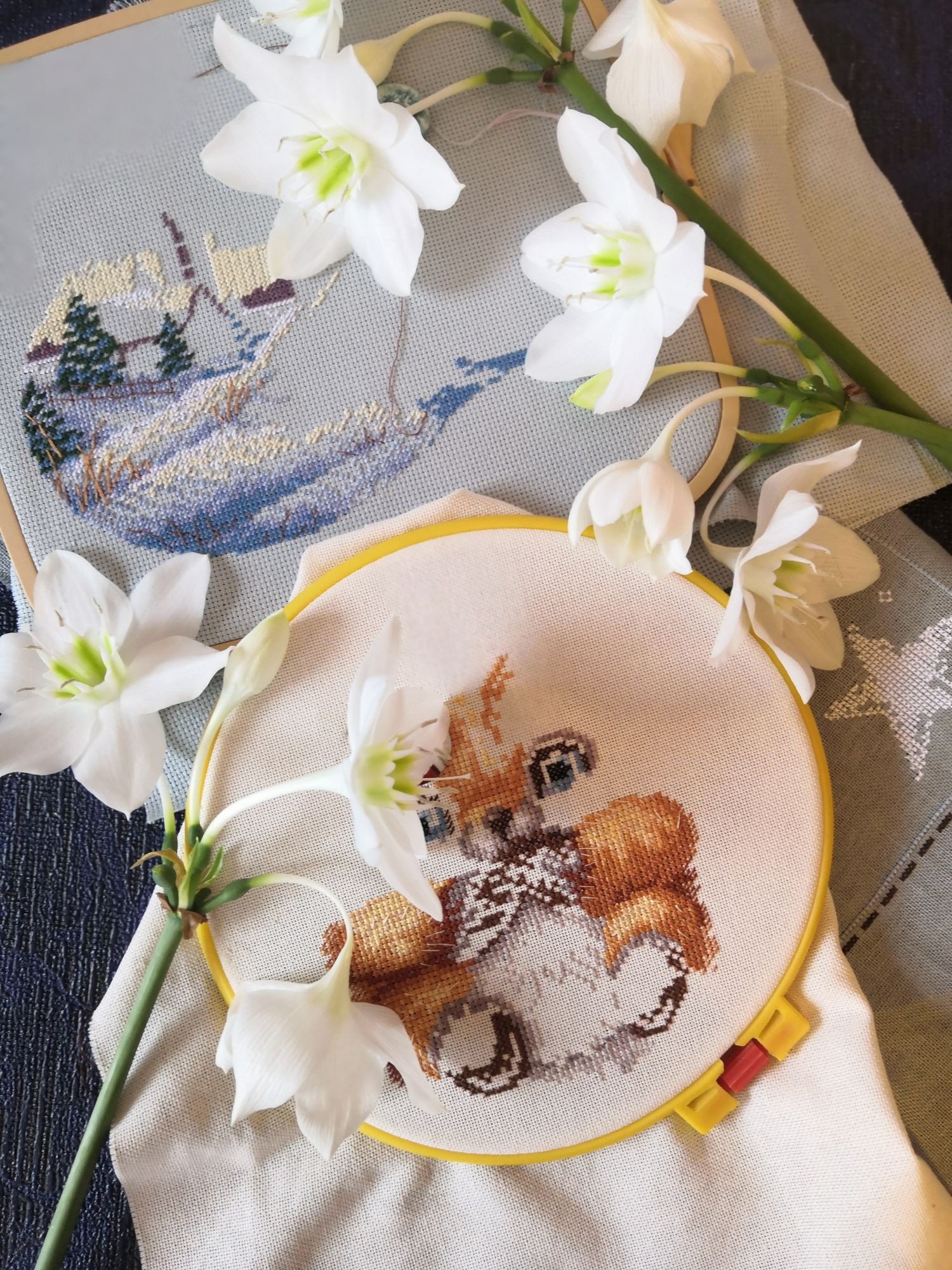 16 марта 2022 Всем привет! "Великое переселение из инстаграмма в ВК" занимает массу свободного времени, которого и так не шибко много. Вышивать успеваю, а вот снимать и обрабатывать фото нет. Память телефона трещит по швам от сохранённых скриншотов, а я пока никак не наберусь смелости начать всё это разбирать и структурировать. Про общемировые события, не добавляющие спокойствия, даже писать не буду. Но вчера и сегодня я наконец-то выкроила время, чтобы постирать-погладить-сфотографировать готовую работу и пришла зеленить гаечку. Лисенок по бесплатной авторской схеме. Было Стало И готовая работа Процесс достаточно лёгкий, в работе используется крест, полукрест, бекстич и 6 французских узелков. Вышивала нитками дмс по ключу на линде цвета слоновой кости. По саге в дизайне более 7000х (вместе с беком и прочим). У меня вышивка заняла 11 вышивальных дней, но, честно признаюсь, я спешила, вышивала по многу за день, т. к. этого лисенка старший сын просил вышить для него. А по поводу итогового фото - весеннего реквизита у меня сейчас нет от слова "вообще ", поэтому фото сделала в осеннем стиле, но для рыжих оттенков лисички, как мне кажется, так даже лучше. И минутка занимательной статистики : 31 декабря я посчитала общее количество крестиков во всех моих начатых процессах на конец года (в тех, где был перенабор). Получилось почти 200 000х и 3 работы без перенабора. На 11.03.22 суммарно 191 416х и 5 процессов без перенабора. Но как выяснилось недавно, в расчётах за 31 декабря я ошиблась почти на 5000х (в саге не был отмечен один отшитый участок хаеда, поэтому правильное число должно было быть около 195 000х). Получается несмотря на то, что за январь и февраль было вышито почти 24 000х ,количество невышитых крестиков в начатых процессах уменьшилось всего на 4000,а если учитывать, что прибавилось 2 процесса без перенабора, то итоговое число стало даже больше. Вот такая занимательная статистика. Ну и с небольшим запозданием (поскольку одна работа из коллажа уже закончена) покажу коллаж со всеми моими начатыми процессами на 1 марта: А всех желающих приглашаю в мою группу ВК "Творческий уголок ka_mila.na". Не знаю, можно ли здесь ссылки оставлять, поэтому просто напишу название, можно будет найти через поиск. Постараюсь каждый день что-то там публиковать. Так что жду в гости. Хозяйка смешных зверей, Любушка1985, maui и 4 других сказали спасибо Поделиться сообщением Ссылка на сообщение