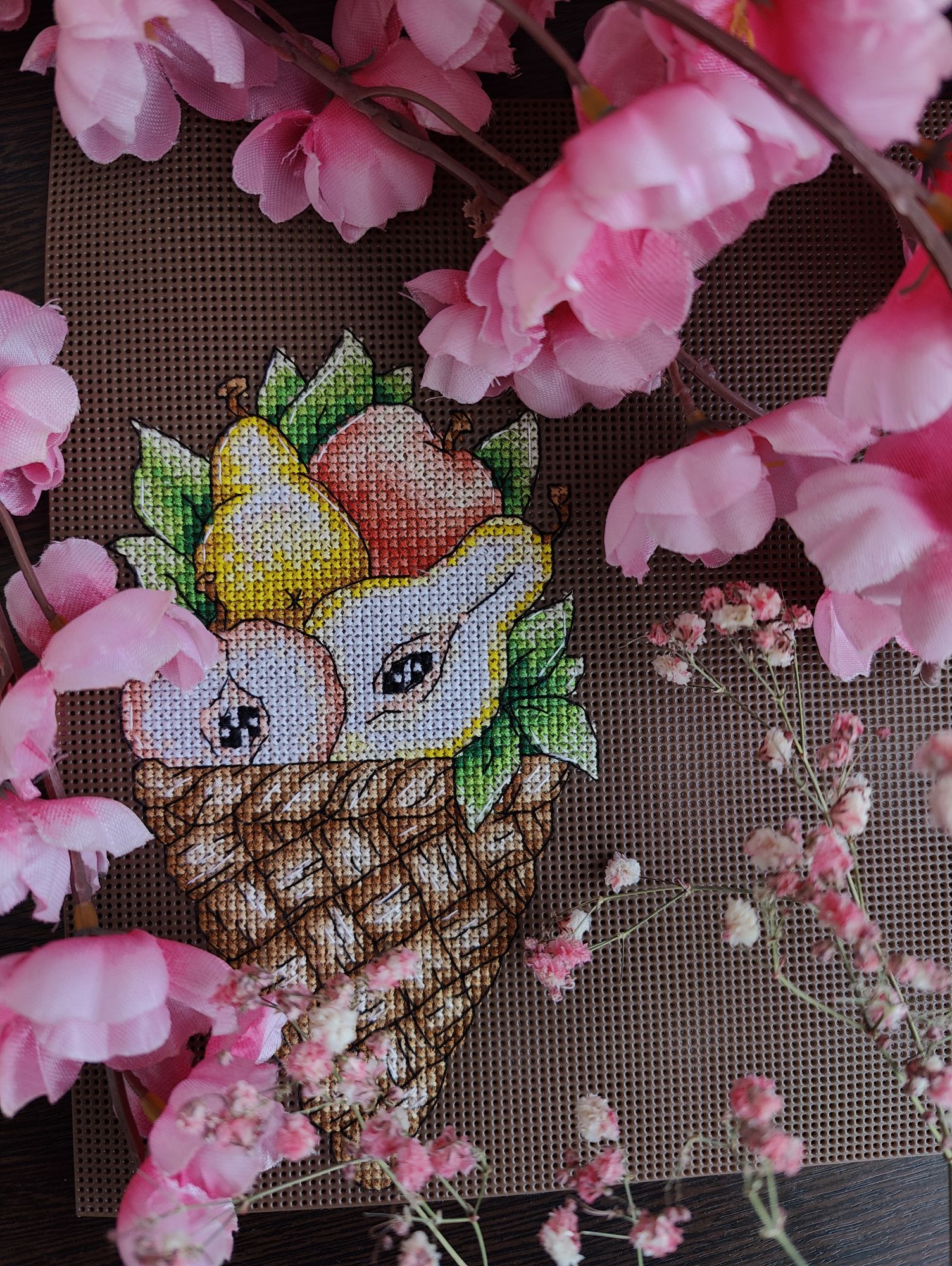 9 апреля 2024 Всем привет! Потихоньку начинаю свыкаться с мыслью, что рукодельные итоги 24 года - это будет классно, красиво, скорее всего даже обширно, но, главное, - неожиданно. Ибо текущий курс явно так на это намекает. Планы были, планы есть, но также есть уверенность, что эти планы нифига не воплотятся. Или же случится наоборот, сначала были планы, которые я собиралась выполнять, потом появляется уверенность, что планы не выполнятся и когда она (уверенность) дойдёт до абсолют всё хоп и снова переиграется и я возьмусь за планы. Во всяком случае, на сейчас год проходит достаточно непривычно для меня. Во-первых, я как-то совсем не ощущаю, что вышиваю свои средние и большие (не многоцветки) работы. По факту иногда я их достаю и продвигаю, но эти крестики как-то растворяются в сравнении с пластиком и многоцветками и теряются. Во - вторых, меня абсолютно не тянет начинать какие-то новые процессы (пластик считать не будем). В принципе, учитывая количество начатого это и не удивительно, но всё же. В третьих, количество начатых процессов при этом не снижается, а относительно начала года даже растёт. И в четвёртых, в итоге мне кажется, что в моей вышивальной жизни нет никакой движухи. Ни стартов, ни финишей, ни логических продвижений. Повторюсь, пластик моё подсознание за движуху упрямо считать не хочет. Не скажу, чтобы это прямо - таки особо сильно меня напрягало или наоборот не напрягало, просто небольшие выводы, которыми захотелось поделиться. Ну а теперь перейдём к процессам. На прошлой неделе руки потянулись к Снегирям от Совиного леса. И хоть нитки ПНК всё так же меня раздражают, сам дизайн начал затягивать. Именно это - ещё элемент, ещё фрагмент и т. д. В общем, я уже посматриваю на зябликов на предмет их покупки Снегири от Совиного леса. Было Стало Готово 2-й угол и почти 2/3 работы. Ну а основной упор на прошедшей неделе был сделан на финиширование 3-го лукошка из совместника. В этот раз это было Лукошко с киви и авокадо. Завтра буду ждать схему 4-го, а пока записалась ещё в один совместник (и ещё в одном жду старта), так что скучно точно не будет Найти бы времени на все задумки. vasilisa-1977, Nadinka-Blondinka, Путешественница и 7 других сказали спасибо Поделиться сообщением Ссылка на сообщение