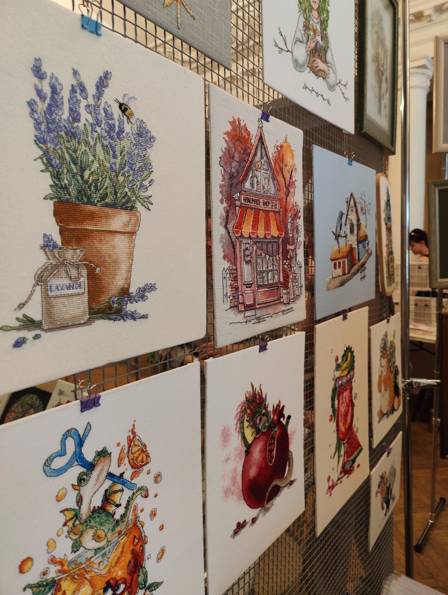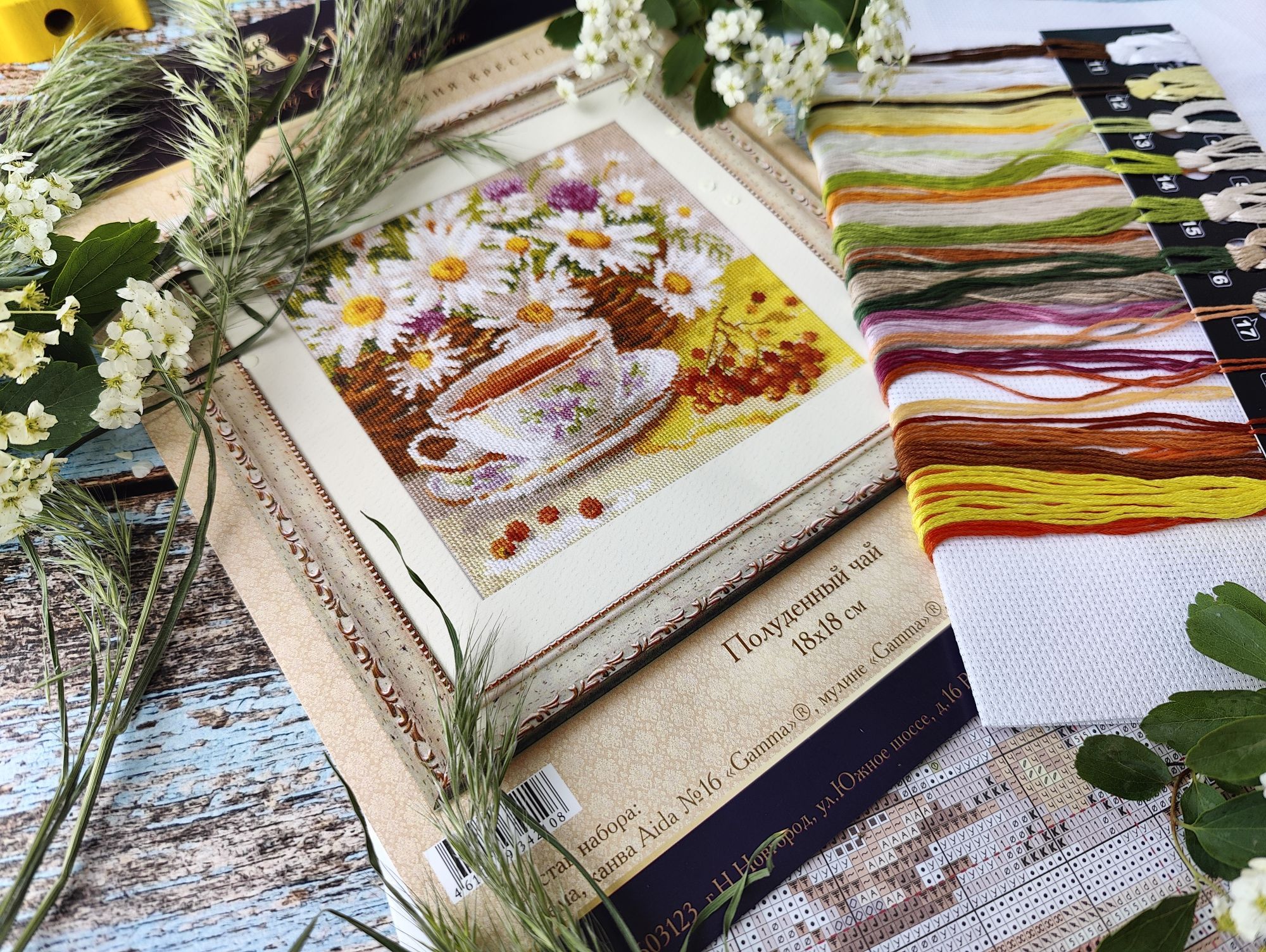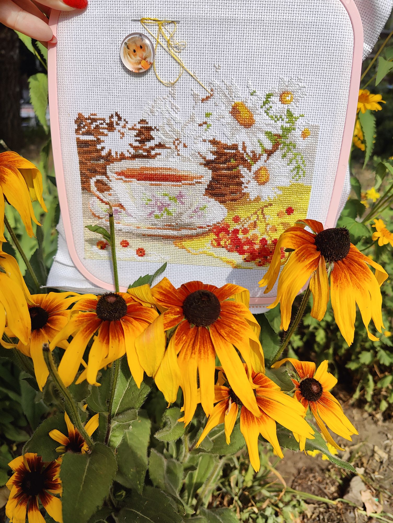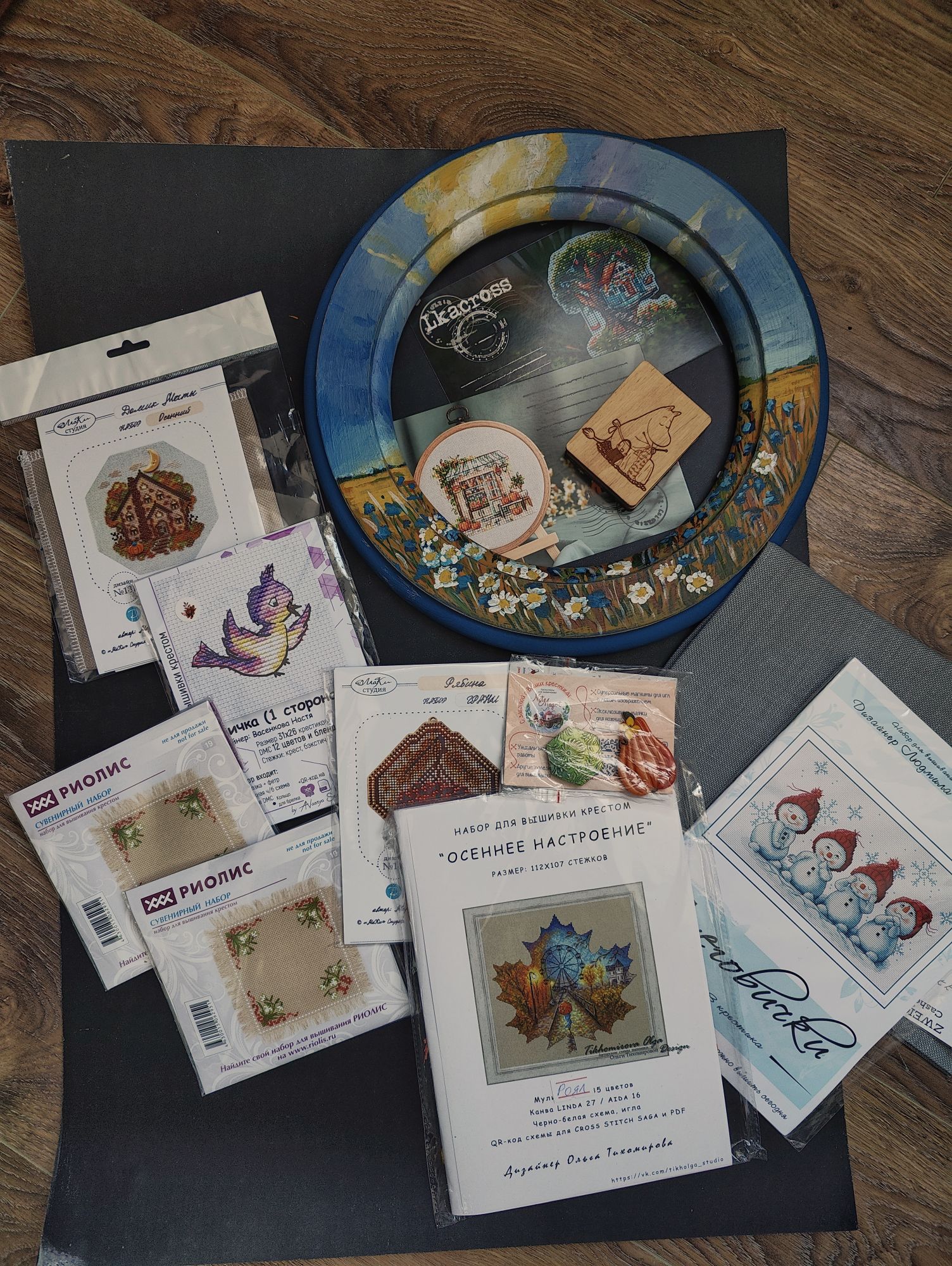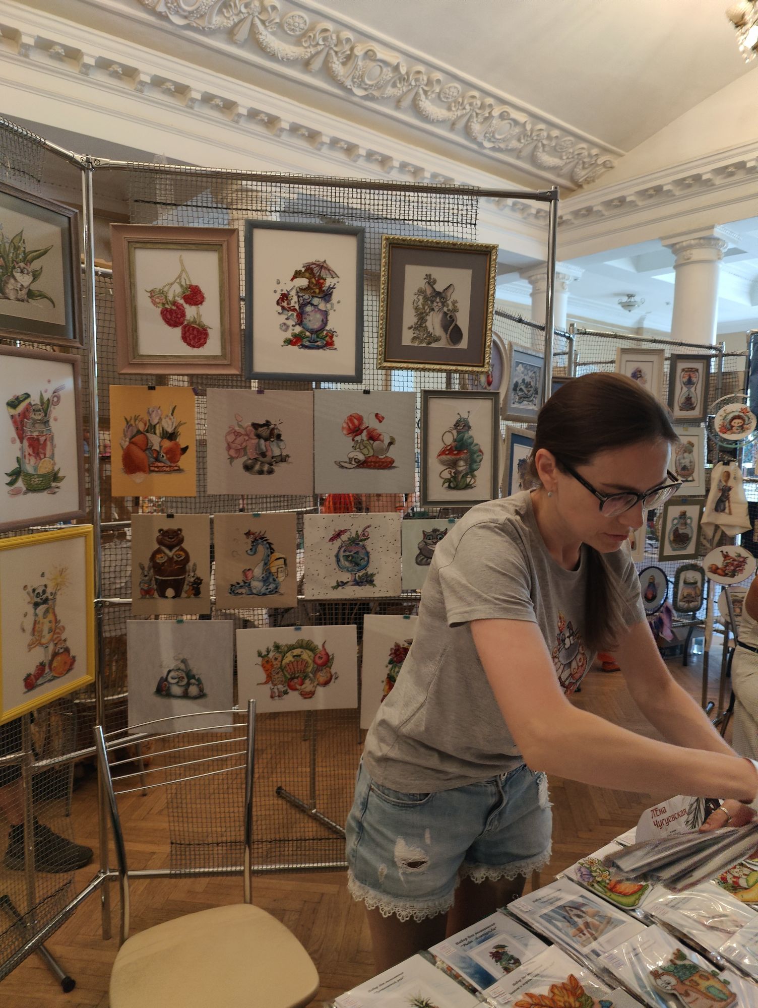 2 августа 2024 Всем привет! Почти месяц пролетел с прошлого отчёта и в этот раз моя пропажа объясняется не тем, что "хотела написать, да было некогда", а тем, что показывать особо было нечего. Я практически превратилась в одгопроцессницу с небольшими шагами влево - вправо, такими небольшими, что в них и показывать было нечего. А нести один процесс, мне честно говоря, не хотелось. Теперь, когда фотографии и события поднакопились, можно и показать нос. Буду писать не по хронологии или значимости, а как лучше в текст будет ложиться. Ну и сначала, наверное, стоит показать причину моего отсутствия. "Полуденный чай" от Алисы. Финиш. Было: Стало ещё немного и финиш Напомню, что вышивала этот дизайн в пару к ранее вышитому "Утреннему чаю", но, в отличие от первого дизайна, здесь я начала процесс с самого лёгкого участка, а сложное - оставила под конец. Как же я была рада такому решению! Ибо "50 оттенков бело-серого" на ромашках я вышивала буквально на морально - волевых и втором предфинишном дыхании. В остальном же дизайн вполне классный, надеюсь, что поход в багетку не будет отложен в долгий ящик. Двигаем дальше. Поскольку у меня закончились все срочные совместники на пластике, то мои руки наконец-то дошли до давно начатых и благополучно отложенных в долгий ящик "Летних флажков" от Анны Петуновой и Елены Ларцовой. Столько было вышито на начало года: За июль я вышила первый флажок И приступила к второму Что сказать по впечатлениям? Отдыхалочкой здесь можно назвать только размер каждого отдельного флажка, в остальном же - ни разу не простой дизайн. Не дико сложный, но и не простой. А, если брать все флажки суммарно, то и достаточно большой по крестикам. Ну и в последний день июля, я решила, что могу попробовать ещё немного улучшить свою вышивальную статистику и устроила мини - марафон по завершению "Домика винодела" от Ольги Антроповой. Финиш Было в гаечке только стартовое фото: к утру 31 июля процесс был вышит ровно наполовину: Ну и дальше фото в течение дня: И готовая (но пока не оформленная) работа: Вообще неоформленный пластик в этом году копится у меня с какой-то сумасшедшей скоростью и я решила, что пора наконец-то начать разгребать эти Авгиевы конюшни. Ну и зачем мелочиться с одним - двумя дизайнами, если можно оформить сразу шесть? Так на свет появился кубик с фруктово-ягодными дизайнами от Татьяны Шаровой, вышитыми в прошлом году. С процессами на этом всё, а с вышивальными новостями - нет. 27 июля у нас в Воронеже прошёл вышивальный фестиваль "Белая ворона". Я не могла пропустить такое мероприятие и с вышивальной подругой отправилась туда. Немного фото со стендов Как же круто побывать на таком мероприятии. Это прям концентрат творчества и вдохновения. А вживую увидеть дизайнеров и всяких известных рукодельниц, о которых раньше только читала. Круто. Единственный, даже не минус, а нюанс, не с пустым кошельком оттуда уйти невозможно. Я перестала покупать, только после того, как покупать стало не на что . Но в памяти пару закладочек, что ещё нужно будет купить, сделала. Ну и, собственно, мои покупки с фестиваля: Часть наборов хочу вышить уже этой осенью, а остальное пока пойдёт в запасы (наборы Риолис и маленький с птичкой - это выигрыши в проводимой на фестивале лотерее). Далее невышивальное. Что было ещё в июле? Мы отпраздновали 11 годовщину свадьбы. Отметили её поездкой в