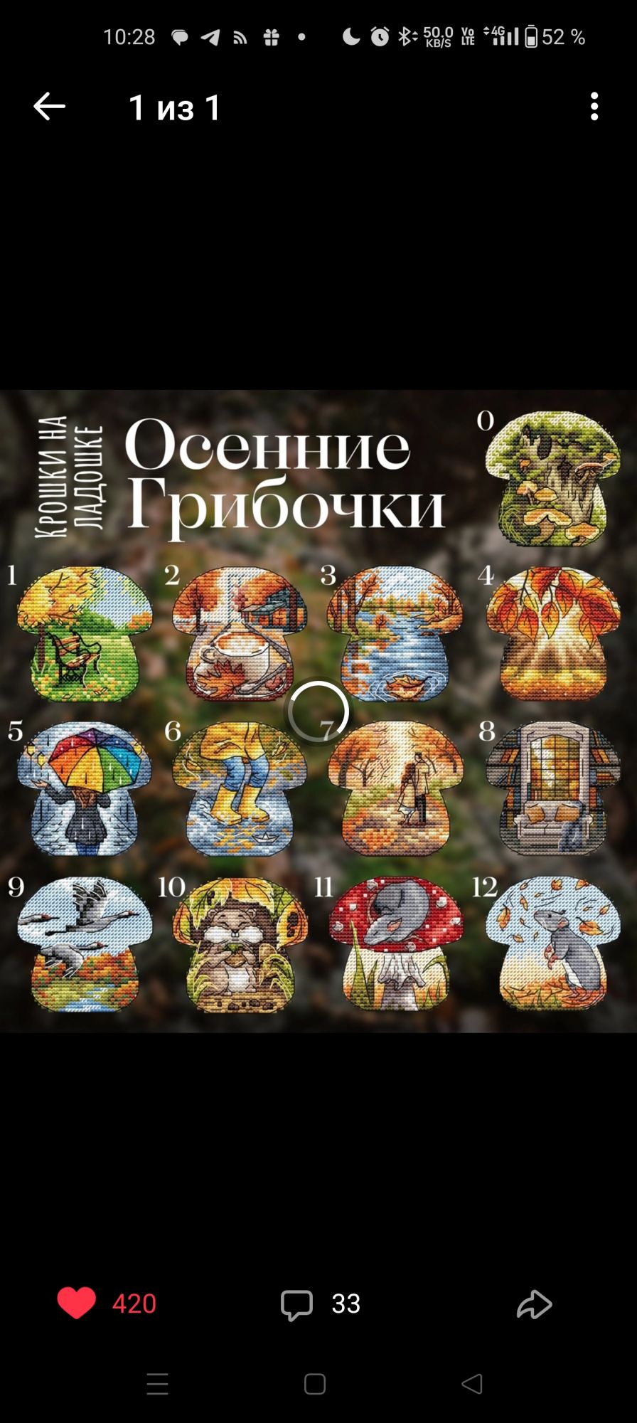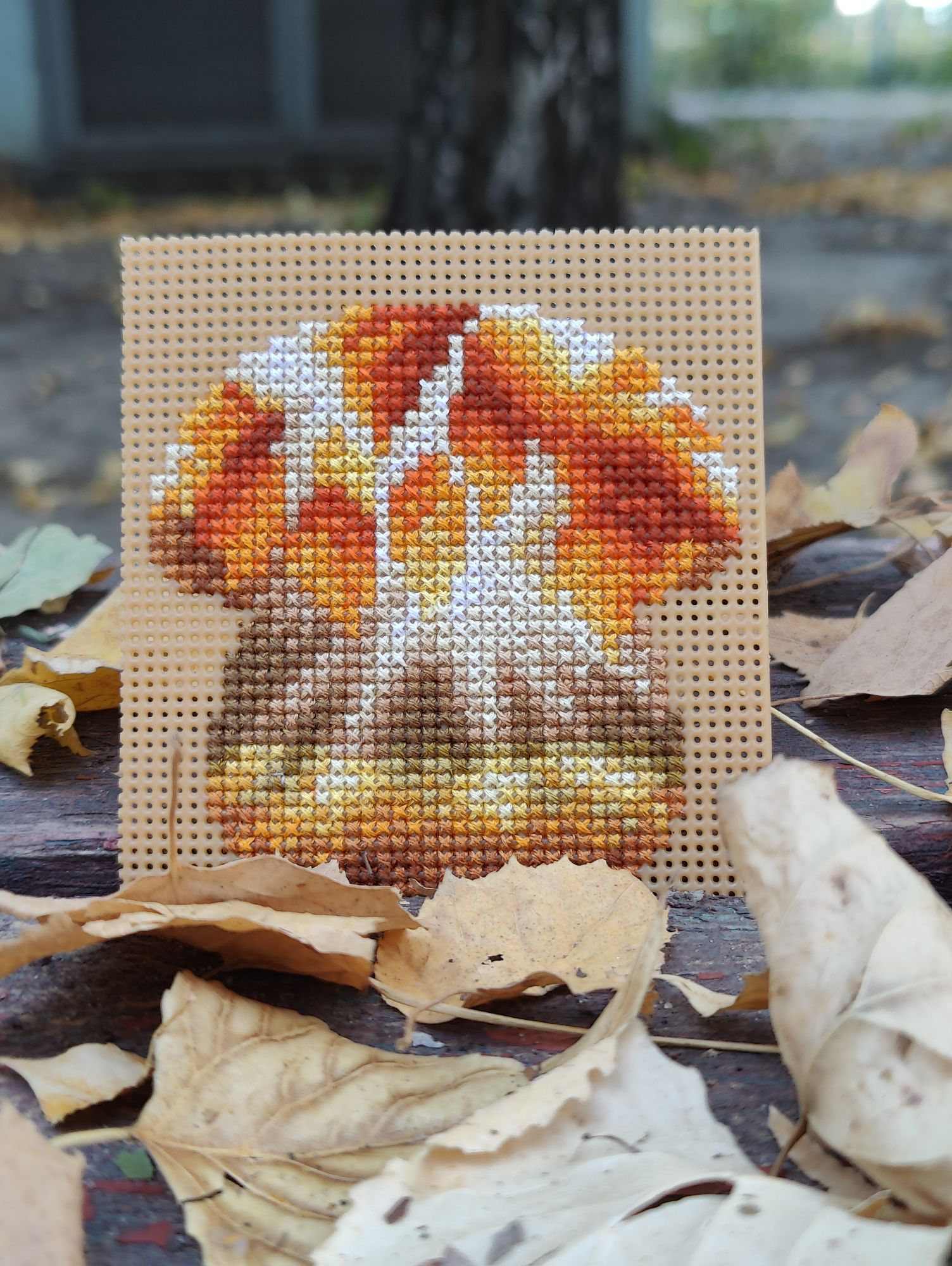 21 сентября 2024 Всем привет! Я принесла небольшой вышивальный отчёт. Странное дело, после первой недели моей адаптации к школе я, в принципе, вернулась в обычное вышивальное русло, цифры в крестиках меня вполне радуют, в вот показать особо нечего - я то в Водолейке пару небольших участков вышила, то в Звёздном море прибавила облачков, то раскидала по сотне крестиков по другим процессам, в общем до масштабных отчётов пока придётся подождать. Поэтому снова пластик. Летние флажки. Готов четвёртый. У меня с ними уже даже последовательность отшива начала формироваться: вышиваю по очереди - предмет - пейзаж - предмет - пейзаж, сейчас вот снова над предметом тружусь. Ну и внезапно... я вступила в очередной совместник. Вышивать буду вот такие осенние грибочки. Скорее всего не все 13, но хотя бы 9-10 хотелось бы успеть в рамках СО. Первый уже готов : С этим совместником вообще интересная история получилась: увидела анонс, грибочки показались симпатичными, но вышивать не планировала. А потом начала менять декор в квартире на осенний и поняла, что осенних прикладных вышивок у меня прям совсем немного, после чего решилась на грибочки. Ну вот и все мои рукодельные новости. Из нерукодельного, младший наконец-то пошёл в детский сад, отходил целых два дня, теперь дома лечим его и себя . В принципе, ожидаемо. Скрытый текст А я после прошлого раза (когда болела) впала в какое-то пофигистическое состояние (в основном выражающееся в том, что перестала пить назначенные витамины, следить за весом и своей двигательной активностью. На всё это пофиг. Вот думаю, может "клин клином вышивает" и после нового захода болезни я снова вернусь ко всему этому? Ой, вспомнила ещё про вышивку. Я же наконец-то начала оформлять свой вышитый пластик и деревяшки. Полностью закончила с оформлением винограда от Вышивариума и весенних карандашей от Елены Вязгиной, в процессе сейчас две дюймовочки от Алины Игнатьевой, а своей очереди дожидается домик винодела (никак не выберу на большую или меньшую подставку его посадить). Ну и напоследок покажу свой осенний уголок на кухне. На лоджии же пока руки не дошли до наведения красоты. На этом сегодня закончу отчёт, надеюсь, в следующий раз смогу показать Вам больше интересного. Забава_, Хозяйка смешных зверей, Гало4ка и 2 других сказали спасибо Поделиться сообщением Ссылка на сообщение