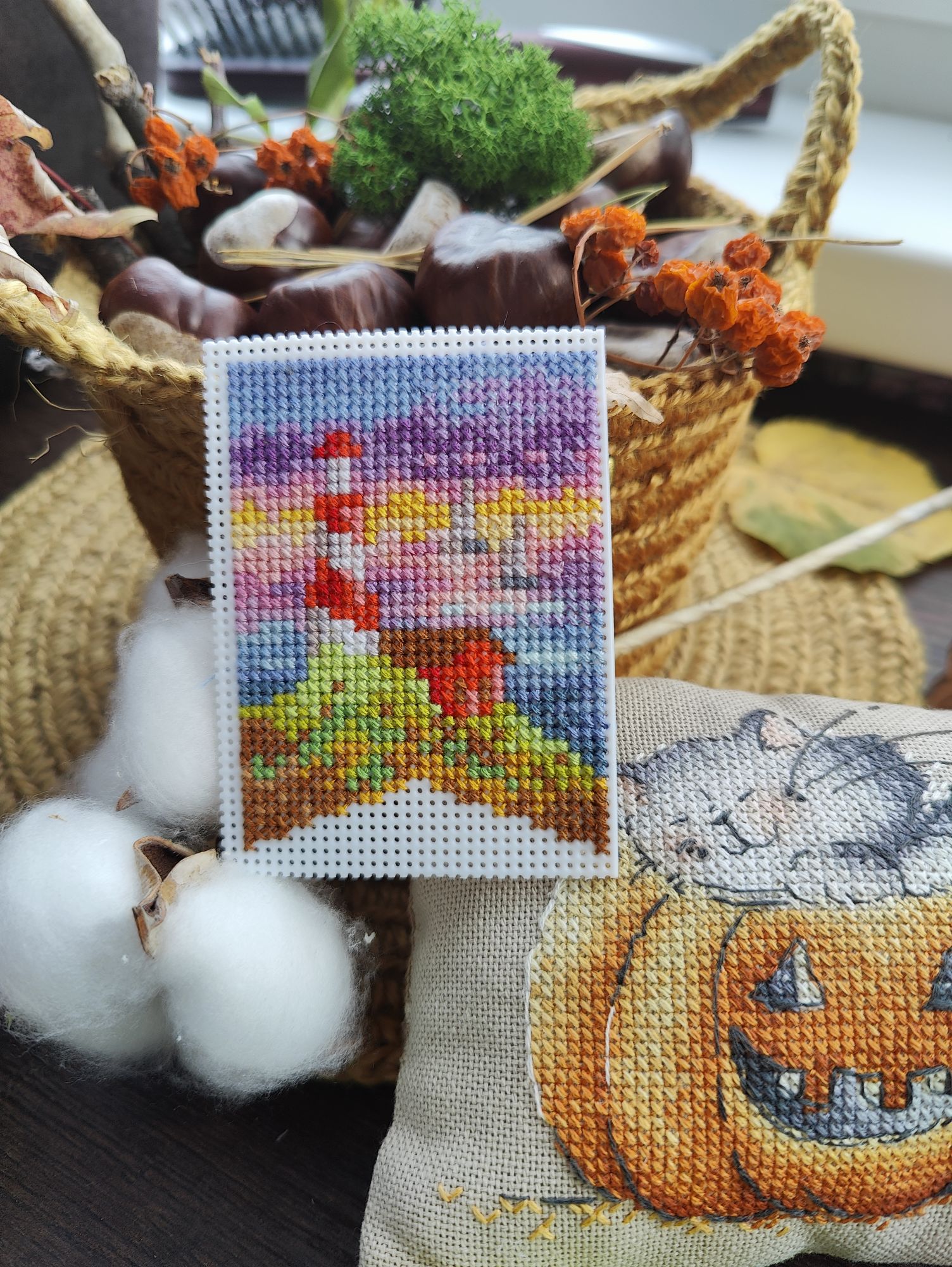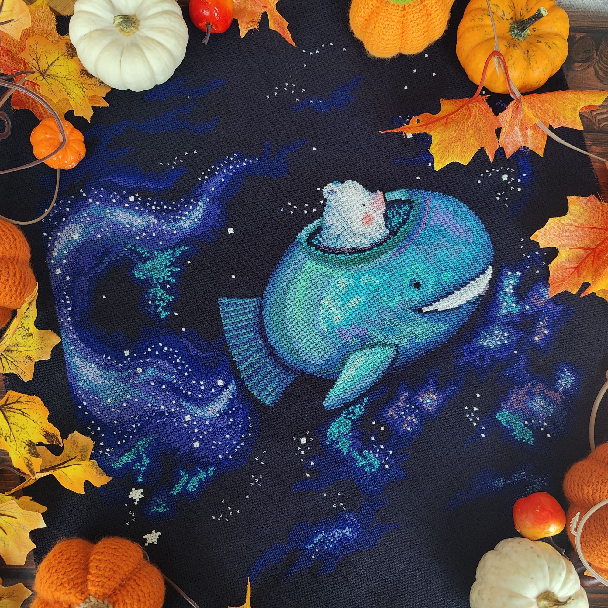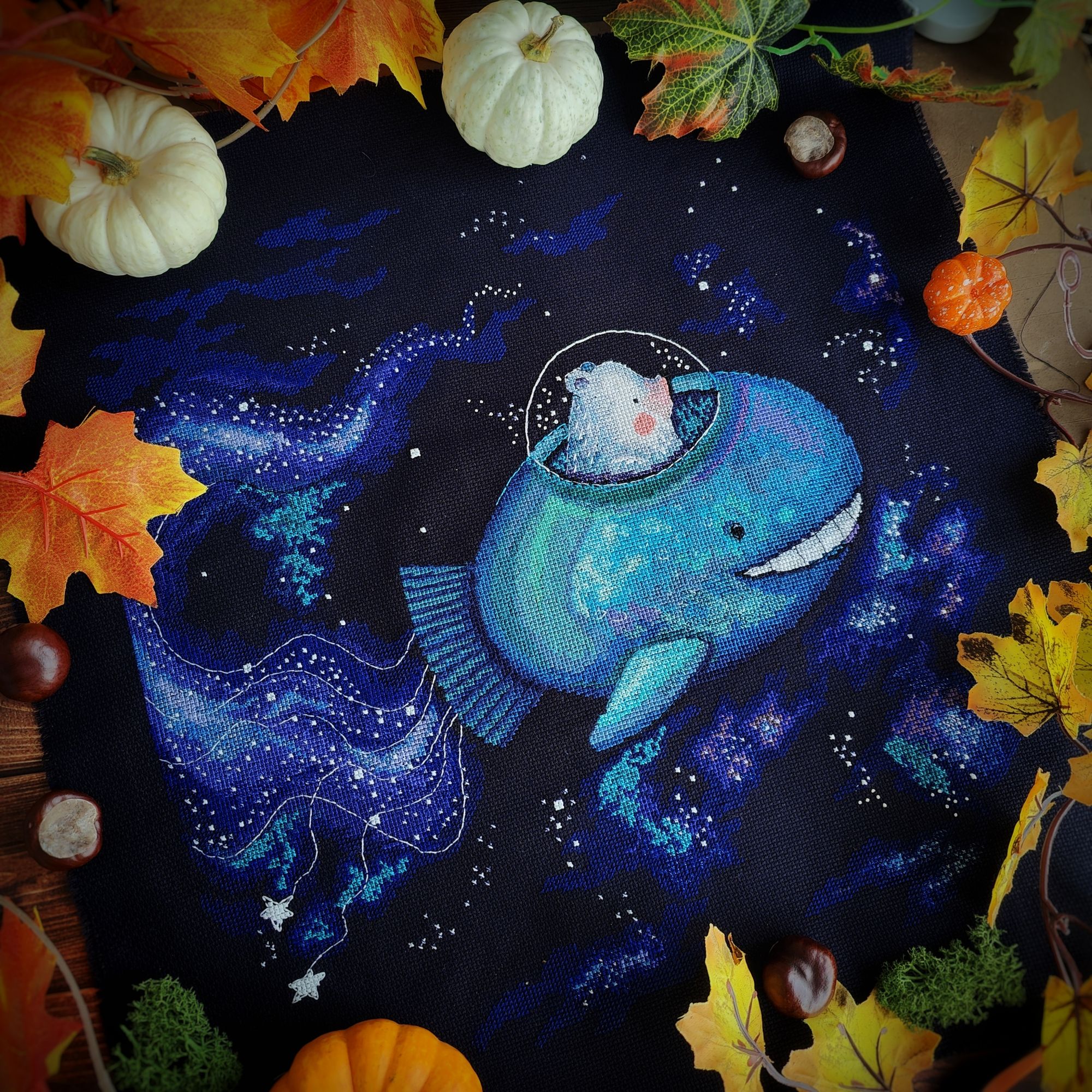 6 октября 2024 Ну а теперь перейдём к, собственно, отчёту. 1. Практически в соответствии с планом, продвигаются Летние флажки от Анны Петуновой и Елены Ларцовой. В сентябре успела вышить 5-й флажок. Вот так все 5 флажков выглядят вместе А в октябре вышила 6-й: 2. Осенние грибочки тоже продвигаются. Вышит второй И третий: Какие же они всё - таки классные и атмосферные! 3. Ну и гвоздь сегодняшней программы (хотя нет, гвоздь будет попозже) Звёздное море от РТО, процесс, который на 2,5 месяца перетянул моё внимание от всех остальных начатых крупных процессов и, который в итоге теперь находится в шаге от финиша. Было : Стало Впереди куча бека и немного французских узелков, работы ещё хватает, но всё - таки основная часть уже сделана. Устала, если честно. Облака вокруг кита казались какими-то бесконечными, вышивала - вышивала, а они всё никак не заканчивались. 4. Ну а теперь точно, гвоздь программы - оформленный Осенний домик мечты. Оформила в раму от Щепки. Покупала её под другой дизайн, но приложила к домику и так мне понравился результат, что решила их совместить окончательно. Оформлять в такую раму очень быстро, а получается вполне симпатично. На этой красивой ноте я на сегодня закончу. Статистику за месяц и не вышивальные новости расскажу в следующий раз, постараюсь сильно не затягивать, а сейчас спать (я как обычно откладываю отчёт на поздний вечер - раннюю ночь). Пока. maui, Полли, vasilisa-1977 и 2 других сказали спасибо Поделиться сообщением Ссылка на сообщение