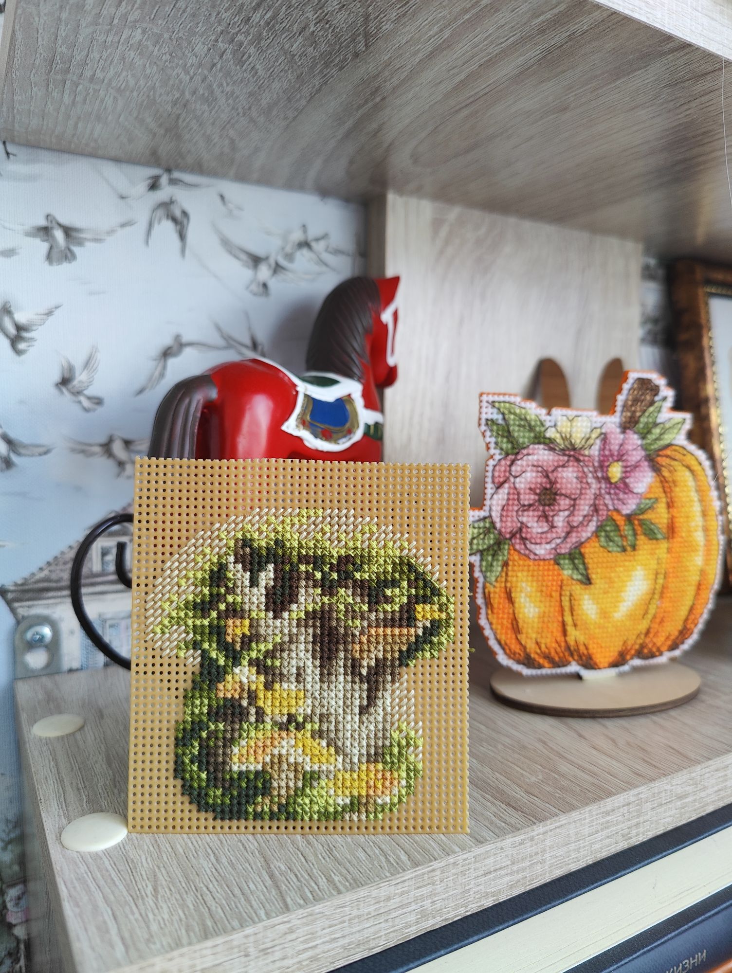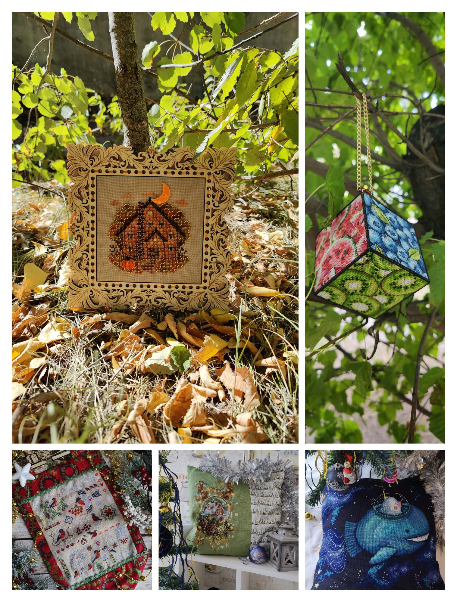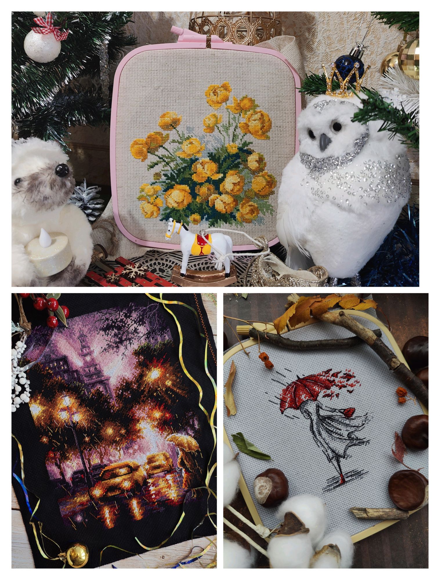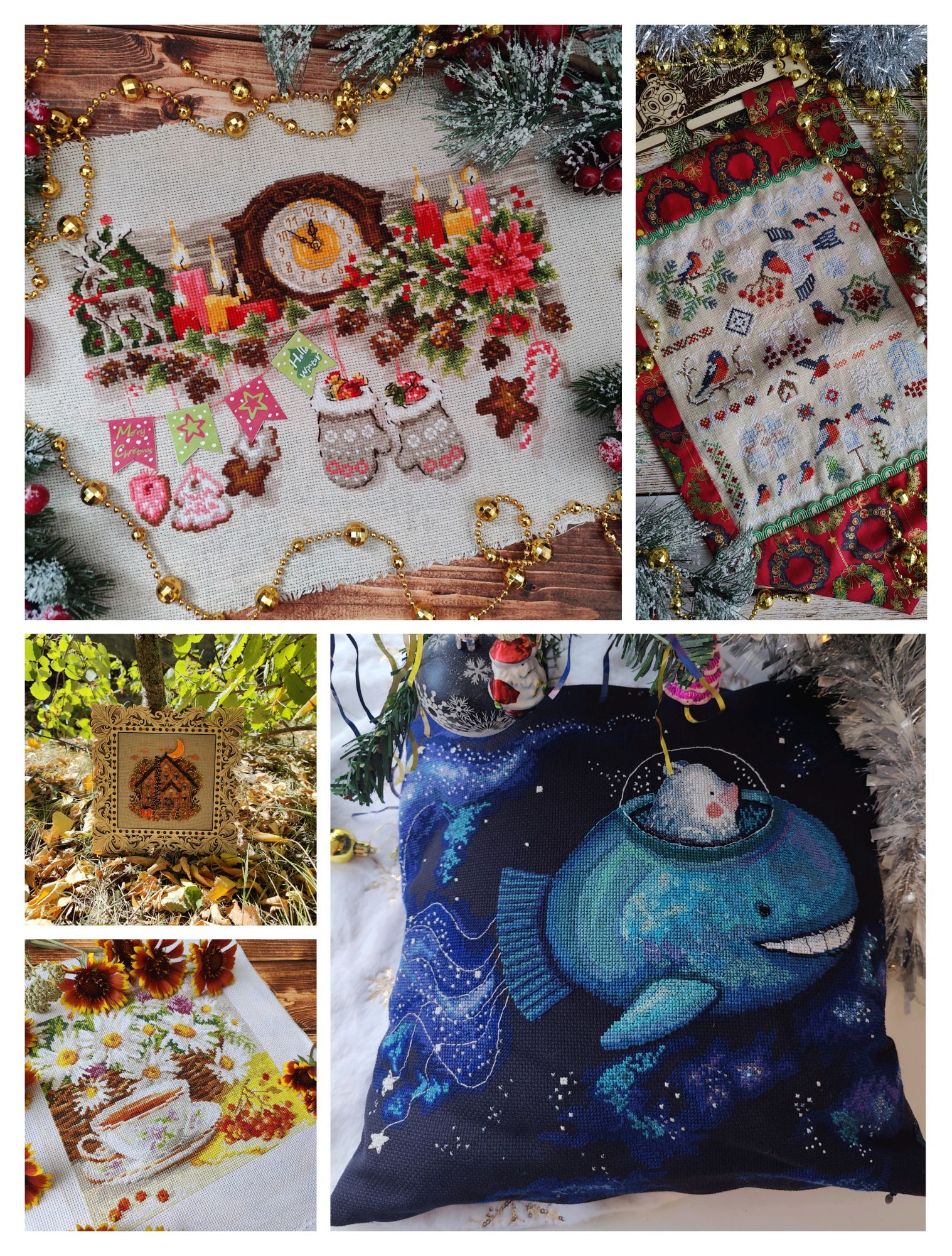 13 октября 2024 Всем привет! В этот раз я не хочу затягивать с отчётом. Неделя получилась довольно продуктивная, подозреваю, что если переносить отчёт на следующие выходные, то слишком много писать придётся. В целом, я давно не была так довольна рукодельными результатами всего лишь одной недели. Очень много всего получилось сделать, ради такого повода даже коллаж себе сделала на будущее (ну люблю я их, это моя маленькая слабость). Покажу сначала его, а потом подробнее всё распишу. Итак, во-первых, зеленим гаечку у процесса "Звёздное море" . Наконец-то мои космические путешественники финишировали. Было Стало Знаете, вот иногда после финиша долгостроя пишут: "Я не понимаю, почему не закончила его раньше". Так вот, здесь совсем не тот случай, как раз таки понимаю. Наскоком этот процесс не вышить, мне потребовалось больше 2-х месяцев, когда этот процесс был моим основным (не единственным, но основным), чтобы довести его до финиша. Я слишком непостоянный в вышивке человек, чтобы так долго держать любой свой процесс во внимании, я люблю переключаться после 1.5 - 2 - х тысяч крестиков за подход, через 4-5 тысяч я, в принципе, меняю основной процесс. А здесь до финиша было 8,5 тыс крестиков и плюс к ним бек и фрузелки. И.. я устала... Вот честно, устала от этого процесса, по-хорошему, надо было разделить это на 2 захода, в промежутке закончить или продвинуть какие-то другие работы, но тут сыграло моё упрямство, желание вышить таки наконец-то и подарить подушку сыну, поставить галочку в годовом плане, в челендже, в общем включилась моя упертость. Закончила. Это был ещё старт 21-го года, 5-й по старшинству начатых процессов. И, я вот честно, даже не совсем ощутила этот финиш в плане того, что дизайн уже не в процессах. Поясню: у меня много начатых работ, вместе они занимают достаточно много места, но по отдельности они занимают разное количество места. И "Звёздное море" это был в этом плане совсем небольшой процесс, тонюсенькая папка-конверт, в которую помещалось всё : и обложка, и схема, и канва, и нитки - - и сейчас процесс закончен, а место практически не освободилось. Надо, видимо, тыквы заканчивать, они очень много места в хранении занимают . Давайте, переходить к во-вторых. В моих начатых процессах обитает новогодний сапожок от Dimensions. И, наверное, с весны я безрезультатно ищу устраивающую меня ткань для задника. Периодически некоторые понравившиеся варианты заказываю и понимаю, что всё же не то. Недавно купила ещё один классный сам по себе, но не совсем подходящий к дизайн отрез ткани. Но он подошёл к снегирям от Совиного леса. Я вот положила их на ткань и прям так и оставила лежать на столе, периодически любуясь на сочетание. А мой стол хоть и большой, но в будни весь заложен процессами, основами, нитками, коробками, блокнотами, в общем всё, что достаётся для процессов остаётся лёжать там в творческом хаосе. На выходных, всё собирается, убирается и стол становится идеально чистым, но в будни так. И вот на следующий день я села за стол, посмотрела на снегирей на ткани и поняла, что и убрать их не смогу, и вышивать они мне не дают, все время отвлекая на себя внимание и... я хочу их оформить. В итоге минус один вышивальный день (не считая 250х в промежутках за проверкой уроков старшего) и готов новогодний баннер Дальше пора было бы выбрать следующий основной процесс, но у меня мои пластиковые