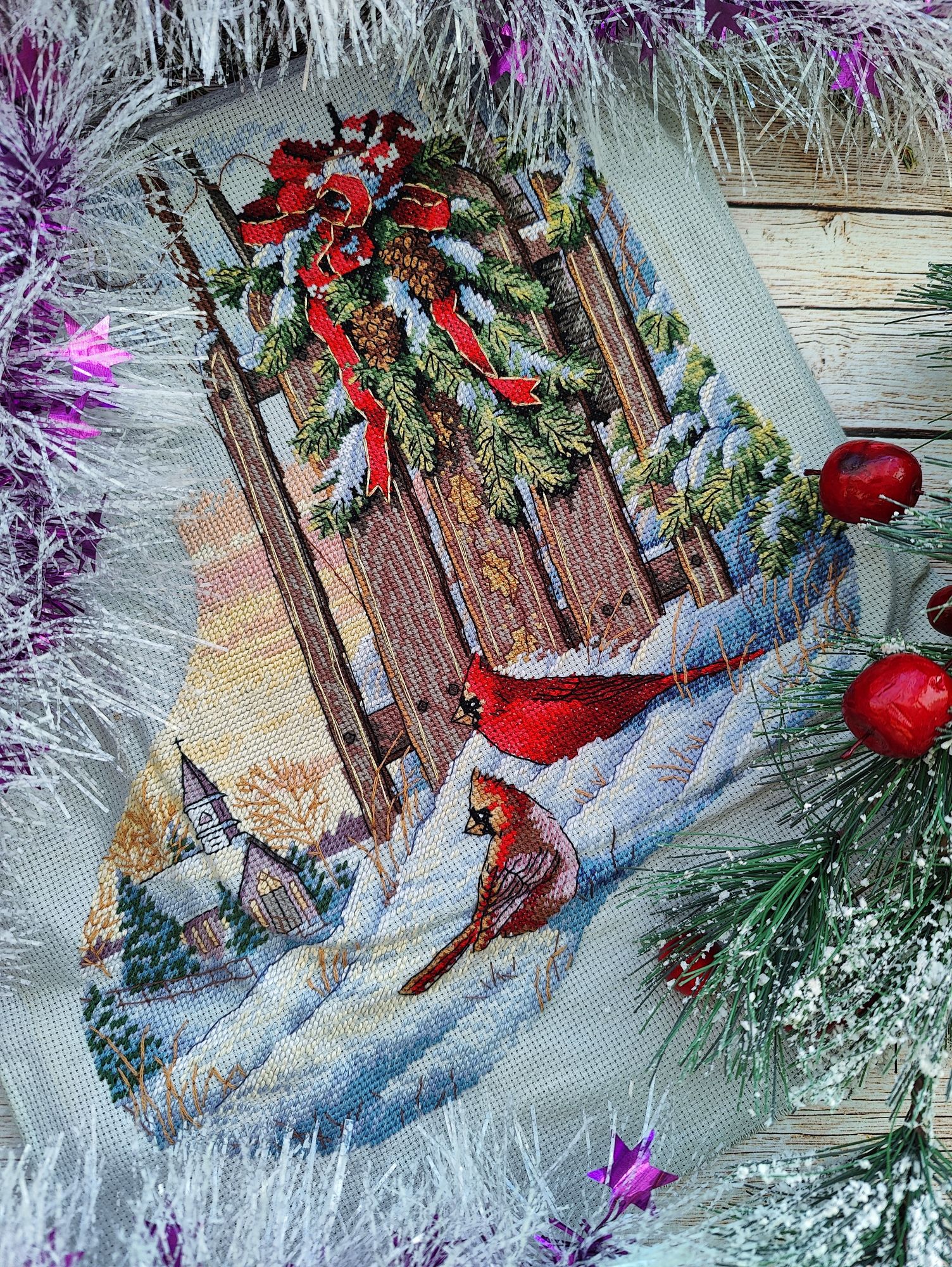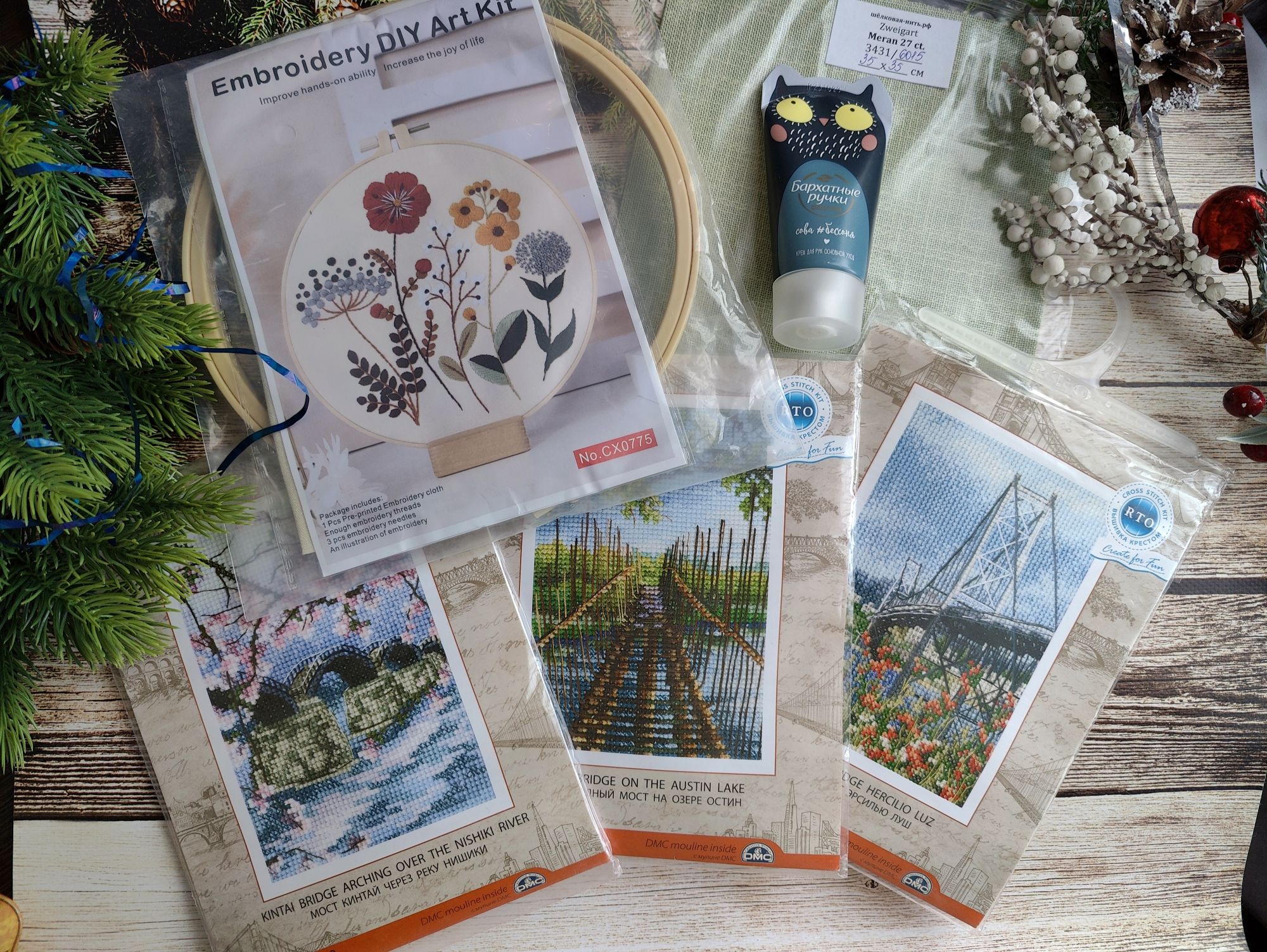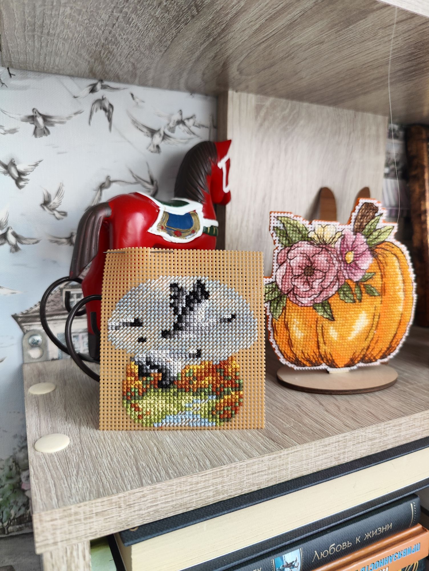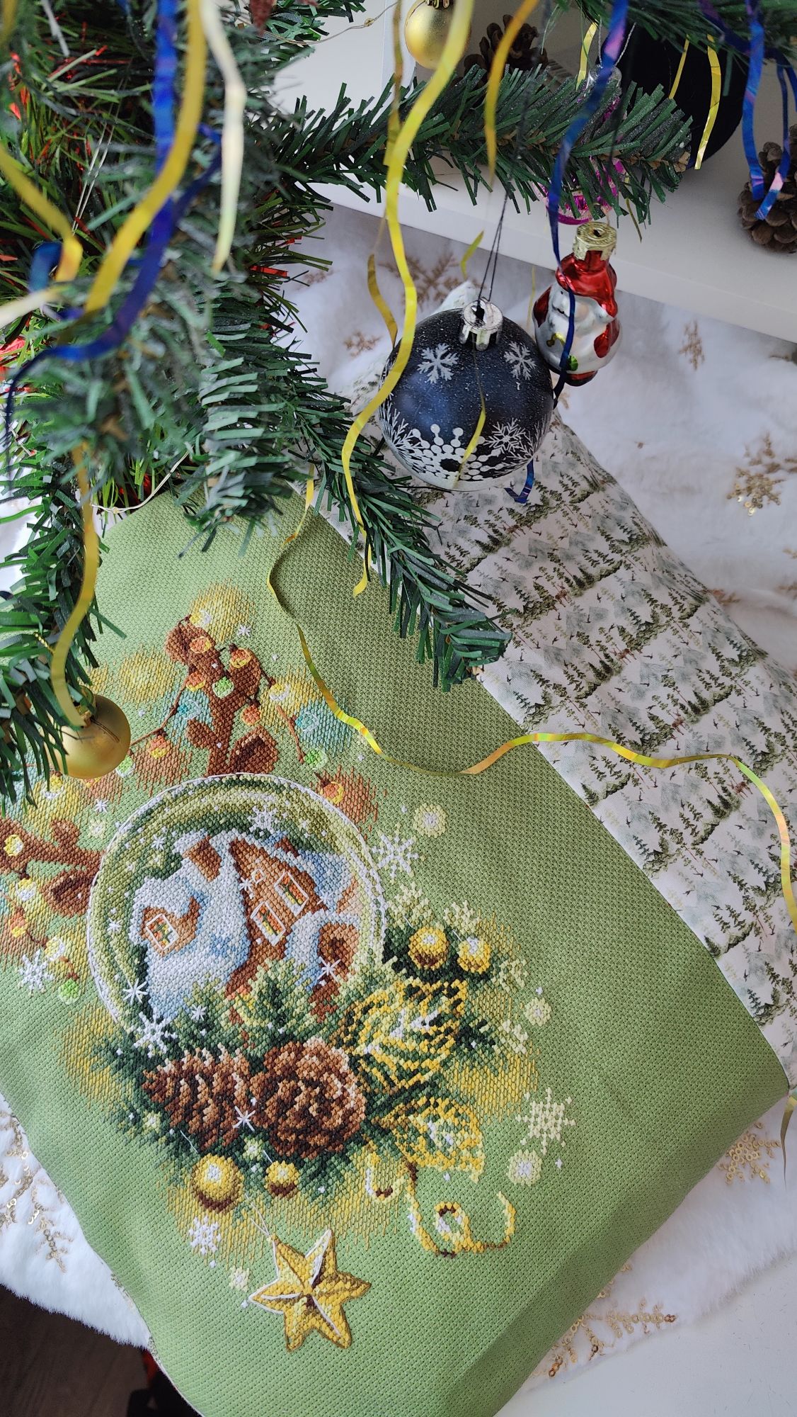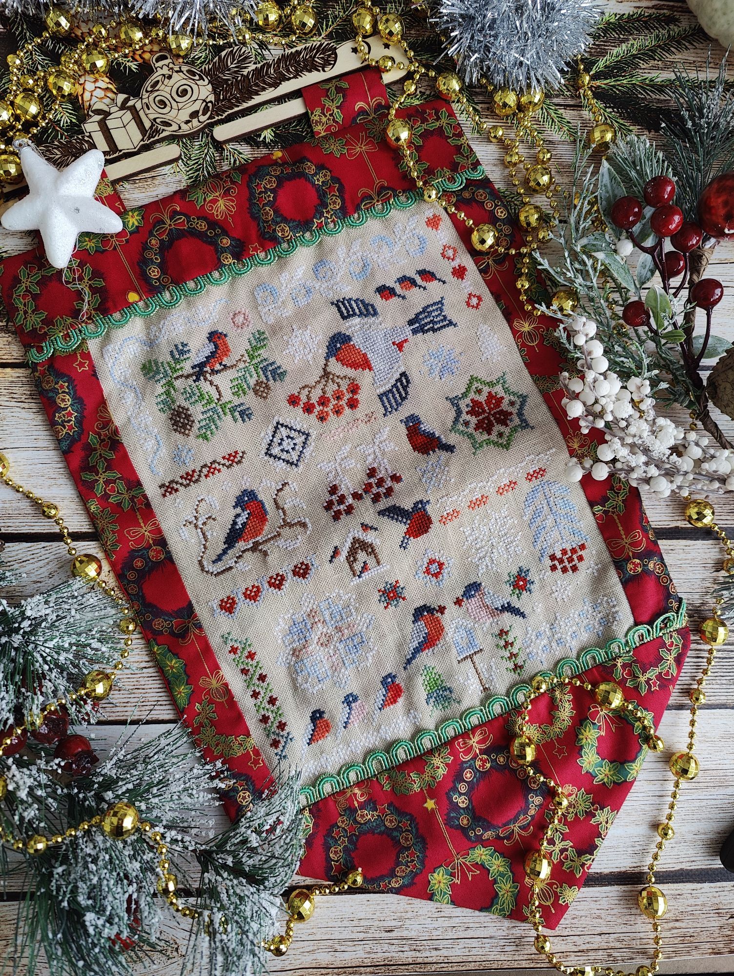 13 октября 2024 Всем привет! В этот раз я не хочу затягивать с отчётом. Неделя получилась довольно продуктивная, подозреваю, что если переносить отчёт на следующие выходные, то слишком много писать придётся. В целом, я давно не была так довольна рукодельными результатами всего лишь одной недели. Очень много всего получилось сделать, ради такого повода даже коллаж себе сделала на будущее (ну люблю я их, это моя маленькая слабость). Покажу сначала его, а потом подробнее всё распишу. Итак, во-первых, зеленим гаечку у процесса "Звёздное море" . Наконец-то мои космические путешественники финишировали. Было Стало Знаете, вот иногда после финиша долгостроя пишут: "Я не понимаю, почему не закончила его раньше". Так вот, здесь совсем не тот случай, как раз таки понимаю. Наскоком этот процесс не вышить, мне потребовалось больше 2-х месяцев, когда этот процесс был моим основным (не единственным, но основным), чтобы довести его до финиша. Я слишком непостоянный в вышивке человек, чтобы так долго держать любой свой процесс во внимании, я люблю переключаться после 1.5 - 2 - х тысяч крестиков за подход, через 4-5 тысяч я, в принципе, меняю основной процесс. А здесь до финиша было 8,5 тыс крестиков и плюс к ним бек и фрузелки. И.. я устала... Вот честно, устала от этого процесса, по-хорошему, надо было разделить это на 2 захода, в промежутке закончить или продвинуть какие-то другие работы, но тут сыграло моё упрямство, желание вышить таки наконец-то и подарить подушку сыну, поставить галочку в годовом плане, в челендже, в общем включилась моя упертость. Закончила. Это был ещё старт 21-го года, 5-й по старшинству начатых процессов. И, я вот честно, даже не совсем ощутила этот финиш в плане того, что дизайн уже не в процессах. Поясню: у меня много начатых работ, вместе они занимают достаточно много места, но по отдельности они занимают разное количество места. И "Звёздное море" это был в этом плане совсем небольшой процесс, тонюсенькая папка-конверт, в которую помещалось всё : и обложка, и схема, и канва, и нитки - - и сейчас процесс закончен, а место практически не освободилось. Надо, видимо, тыквы заканчивать, они очень много места в хранении занимают . Давайте, переходить к во-вторых. В моих начатых процессах обитает новогодний сапожок от Dimensions. И, наверное, с весны я безрезультатно ищу устраивающую меня ткань для задника. Периодически некоторые понравившиеся варианты заказываю и понимаю, что всё же не то. Недавно купила ещё один классный сам по себе, но не совсем подходящий к дизайн отрез ткани. Но он подошёл к снегирям от Совиного леса. Я вот положила их на ткань и прям так и оставила лежать на столе, периодически любуясь на сочетание. А мой стол хоть и большой, но в будни весь заложен процессами, основами, нитками, коробками, блокнотами, в общем всё, что достаётся для процессов остаётся лёжать там в творческом хаосе. На выходных, всё собирается, убирается и стол становится идеально чистым, но в будни так. И вот на следующий день я села за стол, посмотрела на снегирей на ткани и поняла, что и убрать их не смогу, и вышивать они мне не дают, все время отвлекая на себя внимание и... я хочу их оформить. В итоге минус один вышивальный день (не считая 250х в промежутках за проверкой уроков старшего) и готов новогодний баннер Дальше пора было бы выбрать следующий основной процесс, но у меня мои пластиковые