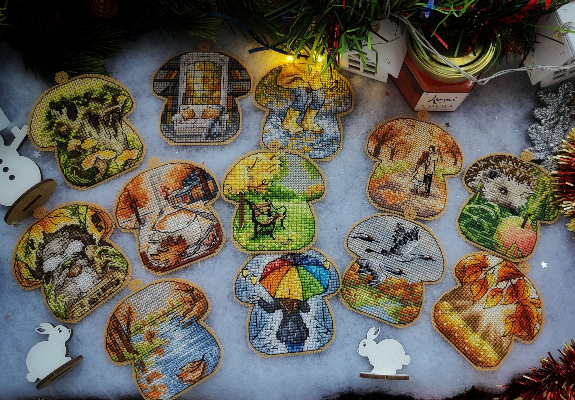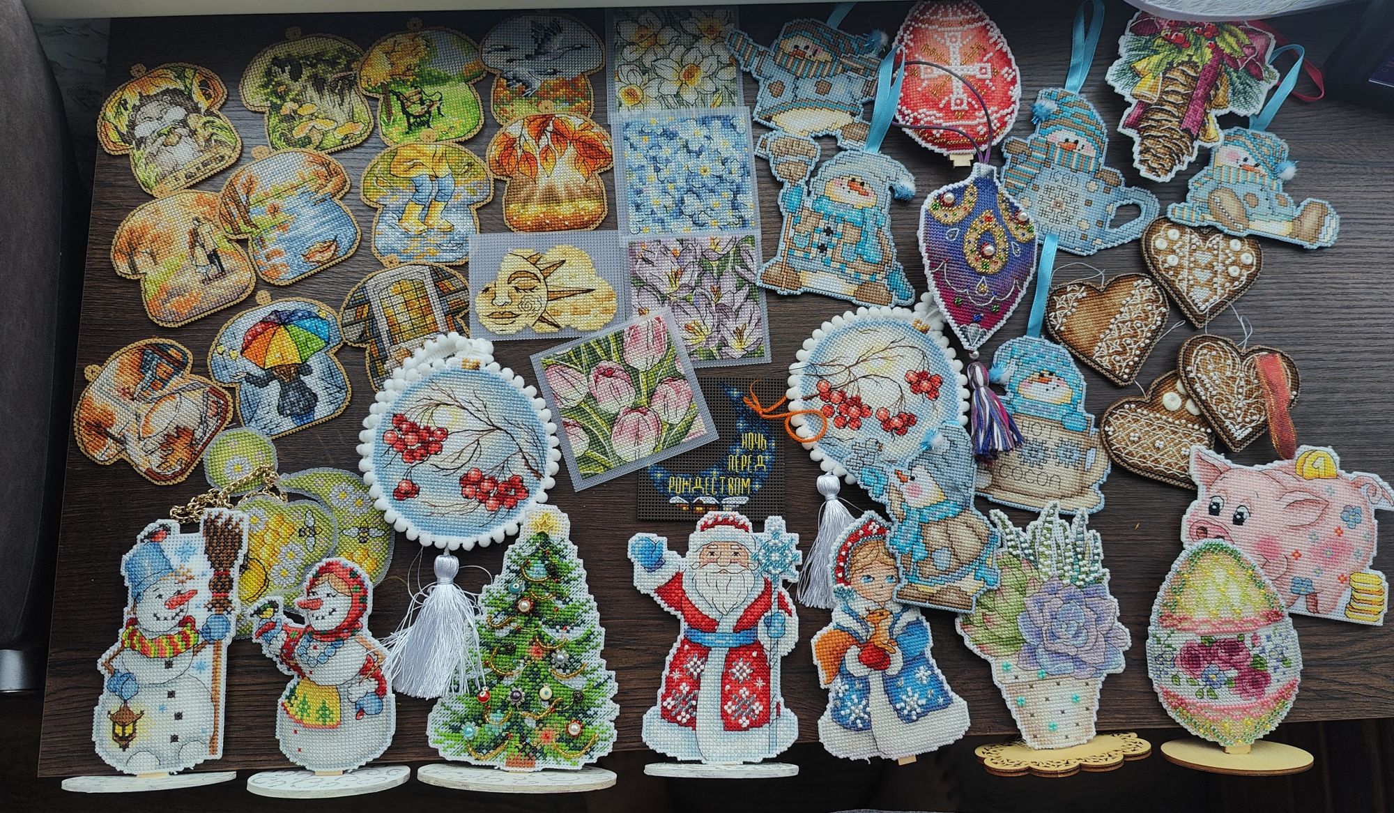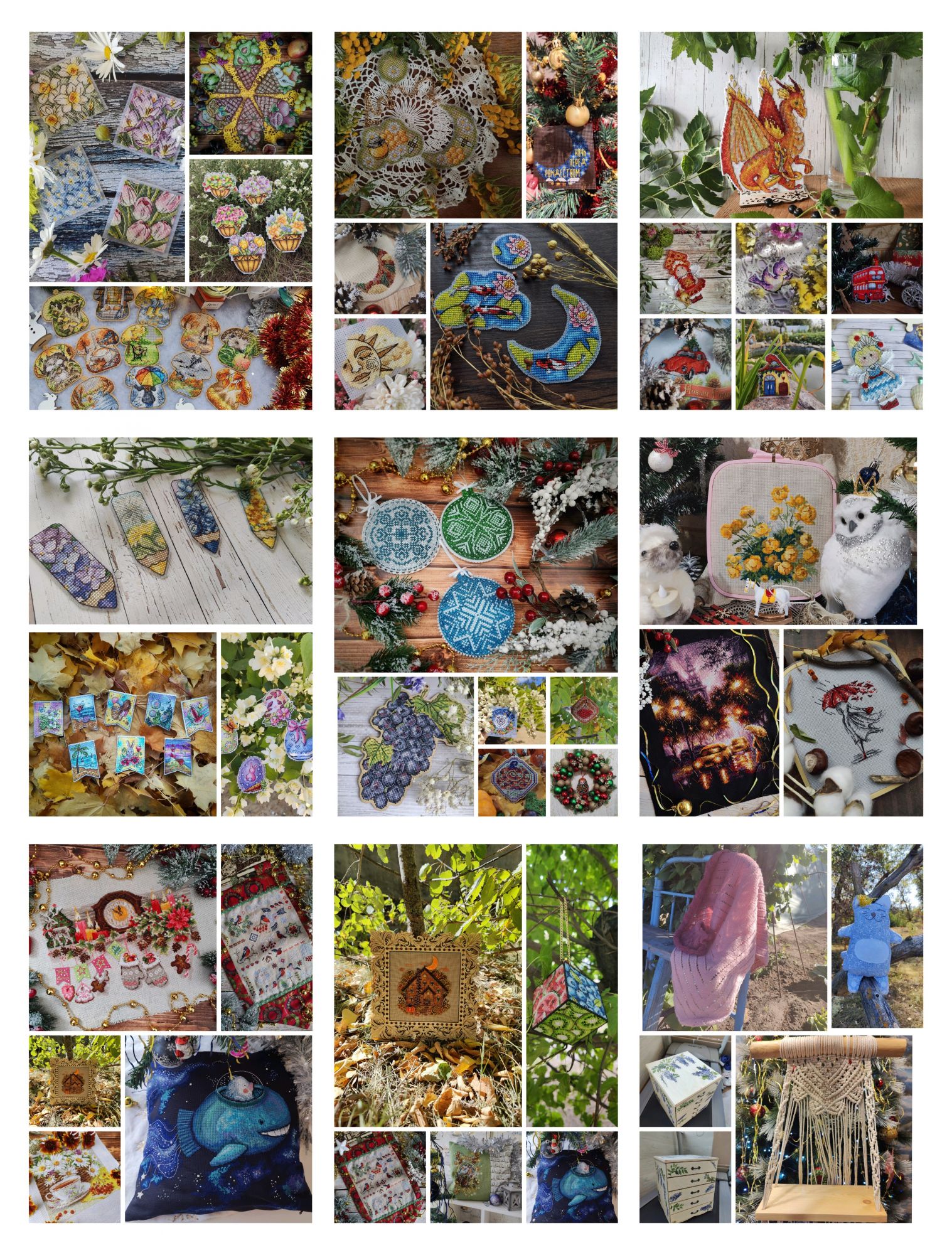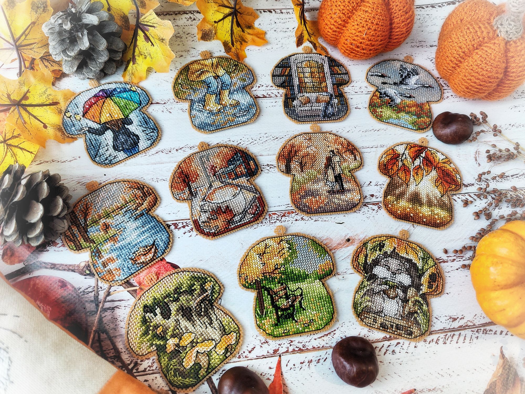 15 декабря 2024 Всем привет! Суетливый декабрь достиг своего экватора, пора бы отчитаться о вышитом. В этот раз не по хронологическому порядку, а отдельными мыслями, которыми хочется закрыть какие-то сюжетные линии вышивальные проекты, а какие-то открыть. Погнали, если непонятно, то по ходу разберёмся. 1. Летние флажки. Я не показала их все вместе, думала в этом году успею дошить хотя бы ещё один, но теперь понимаю - не успею. Так что 8 вышитых за 2024 год флажков вместе: 2. Осенние грибочки. Готов 11-й сюжет И все 11 сюжетов вместе Это осенний урожай. Будет ещё 12-й бонусный грибок, но уже в декабре (отшит, но ещё не сфотографировал), на обложке процесса в гаечке его нет, так что зеленим гаечку, отсюда я уже вышила всё, что хотела. И ещё одна вышитая "за кадром" работа - "Девушка - осень" по бесплатной авторской схеме от Татьяны Бобошко (как раз её я и не успела сфотографировать к прошлому отчёту). История, растянувшаяся на весь год и, похоже это не предел: в январе я участвовала в совместнике "Вышей небо" от группы дизайнеров. Мы отшивали один сюжет (месяц или облако) и получали второй парный. Я успела вышить 5 первых половинок пар, а на вторые после окончания СО у меня всё никак не хватало времени. Одну пару (а в моем исполнении уже трио) я дошила летом, а вот до второй руки дошли только осенью. "Карпы Кои" от Виктории Герасимовой. И на этом мой вышивальный ноябрь закончился, кружок от карпов я вышивала 30-го ноября. И таким образом, статистика за последний осенний месяц выглядит следующим образом. Месяц прошёл достаточно активно, и, если по количеству крестиков он и не стал рекордным, то по количеству финишей побил все рекорды прошлых месяцев - 11 законченных работ (да, какие-то из них были небольшие, а какие-то откровенно маленькие, но та же Рождественская полка абсолютно не относится к маленьким работам). Итак, всего было вышито 18800х в 17 процессах. Несмотря на большое количество финишей, общая сумма начатых процессов увеличилась на 1 (с 18 до 19) ибо стартов было ещё больше - 12 штук. Количество наборов в запасах уменьшилось на 5, а количество авторских схем не изменилось. Почему так? Кроме вышивки, ноябрь оказался ещё богат и на книги. Перечитала 3 уже известных книги, а ещё 5 прочитала/прослушала впервые. Покажу новые Особенно рекомендую "Донецкое море". Я не смогла оторваться от неё, пока не прочитала всю. И практически вся книга читалась со слезами на глазах. А вот на другие виды рукоделия времени у меня не хватило, этот момент я уже начала исправлять в декабре. А от итогов ноября мы плавно переходим к итогам осени. В виде коллажа итоги осени выглядят так: А такими, для сравнения, были планы на осенний сезон: Итак, ожидания от реальности разошлись довольно сильно, но итогами я осталась очень довольна. Закончен давний долгострой - "Звёздное море" от РТО, финишировала, начатая в прошлом году "Рождественская полка" от Риолис, опробован новый для меня производитель - "МаКи студия", причём как на тканевой основе, так и на дереве. А ещё всю осень длился совместник "Осенние грибочки", в рамках которого я успела вышить 11 сюжетов. За осень неплохо продвинулся отшив коллекции летних флажков. И в итоге всё это нашилось в 58820х - рекордный для меня результат за сезон. Но... Ох уж это вечное "но", количество начатых процессов увеличилось с 18 до 19, запасы схем подросли на 6 шт, зато количество наборов ум