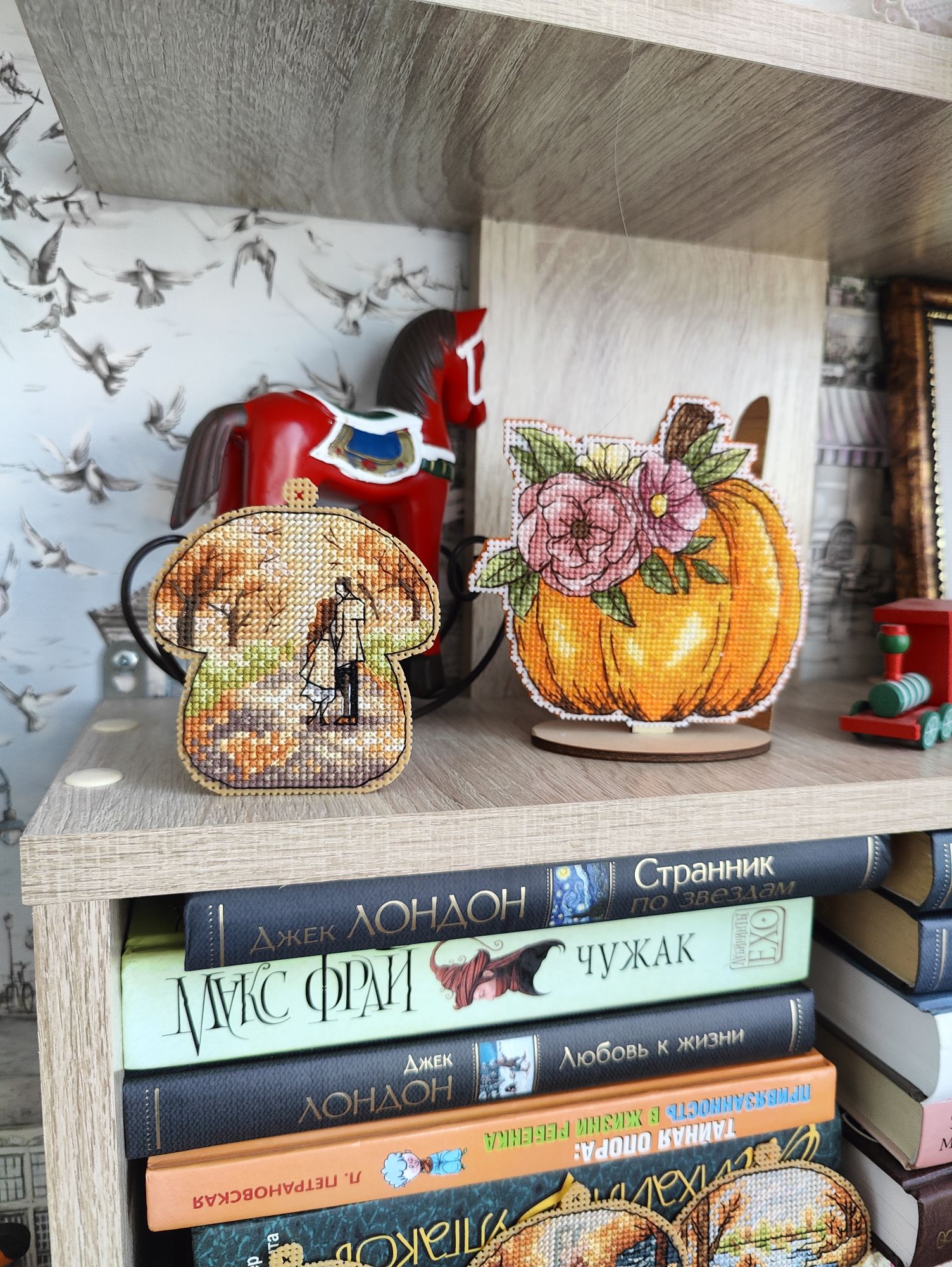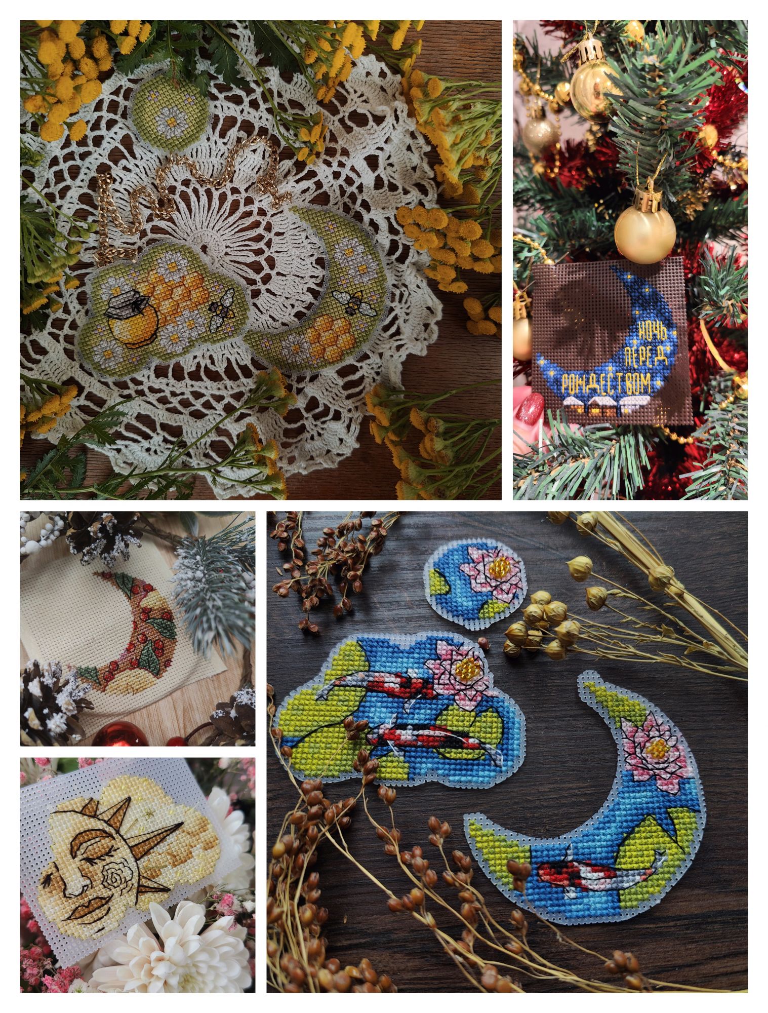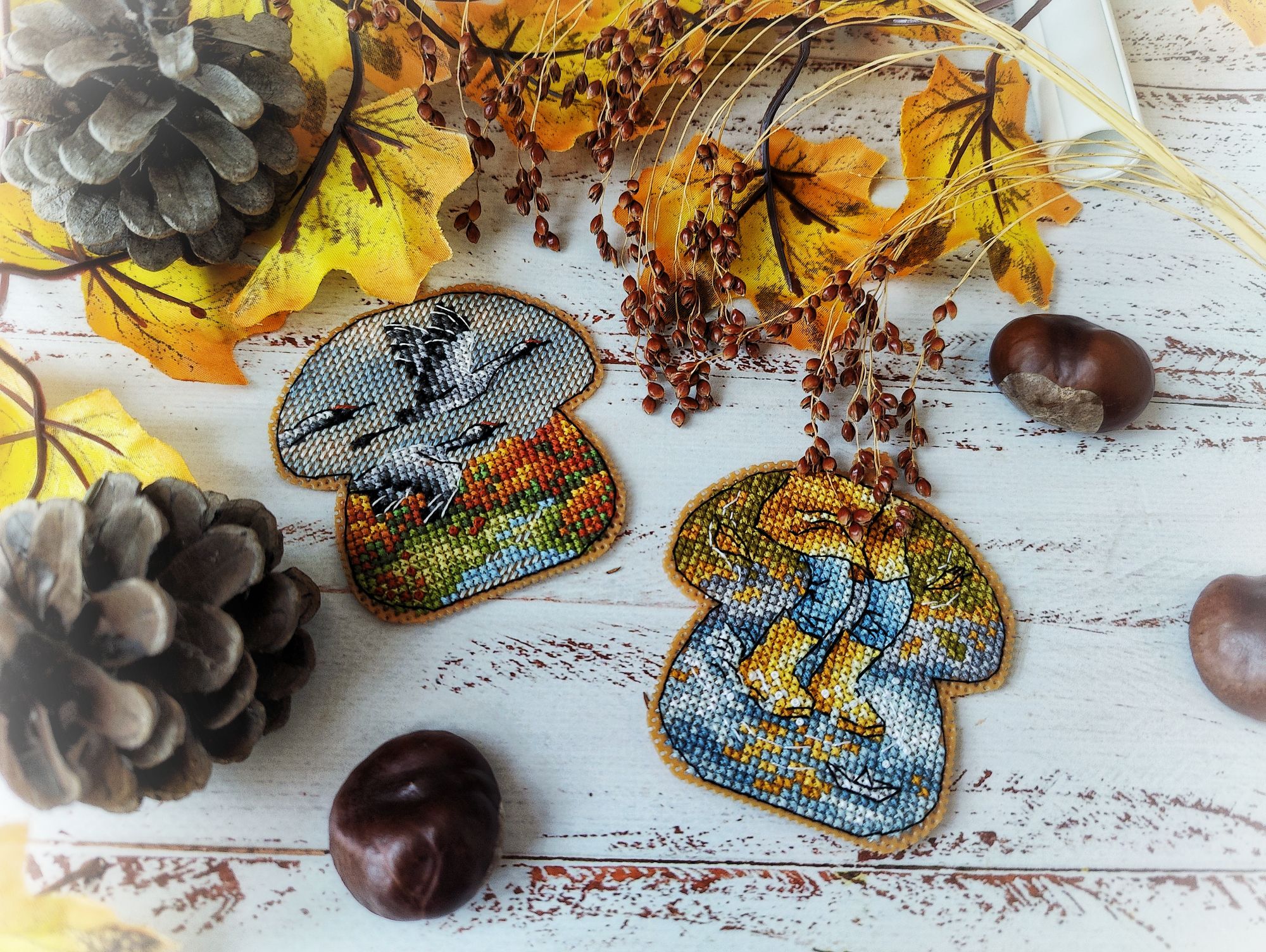 15 декабря 2024 Всем привет! Суетливый декабрь достиг своего экватора, пора бы отчитаться о вышитом. В этот раз не по хронологическому порядку, а отдельными мыслями, которыми хочется закрыть какие-то сюжетные линии вышивальные проекты, а какие-то открыть. Погнали, если непонятно, то по ходу разберёмся. 1. Летние флажки. Я не показала их все вместе, думала в этом году успею дошить хотя бы ещё один, но теперь понимаю - не успею. Так что 8 вышитых за 2024 год флажков вместе: 2. Осенние грибочки. Готов 11-й сюжет И все 11 сюжетов вместе Это осенний урожай. Будет ещё 12-й бонусный грибок, но уже в декабре (отшит, но ещё не сфотографировал), на обложке процесса в гаечке его нет, так что зеленим гаечку, отсюда я уже вышила всё, что хотела. И ещё одна вышитая "за кадром" работа - "Девушка - осень" по бесплатной авторской схеме от Татьяны Бобошко (как раз её я и не успела сфотографировать к прошлому отчёту). История, растянувшаяся на весь год и, похоже это не предел: в январе я участвовала в совместнике "Вышей небо" от группы дизайнеров. Мы отшивали один сюжет (месяц или облако) и получали второй парный. Я успела вышить 5 первых половинок пар, а на вторые после окончания СО у меня всё никак не хватало времени. Одну пару (а в моем исполнении уже трио) я дошила летом, а вот до второй руки дошли только осенью. "Карпы Кои" от Виктории Герасимовой. И на этом мой вышивальный ноябрь закончился, кружок от карпов я вышивала 30-го ноября. И таким образом, статистика за последний осенний месяц выглядит следующим образом. Месяц прошёл достаточно активно, и, если по количеству крестиков он и не стал рекордным, то по количеству финишей побил все рекорды прошлых месяцев - 11 законченных работ (да, какие-то из них были небольшие, а какие-то откровенно маленькие, но та же Рождественская полка абсолютно не относится к маленьким работам). Итак, всего было вышито 18800х в 17 процессах. Несмотря на большое количество финишей, общая сумма начатых процессов увеличилась на 1 (с 18 до 19) ибо стартов было ещё больше - 12 штук. Количество наборов в запасах уменьшилось на 5, а количество авторских схем не изменилось. Почему так? Кроме вышивки, ноябрь оказался ещё богат и на книги. Перечитала 3 уже известных книги, а ещё 5 прочитала/прослушала впервые. Покажу новые Особенно рекомендую "Донецкое море". Я не смогла оторваться от неё, пока не прочитала всю. И практически вся книга читалась со слезами на глазах. А вот на другие виды рукоделия времени у меня не хватило, этот момент я уже начала исправлять в декабре. А от итогов ноября мы плавно переходим к итогам осени. В виде коллажа итоги осени выглядят так: А такими, для сравнения, были планы на осенний сезон: Итак, ожидания от реальности разошлись довольно сильно, но итогами я осталась очень довольна. Закончен давний долгострой - "Звёздное море" от РТО, финишировала, начатая в прошлом году "Рождественская полка" от Риолис, опробован новый для меня производитель - "МаКи студия", причём как на тканевой основе, так и на дереве. А ещё всю осень длился совместник "Осенние грибочки", в рамках которого я успела вышить 11 сюжетов. За осень неплохо продвинулся отшив коллекции летних флажков. И в итоге всё это нашилось в 58820х - рекордный для меня результат за сезон. Но... Ох уж это вечное "но", количество начатых процессов увеличилось с 18 до 19, запасы схем подросли на 6 шт, зато количество наборов ум