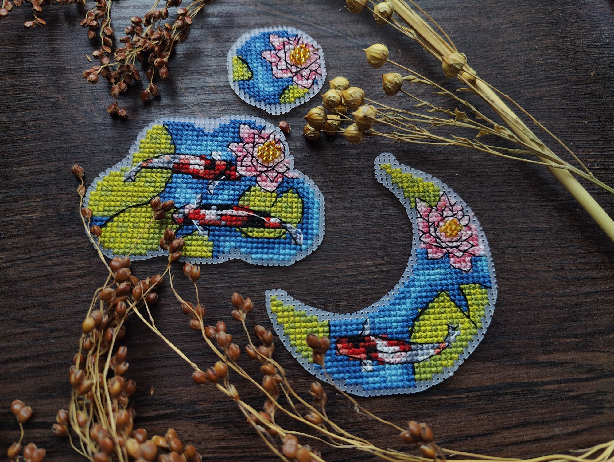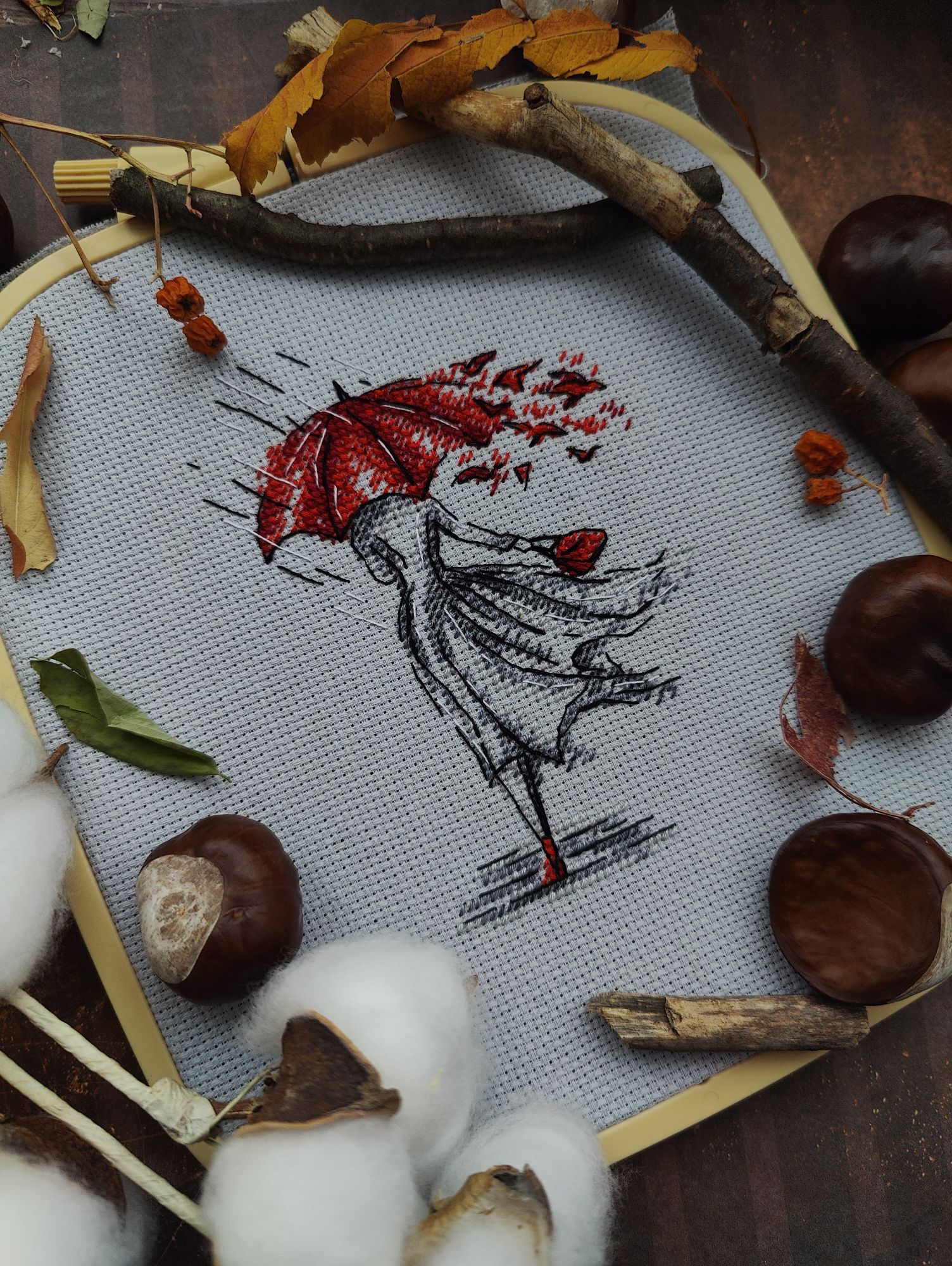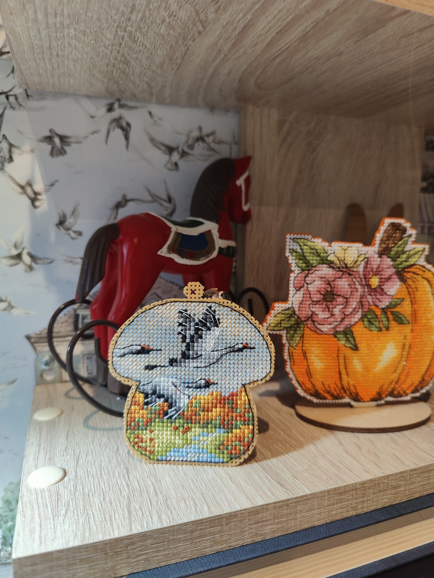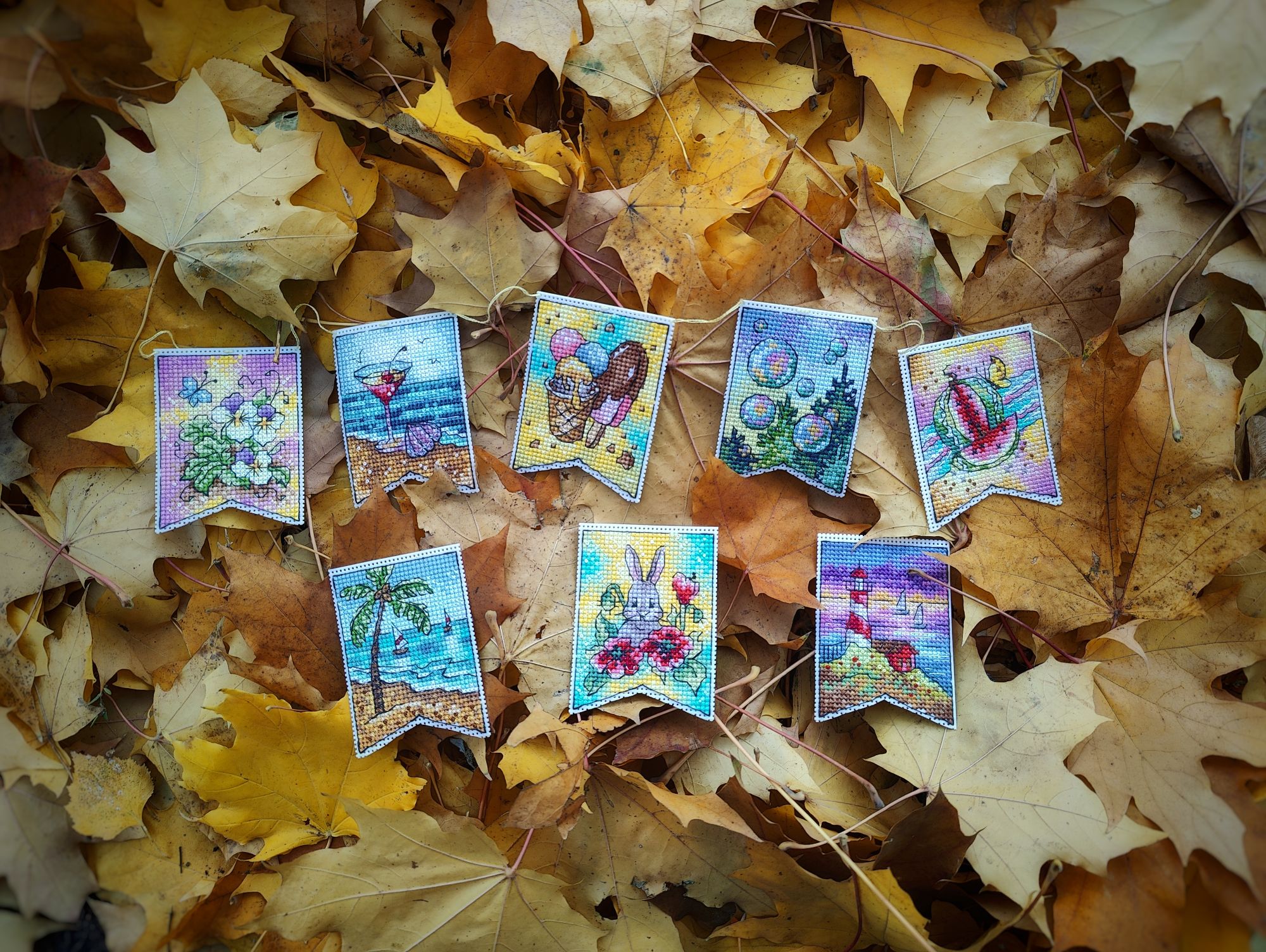 15 декабря 2024 Всем привет! Суетливый декабрь достиг своего экватора, пора бы отчитаться о вышитом. В этот раз не по хронологическому порядку, а отдельными мыслями, которыми хочется закрыть какие-то сюжетные линии вышивальные проекты, а какие-то открыть. Погнали, если непонятно, то по ходу разберёмся. 1. Летние флажки. Я не показала их все вместе, думала в этом году успею дошить хотя бы ещё один, но теперь понимаю - не успею. Так что 8 вышитых за 2024 год флажков вместе: 2. Осенние грибочки. Готов 11-й сюжет И все 11 сюжетов вместе Это осенний урожай. Будет ещё 12-й бонусный грибок, но уже в декабре (отшит, но ещё не сфотографировал), на обложке процесса в гаечке его нет, так что зеленим гаечку, отсюда я уже вышила всё, что хотела. И ещё одна вышитая "за кадром" работа - "Девушка - осень" по бесплатной авторской схеме от Татьяны Бобошко (как раз её я и не успела сфотографировать к прошлому отчёту). История, растянувшаяся на весь год и, похоже это не предел: в январе я участвовала в совместнике "Вышей небо" от группы дизайнеров. Мы отшивали один сюжет (месяц или облако) и получали второй парный. Я успела вышить 5 первых половинок пар, а на вторые после окончания СО у меня всё никак не хватало времени. Одну пару (а в моем исполнении уже трио) я дошила летом, а вот до второй руки дошли только осенью. "Карпы Кои" от Виктории Герасимовой. И на этом мой вышивальный ноябрь закончился, кружок от карпов я вышивала 30-го ноября. И таким образом, статистика за последний осенний месяц выглядит следующим образом. Месяц прошёл достаточно активно, и, если по количеству крестиков он и не стал рекордным, то по количеству финишей побил все рекорды прошлых месяцев - 11 законченных работ (да, какие-то из них были небольшие, а какие-то откровенно маленькие, но та же Рождественская полка абсолютно не относится к маленьким работам). Итак, всего было вышито 18800х в 17 процессах. Несмотря на большое количество финишей, общая сумма начатых процессов увеличилась на 1 (с 18 до 19) ибо стартов было ещё больше - 12 штук. Количество наборов в запасах уменьшилось на 5, а количество авторских схем не изменилось. Почему так? Кроме вышивки, ноябрь оказался ещё богат и на книги. Перечитала 3 уже известных книги, а ещё 5 прочитала/прослушала впервые. Покажу новые Особенно рекомендую "Донецкое море". Я не смогла оторваться от неё, пока не прочитала всю. И практически вся книга читалась со слезами на глазах. А вот на другие виды рукоделия времени у меня не хватило, этот момент я уже начала исправлять в декабре. А от итогов ноября мы плавно переходим к итогам осени. В виде коллажа итоги осени выглядят так: А такими, для сравнения, были планы на осенний сезон: Итак, ожидания от реальности разошлись довольно сильно, но итогами я осталась очень довольна. Закончен давний долгострой - "Звёздное море" от РТО, финишировала, начатая в прошлом году "Рождественская полка" от Риолис, опробован новый для меня производитель - "МаКи студия", причём как на тканевой основе, так и на дереве. А ещё всю осень длился совместник "Осенние грибочки", в рамках которого я успела вышить 11 сюжетов. За осень неплохо продвинулся отшив коллекции летних флажков. И в итоге всё это нашилось в 58820х - рекордный для меня результат за сезон. Но... Ох уж это вечное "но", количество начатых процессов увеличилось с 18 до 19, запасы схем подросли на 6 шт, зато количество наборов ум