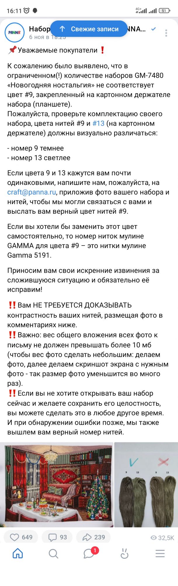 11 ноября Панна заявила что в новом наборе Новогодняя ностальгия произошла путаница в нитках с номерами 9 и 13 lunamitara, relax_cross_stitch, Маса и 5 других сказали спасибо Поделиться сообщением Ссылка на сообщение