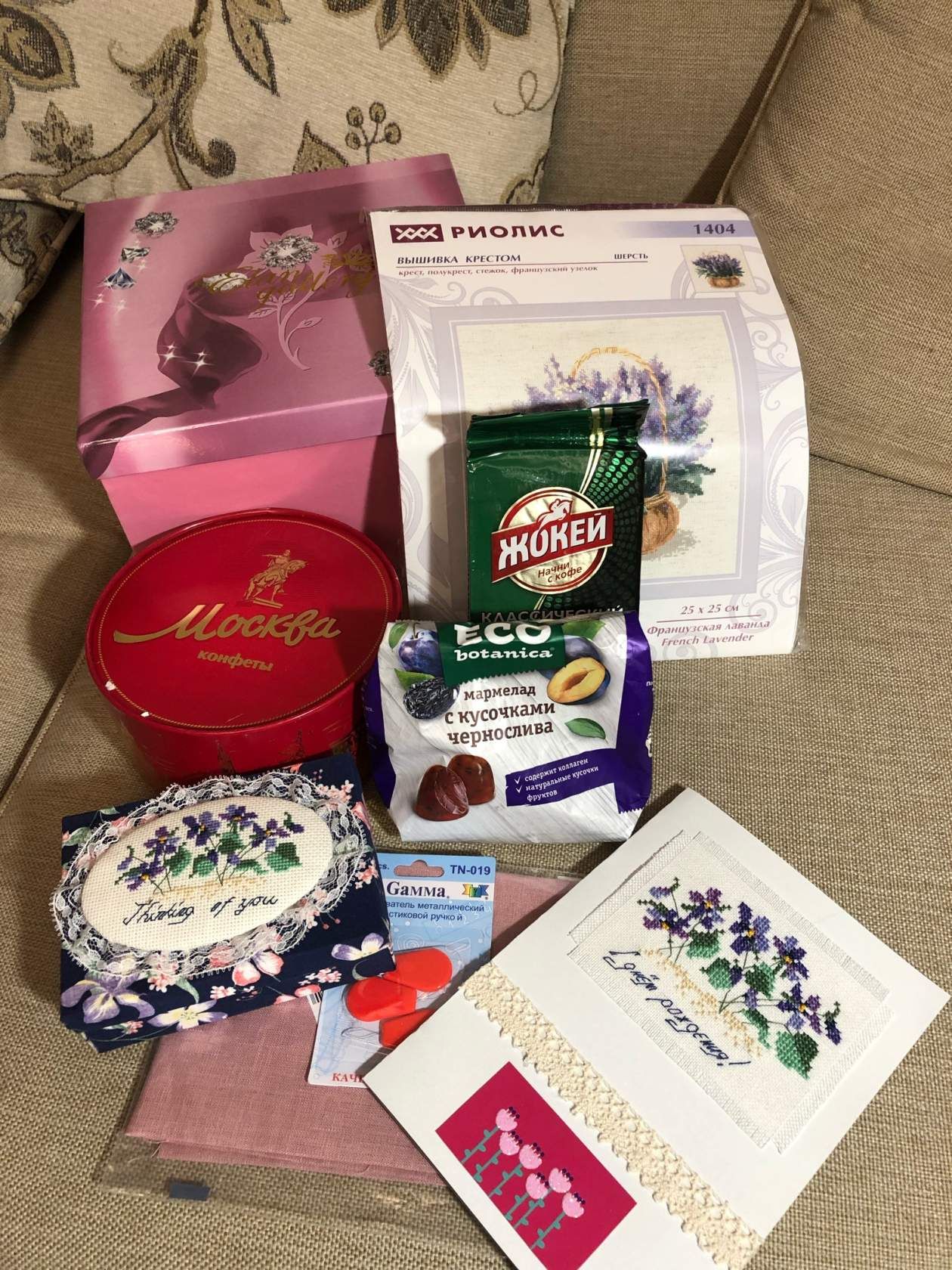 13 декабря 2018 Всем привет! Девочки, у меня сегодня радость, да не одна, а двойная!!! Я получила 2 подарка, один из которых партизанский! Партизанкой оказалась Лена ( dolli7)! В подарке наборчик, схемы-открытки, каталог, магниты и маячок для ножниц! Леночка, спасибо! Второй подарок от Светы (letka)! Это не подарок, а подарище! Целая коробка сокровищ! Нежнейшая открыточка, выполненная на равномерке, с кружевами и самыми добрыми пожеланиями! В пару к открытке, сделанная своими руками, коробочка и тоже с вышивкой и кружевами! Просто милейшая прелесть! Набор из хочушек , нитковдеватели, отрез равномерки розового цвета и сладости с моим любимым кофе! Вот весь подарок во всём своём великолепии! Света, спасибо большущее!!! Спасибо, мои дорогие феюшки! День рождения продолжается!!! yuss, sette venerdi, Пикусёнок и 15 других сказали спасибо Поделиться сообщением Ссылка на сообщение