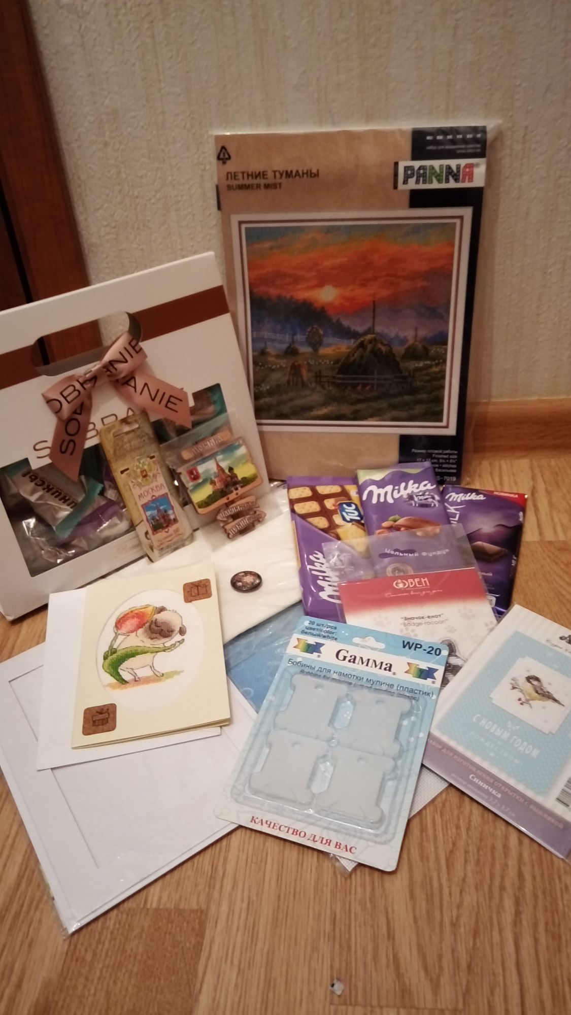 29 декабря 2018 Итак, всем привет! Пока на работе небольшое затишье, попробую похвалиться своими подарками Девочки, это непередаваемое ощущение, когда ты несешь с почты не одну посылку...Раскрываешь дома и понимаешь, вот он Клондайк, Эльдорадо.... Сколько было заботы и тепла в каждом подарке, такой уют от них исходил, что казалось, праздник наступил снова и даже не ДР, а уже НГ. Настолько уже один праздник плавно перетек в другой .. Ладно, не буду томить и начну. Первый подарок распакован был от Юленьки Yuss . Смотрите, какая гора сокровищ !!!! Чего тут только нет: и много сладкого (шоколад и коробка интересных конфет) и рукодельных штучек и наборы...Я в диком просто восторге. Это можно копаться и копаться... Мой понравившейся пейзаж от Панны, из списка желаний..... Я кстати,сначала формировала вкладку специально под игру, а потом удалила, посчитала, пусть каждый подарит, что захочет. . И потому вдвойне приятно получать то, что действительно хотелось и планировалось к закупке.. К тому же там были еще два мини наборчика. Такая ПРИЯТНОСТЬ, что не передать...Дочка, на удивление, вцепилась в енота и сказала, что просто я обязана его вышить ей.. Магниты -на холодильнике есть место! Я люблю их собирать. Живу в Москве, но такого города у меня нет... Равномерка, тонированная канва (ее я хотела очень попробовать) и много всего -всего.... А главное - это открытка!!! Она такая смешная и вызывает улыбку. Смотрите сами. Правда, хороша??? Милаха просто!!!@ И поподробнее Юлечка, спасибо тебе огромное-преогромное ! Мне так понравился твой подарок!!!!!!!!! Все настолько по душе, что настроение не отпускает)) Ты угадала во всем! Спасибо! Продолжение следует... nogres, Ксен40, K_AnnA_D и 12 других сказали спасибо Поделиться сообщением Ссылка на сообщение