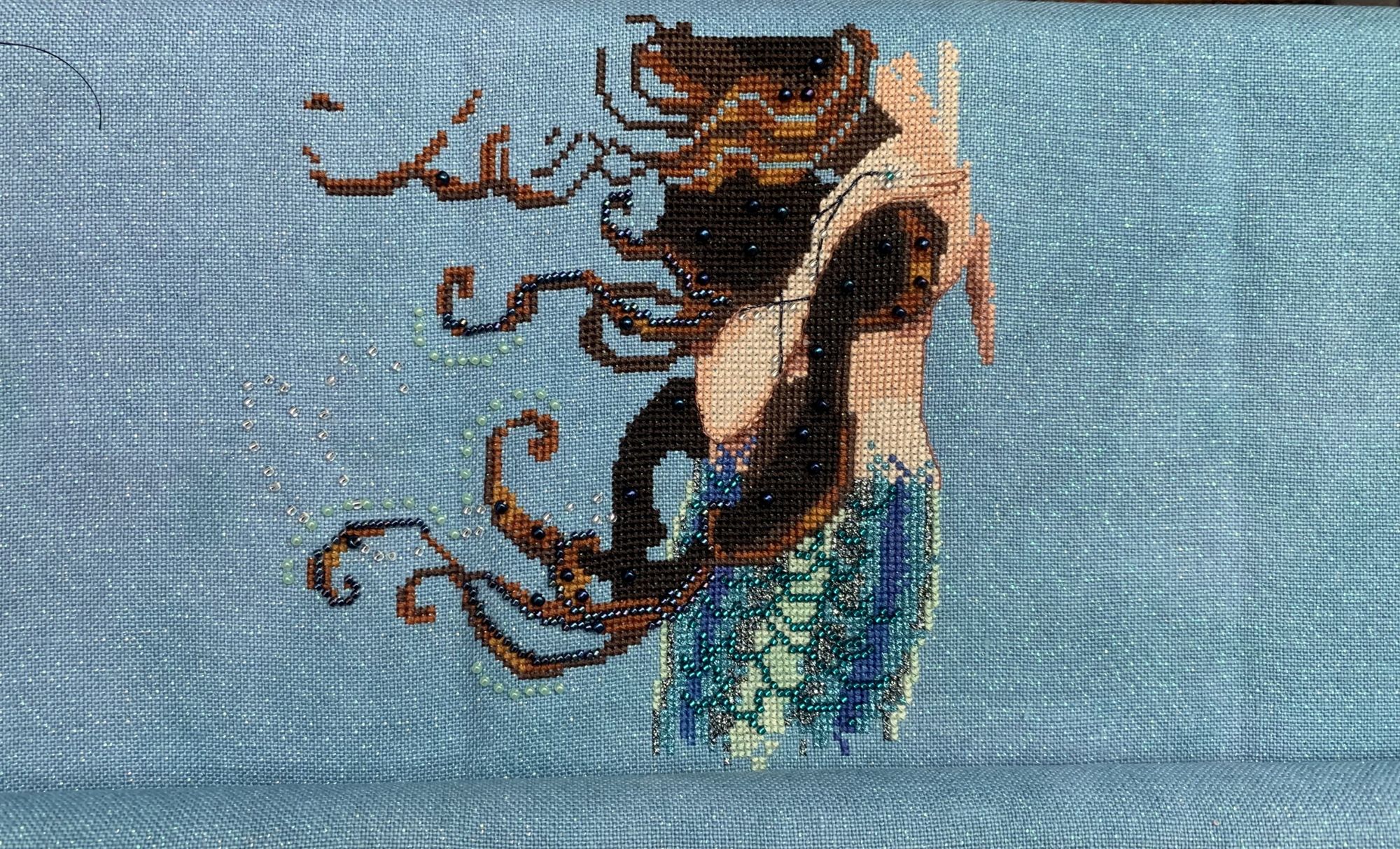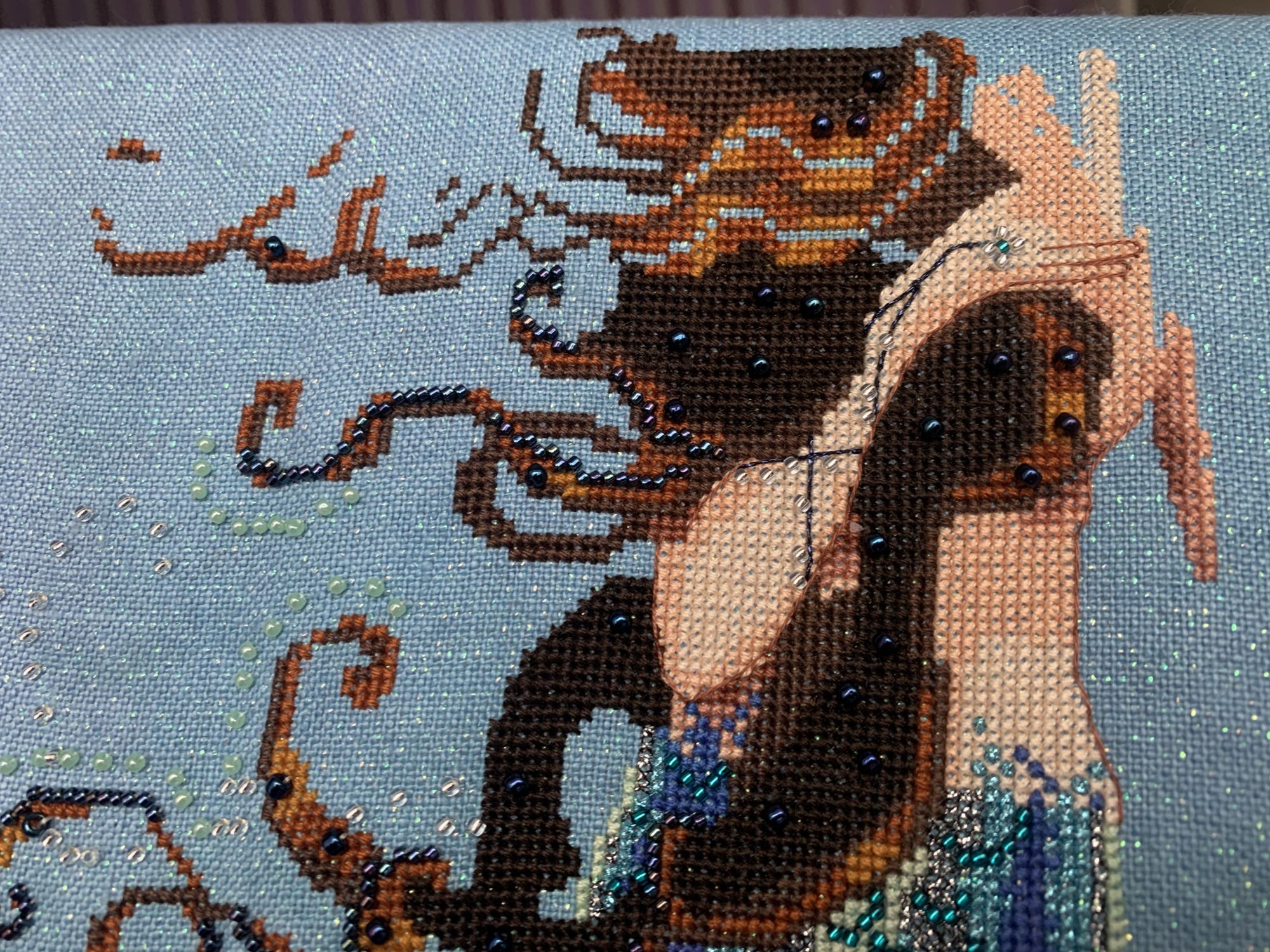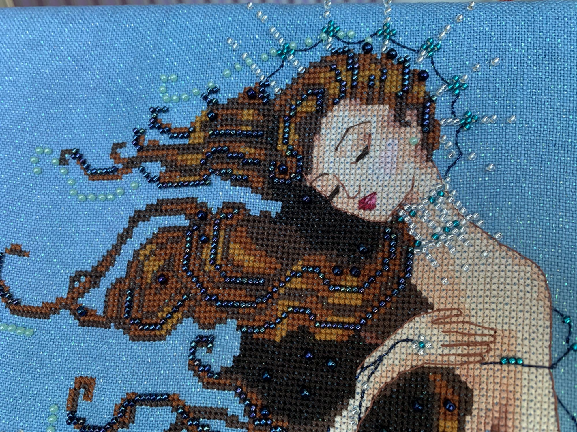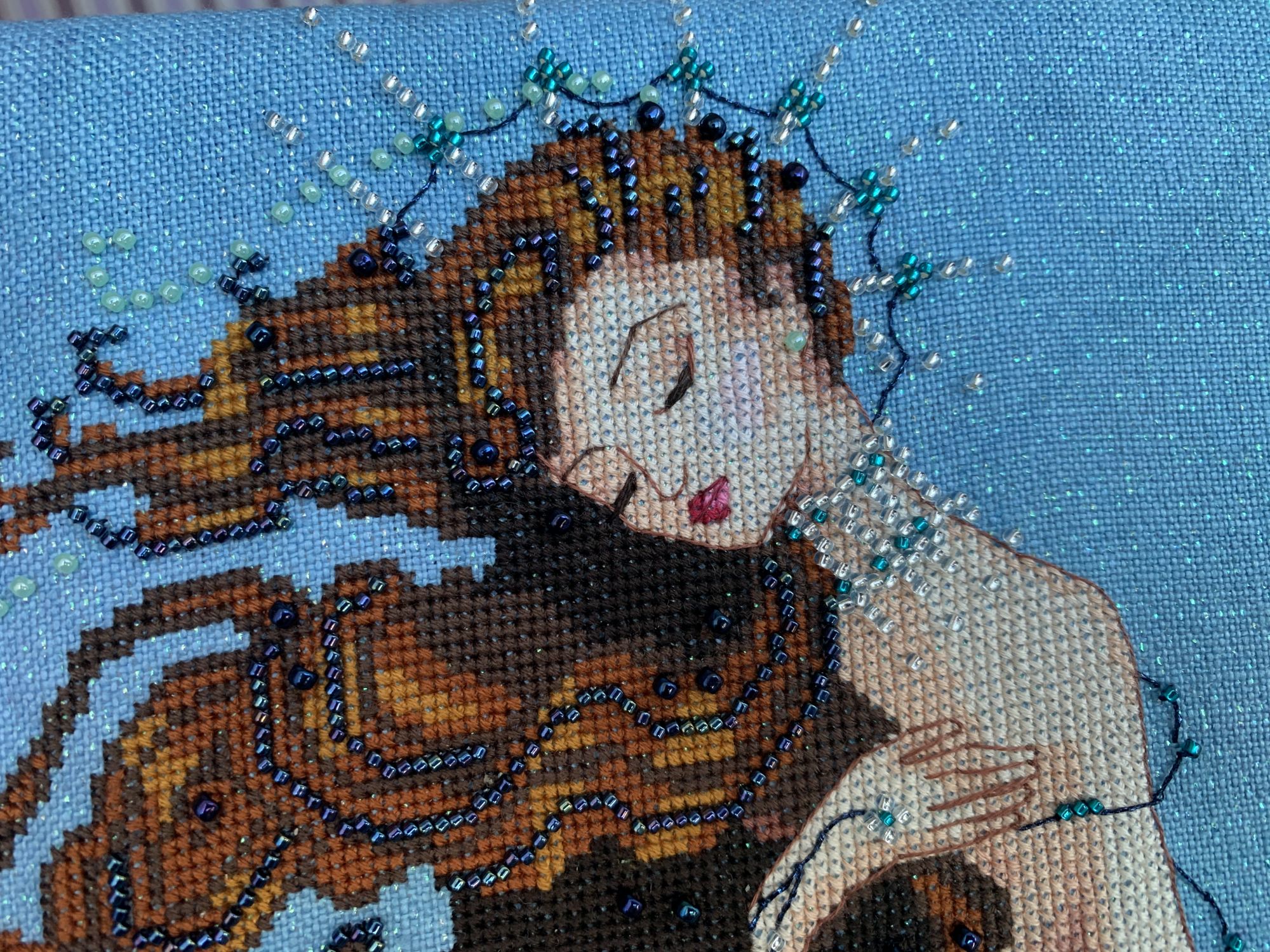 4 февраля 2020 1 час назад, jenny064 сказал(а): Angeltwins, Наташа, на плечах и шее у дамы цветочки это Карон? И мне показалось, там, где закрутка на раму, уже бисер пришит? И закручено так плотно, по моим ощущениям. Для бисера это неопасно? Животрепещущий вопрос, потому что самой скоро канву с бисером на раму закручивать. Но это технические вопросы. А так здорово, необычные украшения, необычное платье. У этой Помпадурши даже кожа необычного оттенка. Недаром жена пекаря. Мерси) Здесь всего два цвета кэрона. Один ( бежево-серый) используется в рамке и ветках цветов, а второй ( сиреневый) -в подоле платья, кексе у дамочки в руках и немного в волосах. Все цветы вышиваются DMC. Бисера здесь пока нет. Оставила напоследок. Наверное, до конца жизни его пришивать буду А для закрутки на раму купила спецом фетр. Конечно же, когда буду пришивать бисер, натяжку ослаблю. Думаю начать пришивать сверху, так как его там основная концентрация. ната16, JanaTX, SimreAniri и 1 другой сказали спасибо Поделиться сообщением Ссылка на сообщение