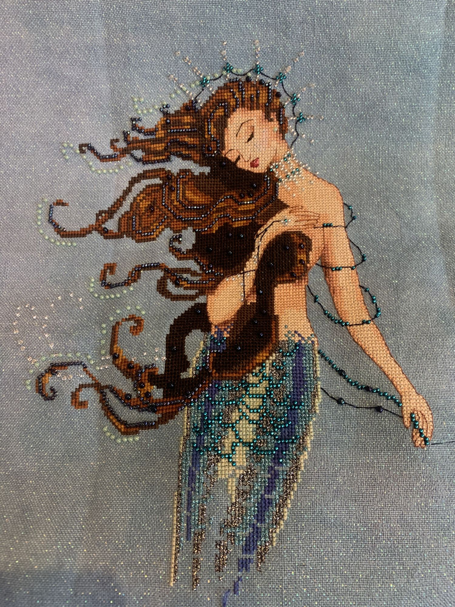 11 февраля 2020 Соскучилась по всему блестящему, поэтому наконец-то начинаю Русалку Ренессанс. Как только я ее увидела, сразу влюбилась, и вот спустя 3 года я ее наконец начинаю. Основа белфаст 32 каунта ручного окрашивания с люрексом. Бисер милл хилл и тохо. Трежерсы Сваровски, у меня несколько вариантом, буду выбирать уже, когда отошью. Металлик крейник и rainbow gallery jenny064, SimreAniri, Angeltwins и 13 других сказали спасибо Поделиться сообщением Ссылка на сообщение