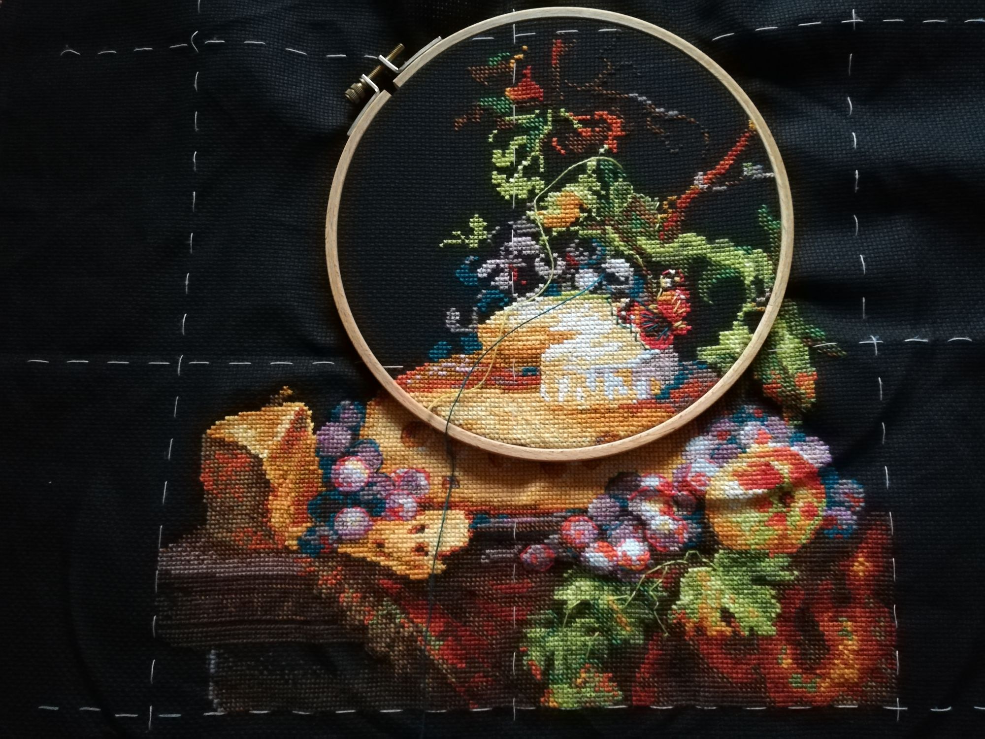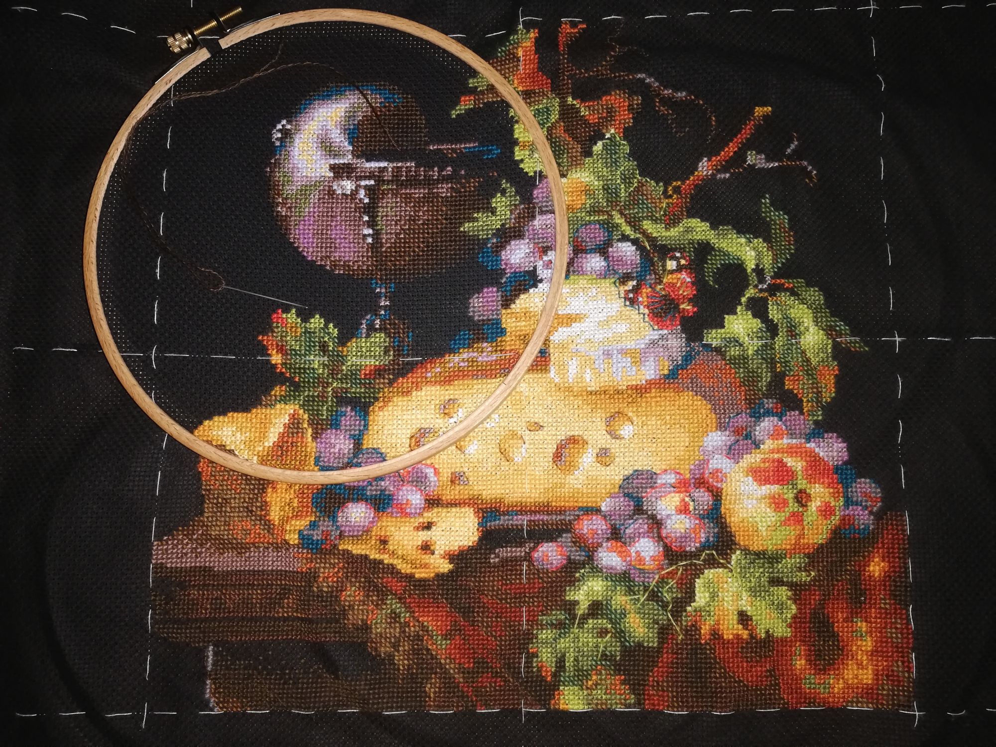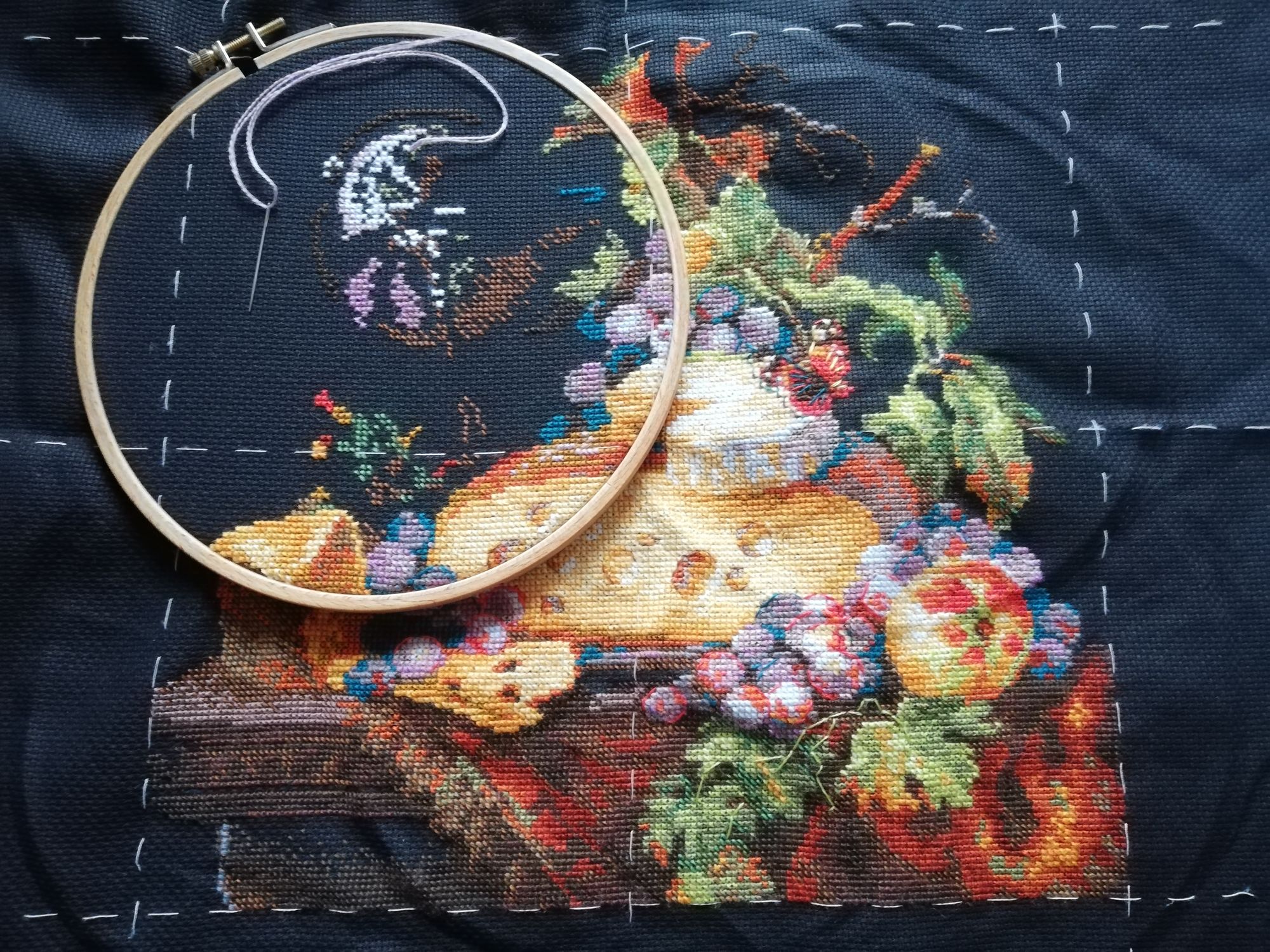 18 октября 2021 У меня сломался утюг, поэтому красивые фоточки при дневном освещении выходного дня, ради которых я и задерживала отчёт, накрылись((( так что покажу как есть Сейчас будут дифирамбы. Много дифирамбов На дизайн я соблазнилась, потому что просто люблю сыр) И, на самом деле, не ждала ничего особенного, но... Выбор весной этого дизайна оказался буквально попаданием в яблочко!!! Давненько ни один хоть сколько-то объёмный процесс не захватывал меня настолько, что я буквально не могла оторваться, от старта и до самого финиша! Сочные тона ниток, интересная проработка дизайна, с крестом и полукрестом как в 1, так и 2 нити, волшебно выглядящий итог и щепотка пикантных приправ - шерстяные нитки и чёрная основа - вот он, рецепт чуда Ну и Таня @vasilisa-1977, большое спасибо за компанию! Шить совместно оказалось вдвойне классно! Фото, было: --- стало (неделю назад я к выходным подпростыла и осталась дома) : --- и готово: . Очень аппетитно По комплектации - мне нравится шерстяной Риолис с новой намоткой на плашки) Конечно, говорят, что на бобинках ниток кладут меньше, чем моточками, но в этот раз без неожиданностей - ниток осталось много) Лишь про пару цветов у меня есть сомнения, что их хватит на повтор. Этих тонов и было-то немного, и осталось скромно. А, и у одного цвета, которого было 2 бобинки намотано, первой половины буквально на 1 нитку не хватило. Схема цветная и удобная, очень легко читается)) Мозг немного буксовал на участках, где соседствовали крест и полукрест одним цветом, но тоже интересная тренировка по прокладыванию маршрутов))) И немного статистики: Число крестиков: 17057 + 267 бэка (17324) Вышивалось: с 4.04.2021 по 11.10.2021, и это уже 8 финиш за год! Всего дней: 191 (в среднем по 89 крестиков и суммарно по 91 в день) Дней вышивки: 86 (в среднем по 198 крестиков и суммарно по 201 в день) Максимум: 1431 (чуть-чуть не дотянулась до Альгамбры, но там-то был полукрест в небе, а здесь преимущественно честные крестики) Процент бэка: 1,54% Другие процессы тоже немного подрастила)) Горыныч обзавелась филейной частью , было: --- стало: . Баклажанчик передвинулся в пяльцах, было: --- стало: . Уже успела вернуться к начинаниям прошлого апреля)) По обоим процессам соскучилась! На Совете добавилась "норма на месяц", но если руки вновь к нему потянутся, я противиться не стану))) А Апельсинки надеюсь в следующий раз показать))) tulipe, Грёза, Marusya1978 и 9 других сказали спасибо Поделиться сообщением Ссылка на сообщение