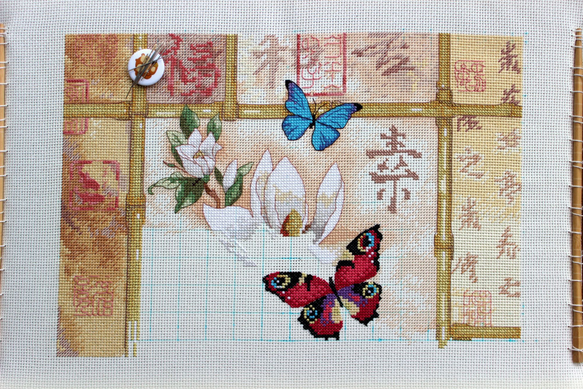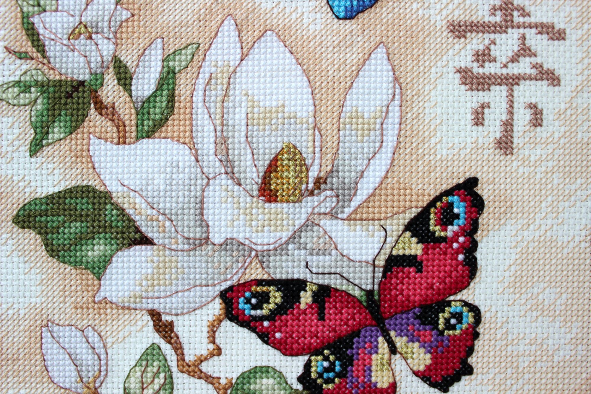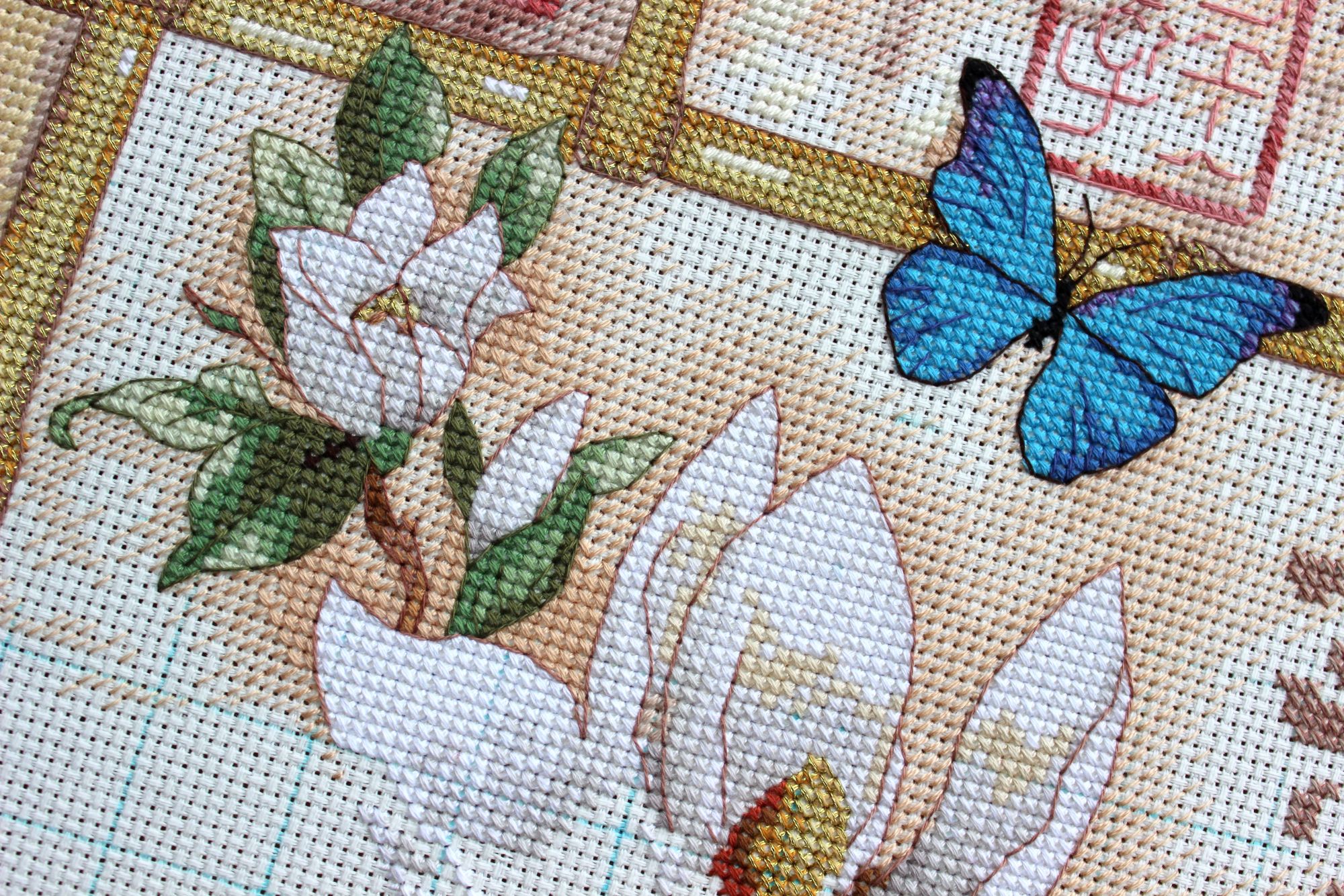 7 января 2023 Время обожаемых мною бабочек) "Brilliant Butterfly Celebration" Dimensions 35063 Впервые я увидела этот дизайн не в сети, а вышитым. Он лежал уже натянутый в багетной мастерской возле моего универа. Вышивка в тот момент лежала возле окна и заманчиво сверкала золотыми ниточками Учитывая, что я люблю бабочек в жизни, в вышивке и мне нравится восточная тематика, набор крепко и надолго запал мне в душу. Много лет спустя я купила его себе в Леонардо на 8 марта. Упаковка была жутко потрепанная и мне казалось, что я просто спасаю его оттуда) Почистила её дома, проклеила и спустя какое-то время начала вышивать. Для голда набор не сложный. Попыхтеть меня заставлял золотистый бамбук. Там золотые ниточки никак не хотели держать натяжение в блендах вместе с хлопковыми и я поправляла натяжение металлика в каждом стежке. Мне очень нравится, как это смотрится в итоге, так что старалась не зря) Очень много полукреста. Крестики все в центральном сюжете - магнолии и бабочки. Никаких мудреных комбинаций, они вышивались комфортно. Цветовая гамма всего набора мне очень по душе И финальные после стирки и глажки) Очень рада, что она у меня есть) Хотела бы в этом году оформить Kattrielle, Каори, Bogdan и 27 других сказали спасибо Поделиться сообщением Ссылка на сообщение