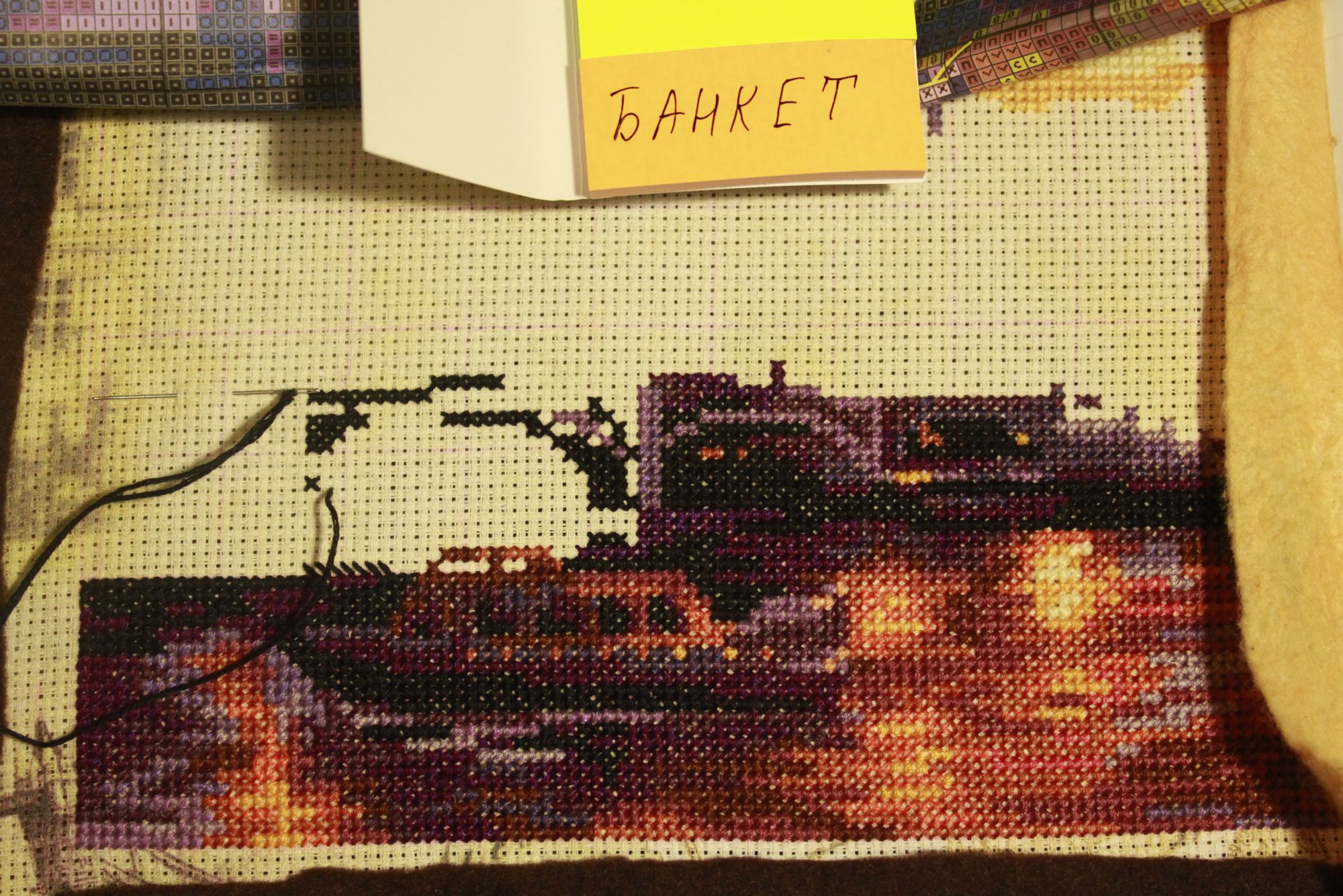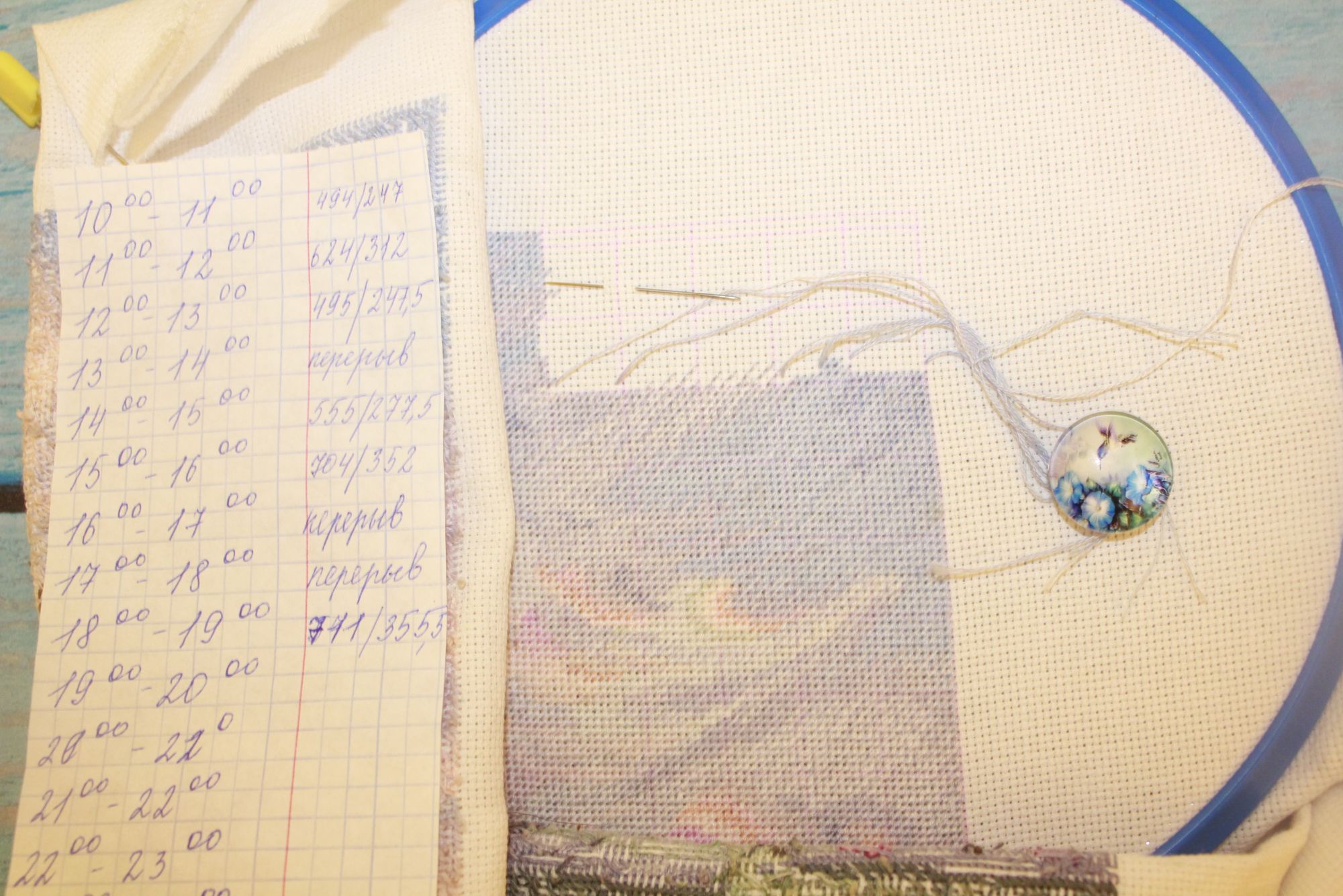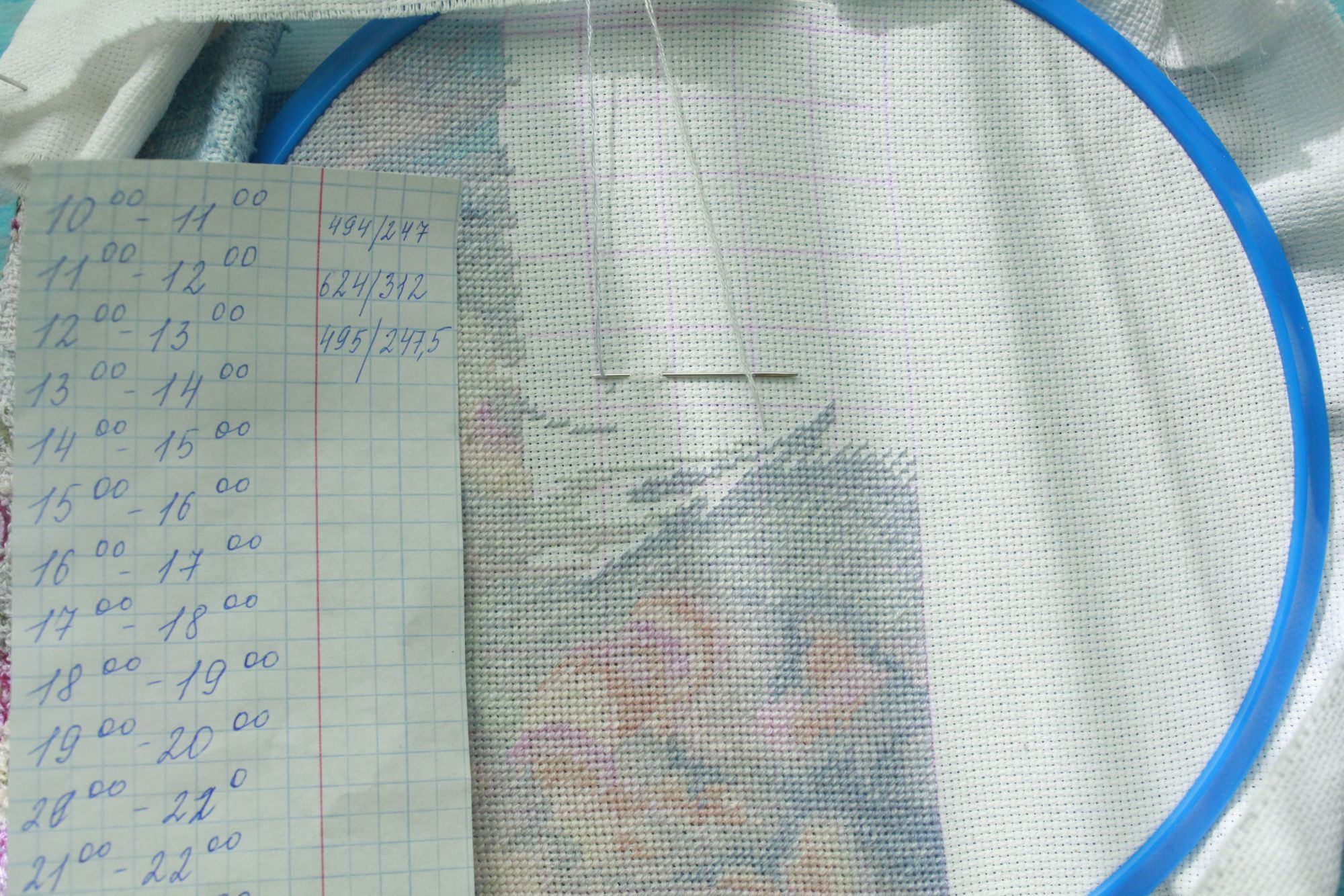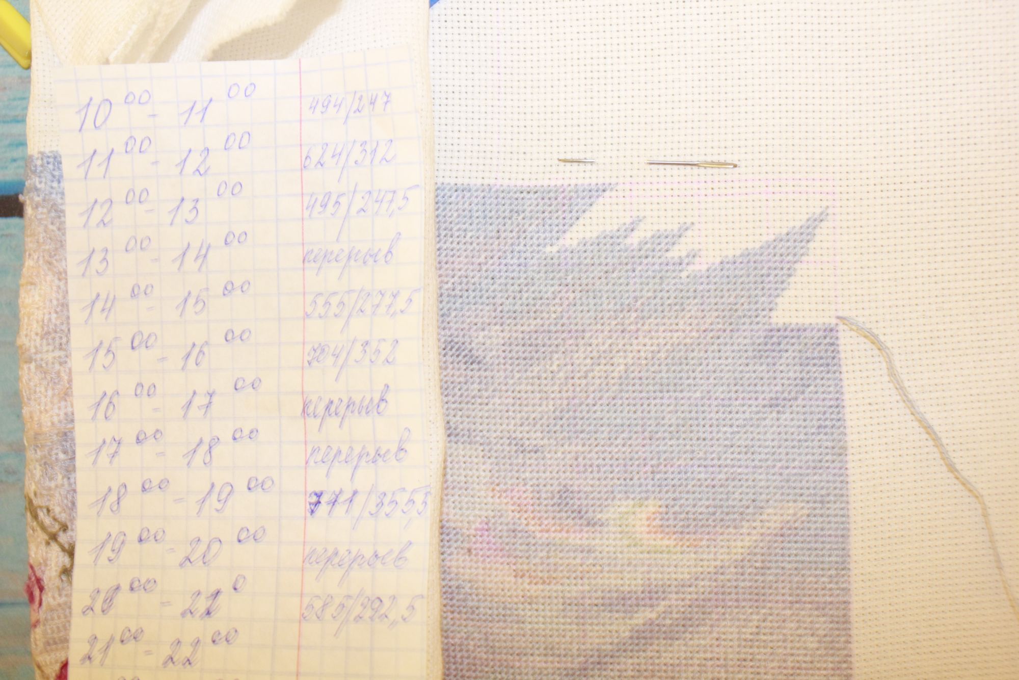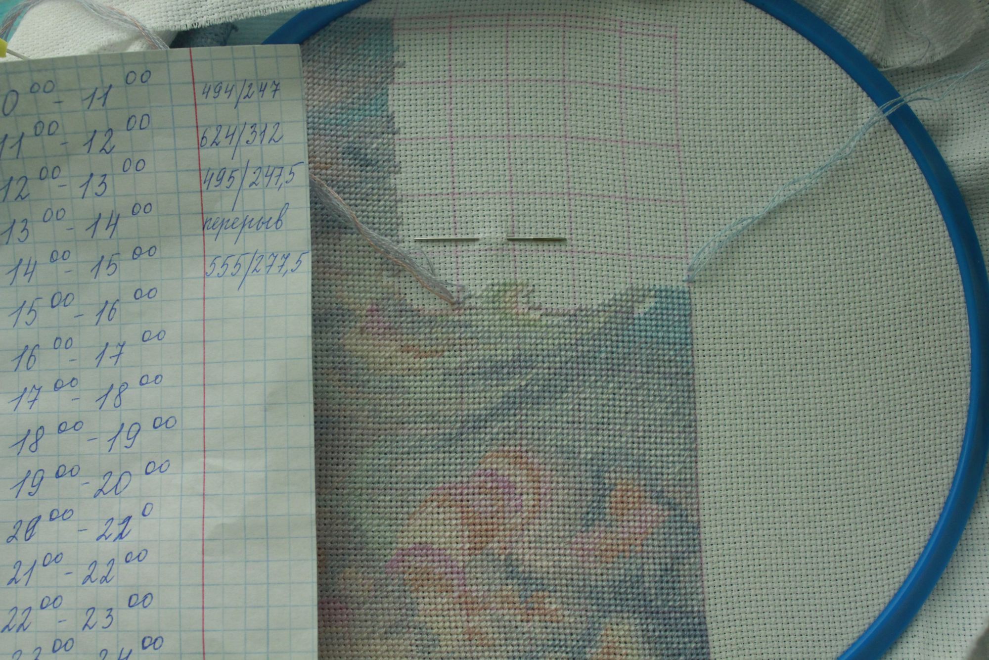 28 марта 2019 Всем привет! Вот и пришла пора показать, что я успела наваять за 16 дней. Пришла я к вам с двумя готовыми работами: "Берлин" и "Фрегат" закончены! Вот так подрастал мой "Берлин" от Риолис, его продвижению помогла игра в вк "Черепашьи горки"(. Хорошее фото будет после багетки в начале апреля) Там мы еженедельно отшиваем по 3000 крестиков и попутно играем в разные мини-игры на скорость, на финиши и т.д. А сейчас нам дали задания вышивать три дня одну работу, устроить себе "День сурка". Благодаря этой игре я как ошалелая вышивала свой "Фрегат-гладиолус" от Е.Волковой и в итоге, вчера в 22:19 закончила его. Сейчас очень популярны на Ютубе видео "Вышивальный марафон", где блогеры определяют свои возможности по скорости вышивки. Многие вышивают все 24 часа, кто-то чуть меньше. Мне захотелось тоже проверить свои силы, выяснить свою среднюю скорость в вышивке. Вот как это было: Мой вышивальный марафон начался вчера 27.03.2019 года в 10:00 утра по Мск, правда осложнилось всё начавшейся ангиной, общей слабостью и повышенной температурой. Но отменять я уже ничего не стала, игра ждала от меня финиша. Вот такой участок мне предстояло отшить, это около 4500 символов. Для удобства количество полукрестиков я делила на 2, чтобы получить количество крестиков. Далее я так и стала отмечать на листке свои результаты. Вышивала по бумажной схеме, отмечала в Саге отшитое и вписывала результат. Начало было довольно бодрым, я вышивала милое зефирно-розовое облачко. В итоге через час был такой результат: 494 полукр./247 кр. Для удобства закрашивания в программе старалась вышивать строго полосами и отрезать лишнюю часть схемы. Результат второго часа: 624 полукр./312 кр. Третий час дал результат 495/247,5 кр. Далее я отправилась выгуливать собаку, поэтому в моём отчёте стоит слово "перерыв". На четвёртом часу вышивания я выдала 555 полукрестиков/277,5 кр. Затем был довольно просто участок с двумя цветами в 704 полукрестика/352 кр. После этого была повторная прогулка с собакой, поздний обед и листание вк. Два часа ушло на это, а потом был мой рекорд в 711 полукрестиков/355,5 кр. опять же двумя цветами, случайно вписала результат только одного цвета, поэтому пришлось исправить. Затем пришёл с работы муж, поэтому ещё на час я устроила себе перерыв. На следующий часовой заход я выдала 585 полукр./292,5 кр. В работе было всего 3 цвета фона, но к этому времени вышивать эту голубую кашу из полукрестиков уже не хотелось, более того много времени уходило на смешивание блендов и поиск нужных оттенков. На последнем рывке время не истекло, я уложилась в первые 20 минут и с результатом 352 полукрестика/ 176 кр. закончила работу. И вот так после стирки и глажки выглядит мой "Фрегат-гладиолус" от Е.Волковой. Чистого времени ушло 7 часов 24 минуты на 4500 символов или практически на два листа схемы. Из-за обилия полукреста (весь фон) работу повело, тянула как могла. Очень рада, что бэк и выкладная нить не провисли. В багет работа оденется только в мае, так как во вторник я отдала на оформление 3 свои картины: "Игристое" от Марьи искусницы (багет, 3 паспарту, музейное стекло 8100 р), "Леопард на отдыхе" от Дим (багет, 2 паспарту, обычное стекло 3500 р), "Берлин" от Риолис (багет, паспарту, обычное стекло 3000 р). Все работы вернуться ко мне ближе к середине апреля, недешёвое это удовольствие. Но другим мастерам из нашего города работы не доверю! monica, Gingery, Гало4ка и