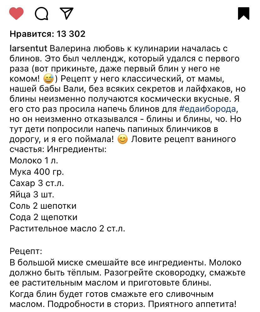 9 марта 2021 3 часа назад, kreolka сказал(а): Всех с масленицей, девочки Насчет блинов- сама я почти всегда делаю только по одному рецепту, на кефире, очень нравятся мне по вкусу эти блинчики Заварные блины на кефире: 2 стакана кефира 300 гр.муки 2 яйца 2/3 ч. л.соды 2 ст.л.раст. масла 1 стакан крутого кипятка 2 ст. л.сахара 2/3 ч.л. соли Кефир, яйца, сахар, соль и муку хорошо перемешать. В кипяток добавить соду, быстро перемешать и вылить в тесто. Все перемешать и дать постоять 5 минут. Добавить в тесто растительное масло и перемешать. Выпекать, готовые смазывать сливочным маслом ( из этого количества продуктов получается примерно 25 блинов)) О, никогда не готовила с кипятком, интересно попробовать. 3 часа назад, kreolka сказал(а): Вот ещё сохранила себе рецепт , телеведущая Тутта Ларсен делилась на своей страничке в ИГ рецептом блинов , которые готовит ее муж, со слов - получаются всегда оочень вкусные) А это классика. СветланаМ, Jemmalinne, kreolka и 4 других сказали спасибо Поделиться сообщением Ссылка на сообщение