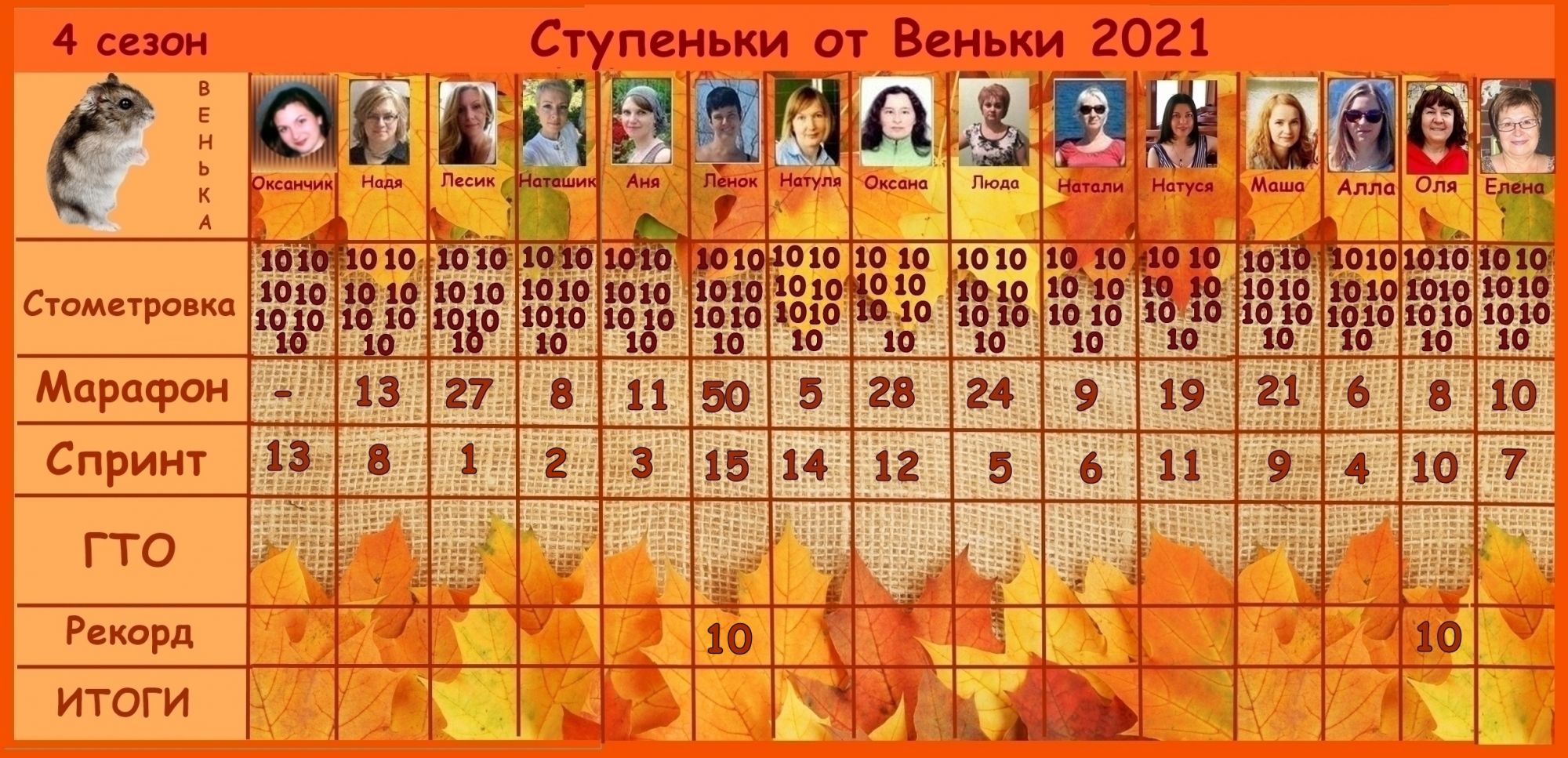 22 октября 2021 Смотрим таблицу Количество крестиков в "Марафоне" уже писали, считали, обсуждали ......и, наверняка, забыли Ниже цитирую сообщение с подсчётами: Скрытый текст Результат подсчёта крестиков и баллы в "Марафоне": Оля @colin 773 - 8 баллов Аня @Камма80 1071 - 11 баллов Ленок @lenaiura 5000 - 50 баллов Еленчик @igolkinitki 1000 - 10 баллов Наташик @kreolka 780 - 8 баллов Аллуся @markovka 600 -6 баллов Натали @Surik 935 - 9 баллов Натуля @PrimaN 497 - 5 баллов Оксана @росомашка 2847 -28 баллов Натуся @Raduga777 1865 - 19 баллов Лесик @lesik 2728 - 27 баллов Люда @Лаки - 2391 - 24 балла Надюша @Надежда Минск 1297 - 13 баллов Маша @Molly21 21хх - 21 балл Оксанчик Баллы начислялись следующим образом: За каждую сотню крестиков - 1 балл. Количество крестиков округляла в большую сторону, если оно переваливало за пятьдесят. Raduga777, PrimaN, Лаки и 10 других сказали спасибо Поделиться сообщением Ссылка на сообщение