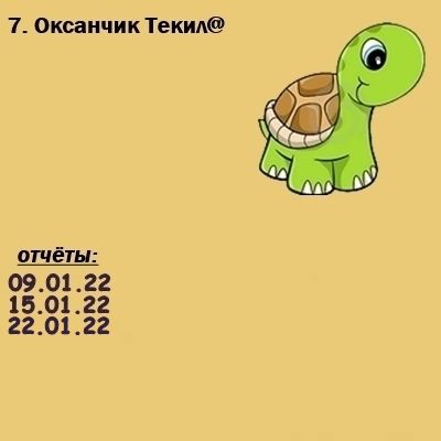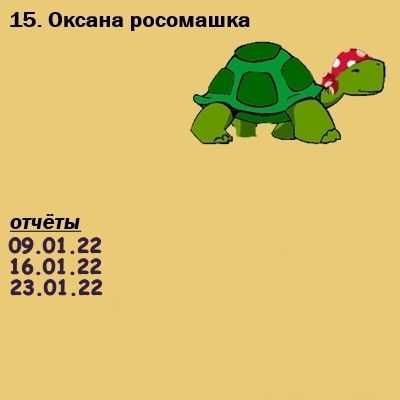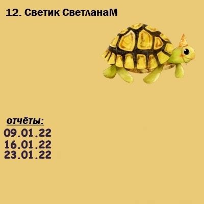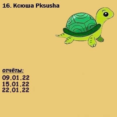 23 января 2022 Ура! Все отчитались! Все черепашки продвинулись вперёд! Текил@, Камма80, call_me_daria и 14 других сказали спасибо Поделиться сообщением Ссылка на сообщение