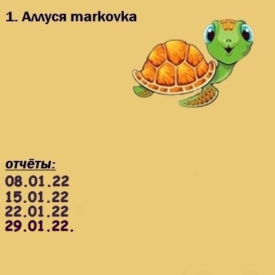 30 января 2022 Ну вот, все отчитались Все черепашки продвинулись Даша, твоя черепашка прошла два отчёта. Продолжай догонять! феня777, lesik, оленек и 12 других сказали спасибо Поделиться сообщением Ссылка на сообщение