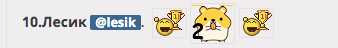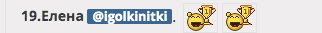 9 декабря 2022 Только что, СветланаМ сказал(а): Кстати, Еленчик, у тебя конкурент У Лесика теперь тоже две награды. Девочки, для тех, кто забыл, у Елены и Лесика теперь по два кубка Вполне могут стать полными кавалерами то есть, дамами, с грудью полной орденов О,да! И в этом году я могу рискнуть kreolka, феня777, Надежда Минск и 7 других сказали спасибо Поделиться сообщением Ссылка на сообщение