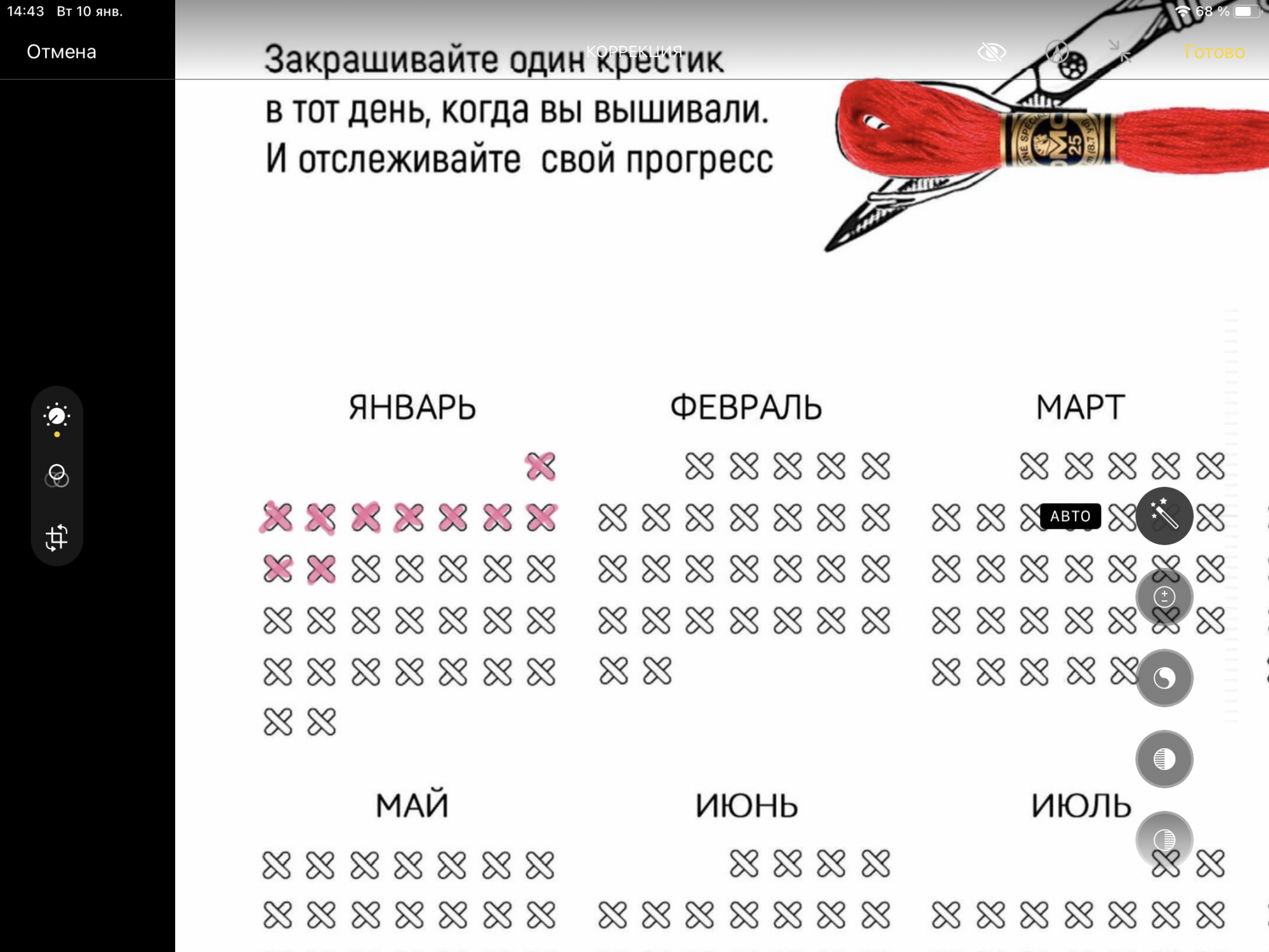 10 января 2023 4 часа назад, Надежда Минск сказал(а): Девочки, я совсем тёмная Как вы в электронном варианте отмечаете? Я просто - "редактировать pdf". Но оказалось, что мне не удобно отмечать без чисел, поэтому у меня есть дубликат - обычный календарь, а с него уже в вышивальный. Но обязуюсь распечатать в ближайшие дни. И тоже планирую отмечать финиши, например, кружочками. Будет наглядно сколько работ закончено за год. Surik, kreolka, чеба и 8 других сказали спасибо Поделиться сообщением Ссылка на сообщение