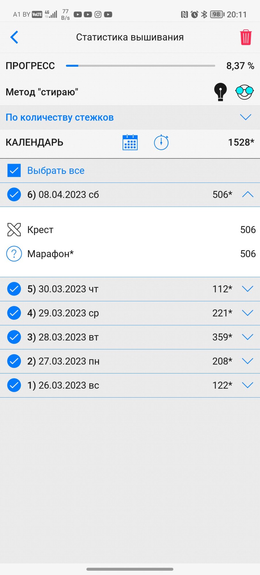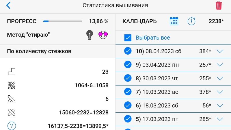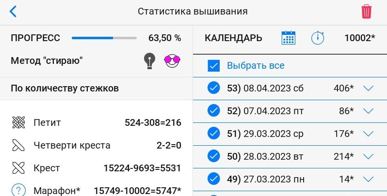 8 апреля 2023 Девочки, я старалась Рассказываю. Решила сама себе бросить вызов, а точнее - испытать свою вышивальную скорость по полной программе. Накануне засекла в Саге скорость (там есть такое, называется тоже "спринт"). И на прямом отрезке одной ниткой получилось 55 крестиков за 10 минут. Раньше моя скорость была 30-35 крестиков за это время. Но мы же теперь с Мартой! И вышивала я раньше одной рукой, а теперь двумя. Я впечатлилась, конечно Не думала, что настолько большая разница. Хотя справедливости ради надо сказать, что вышивала я по прямой без раздумывания куда дальше "идти", без заглядывания в схему вообще. Я забаррикадировалась от котов (чтобы не снимать их отовсюду каждые три минуты) и предупредила домашних, что ближайшие два часа меня нет. Перед забегом поужинала Заготовила под каждый процесс несколько иголок с нитками (в круге вообще бленд), разложила всё на столе рядом со станком, так что во время спринта я даже не вставала. Горизонтальными рядами мне вышивать полегче, но в определённый момент я перестала нормально видеть белые крестики, они стали сливаться с канвой. В общем, такой вот эксперимент Вывод: вышивание двумя руками на станке неплохо увеличивает скорость! Светик, надеюсь, фото нормально для подсчёта получились, пришлось со вспышкой фотографировать и не фотиком, а телефоном. Сага не очень информативна будет, так как я до спринта тоже вышивала немного эти процессы (ночью...), не сообразила, что потом же всё в один день зачтётся. Но всё равно прицеплю скрины. Первый это терраса, второй - круг. На сегодня я пока навышивалась Сажусь схему рисовать Каори, lenaiura, kas_julia и 18 других сказали спасибо Поделиться сообщением Ссылка на сообщение