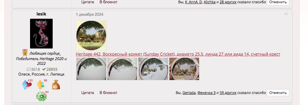 30 марта 28.03.2025 в 11:43, СветланаМ сказал(а): Лесик @lesik у тебя был двойной процесс Вышивальщицы Я попросила Татусю и она, спасибо ей, всё исправила Теперь в твоих процессах порядок Есть ещё один вопрос: а разве Воскресный крикет ты не закончила? Света, Крикет закончила, кто бы еще фото финальное сделал (((((. За вышивальщицу спасибо . Я как раз еду домой с вышивальной встречи, в магазинчике , где собирались, купила набор, давно смотрела на этих котиков. markovka, СветланаМ, kas_julia и 11 других сказали спасибо Поделиться сообщением Ссылка на сообщение