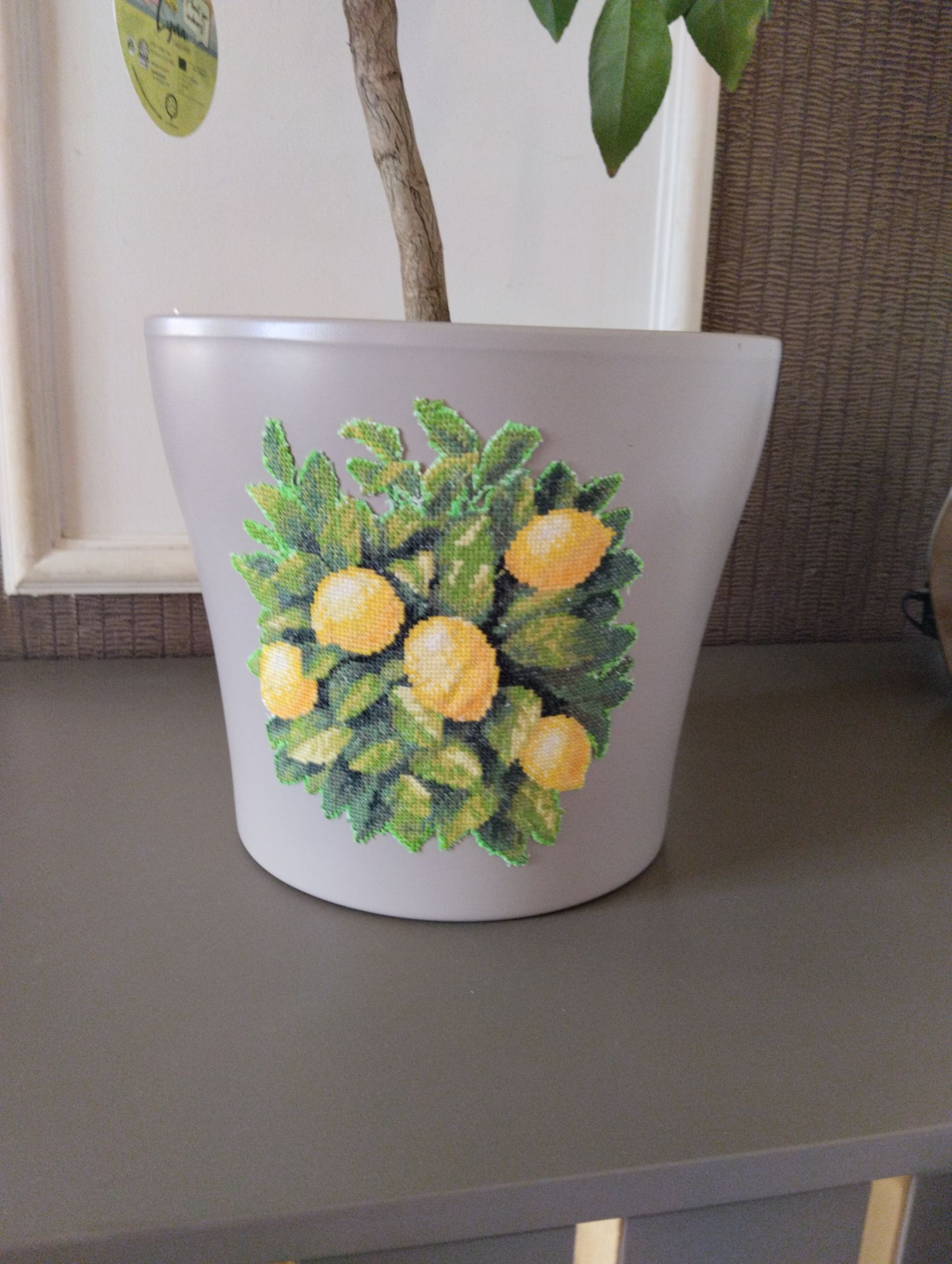 17 июня 1 час назад, чеба сказал(а): Не в тему , но про применение вышивки Скрыть содержимое Вышила давно, по набору был ещё ствол и горшок, я их вышивать не стала. И вот мы купили лимон в горшке. Я решила декорировать горшок - вырезала вышивку, закрасила края фломастером и наклеили. Результатом довольна!!! Ольгунь, мне лично очень нравится! В сдержанных цветах интерьера смотрится как арт-объект! markovka, Надежда Минск, Наta и 8 других сказали спасибо Поделиться сообщением Ссылка на сообщение