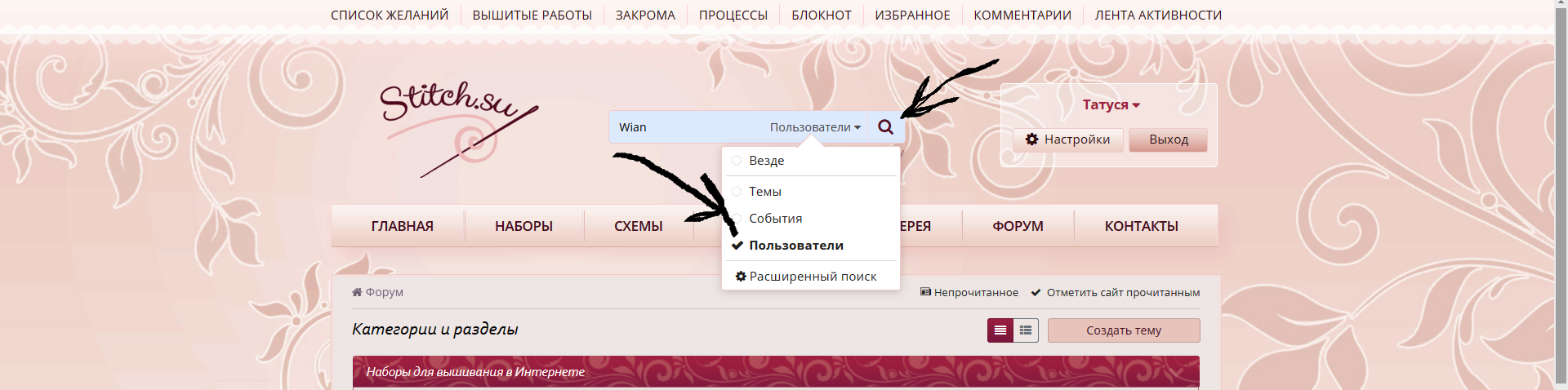 3 декабря 2019 6 минут назад, SvetlanaM сказал(а): может быть кто-нибудь мне подскажет, как быстро найти человека? Наверху страницы форума в строке поиска щелкаешь справа в этой строке "галочку" и выбираешь "Пользователи", пишешь логин. Потом там может расширенный поиск открыться, если не нашла. СветланаМ и феня777 сказали спасибо Поделиться сообщением Ссылка на сообщение