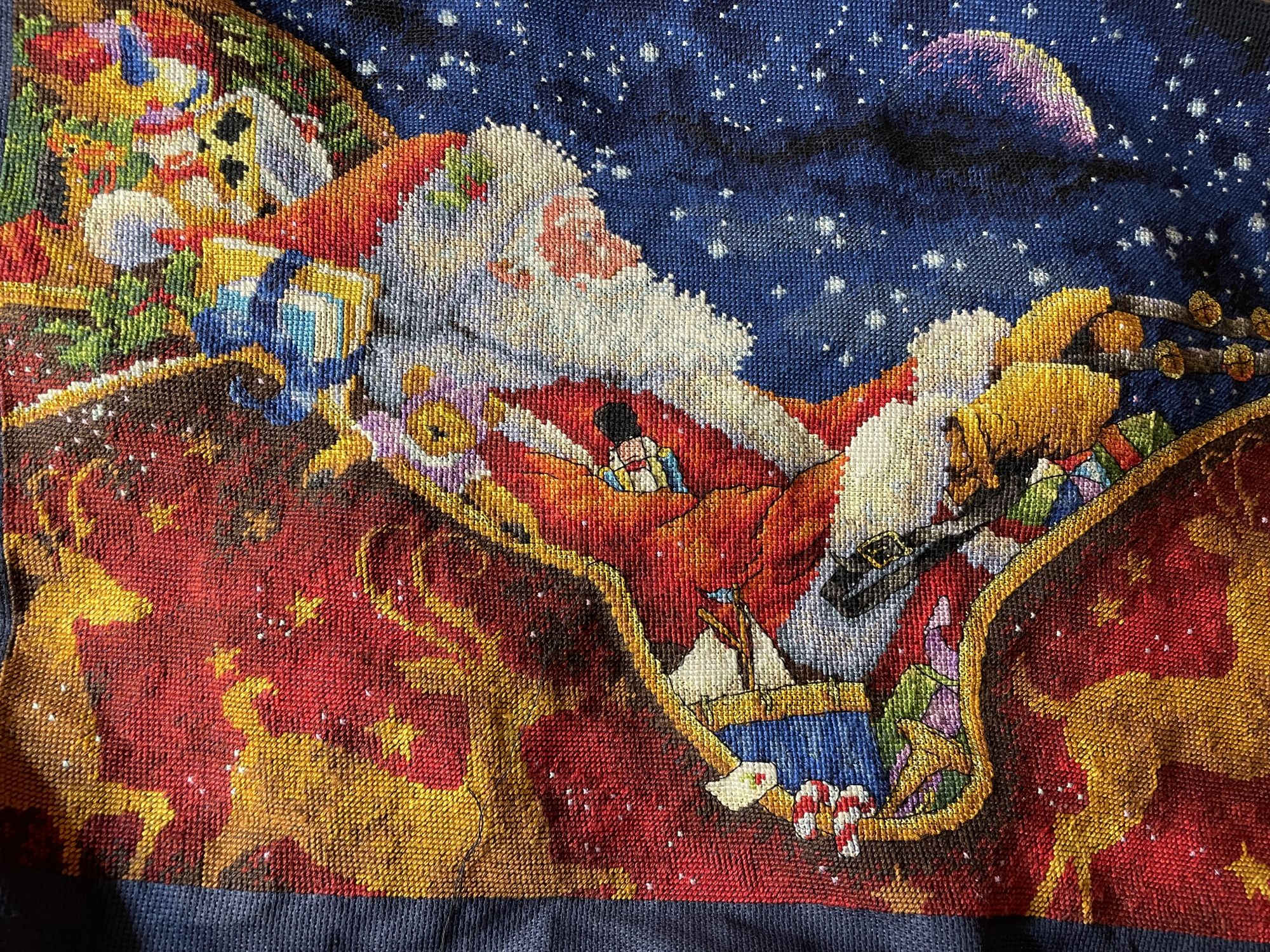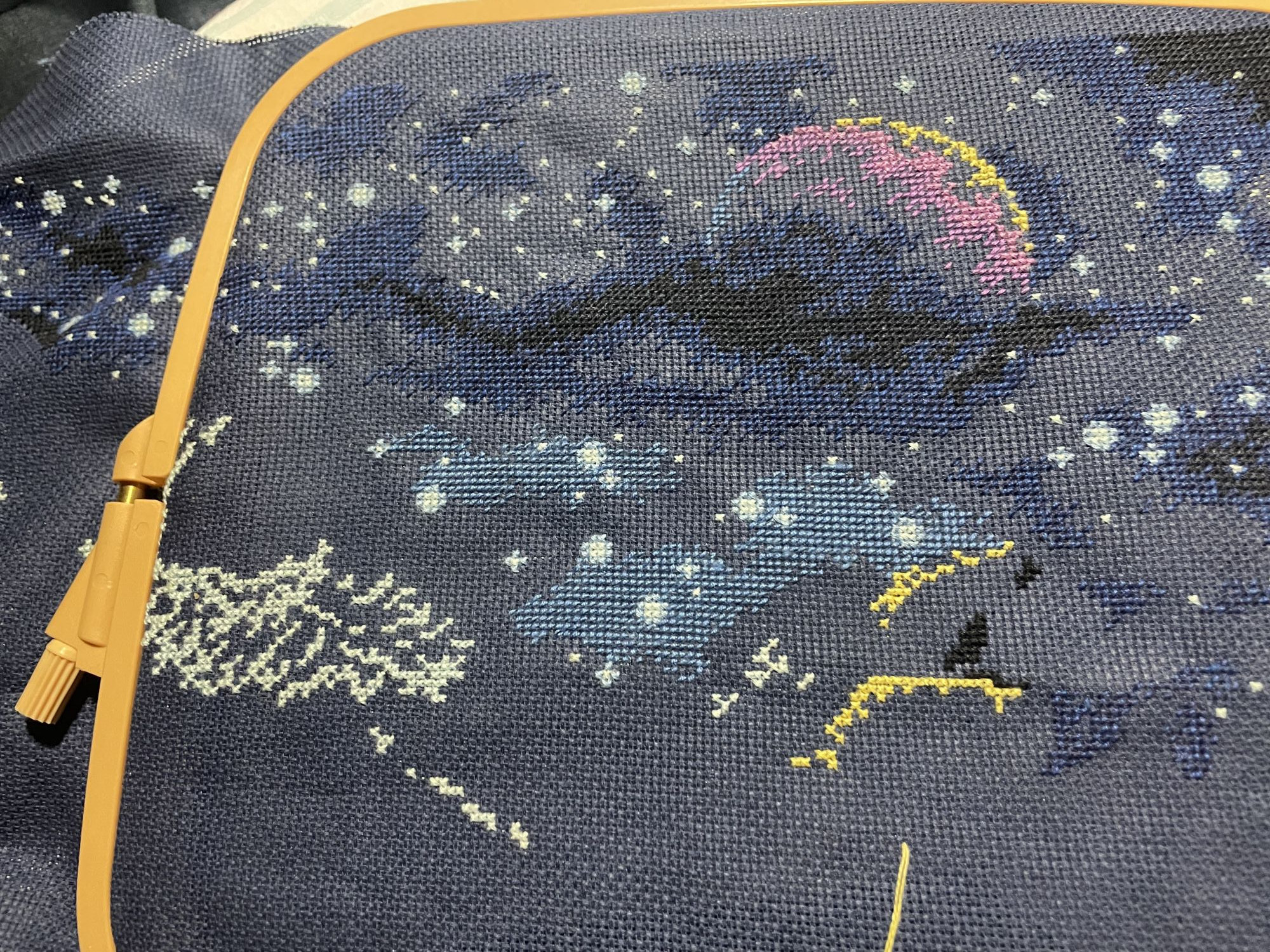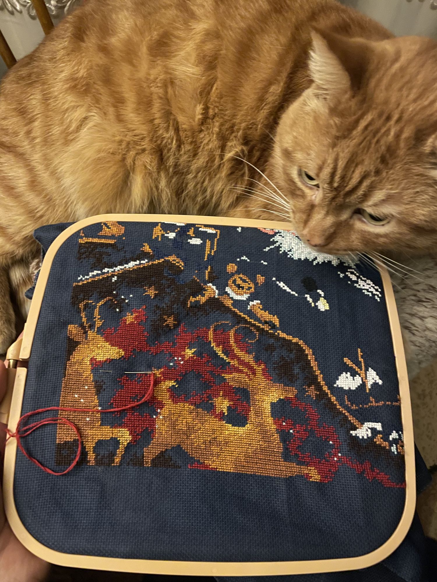 25 мая 2023 Хочу поделиться с вами процессом невероятной красоты, волшебства и праздника-моя мечта, и из ломящихся шкафов с моими хомячьи запасами-после покупки сразу попавшим в работу-не помню больше такого везунчика! ниток невероятное количество, прямо очень много, первоначально, разобрав набор, думала что хватит на два отшива начала с неба, что-то так заинтересовали переходы и хотелось увидеть результат, мы с помощником остались довольны! И хотя он и предлагал оставить все на этом этапе-решила продолжать. Вообще, процесс несложный-полукрестом вышивается 2/3работы, что существенно ускоряет процесс, а когда начали появляться сани процесс полетел-. Жаль, это был сложный период и на вышивку оставалось очень мало времени, поэтому вышивала с сентября 2022 по май 2023, но опять же, наслаждаясь процессом, он невероятный:. Вышивала 7,5 месяцев, и наконец финиш!!!! пеларгония, Lienilde, colin и 27 других сказали спасибо Поделиться сообщением Ссылка на сообщение