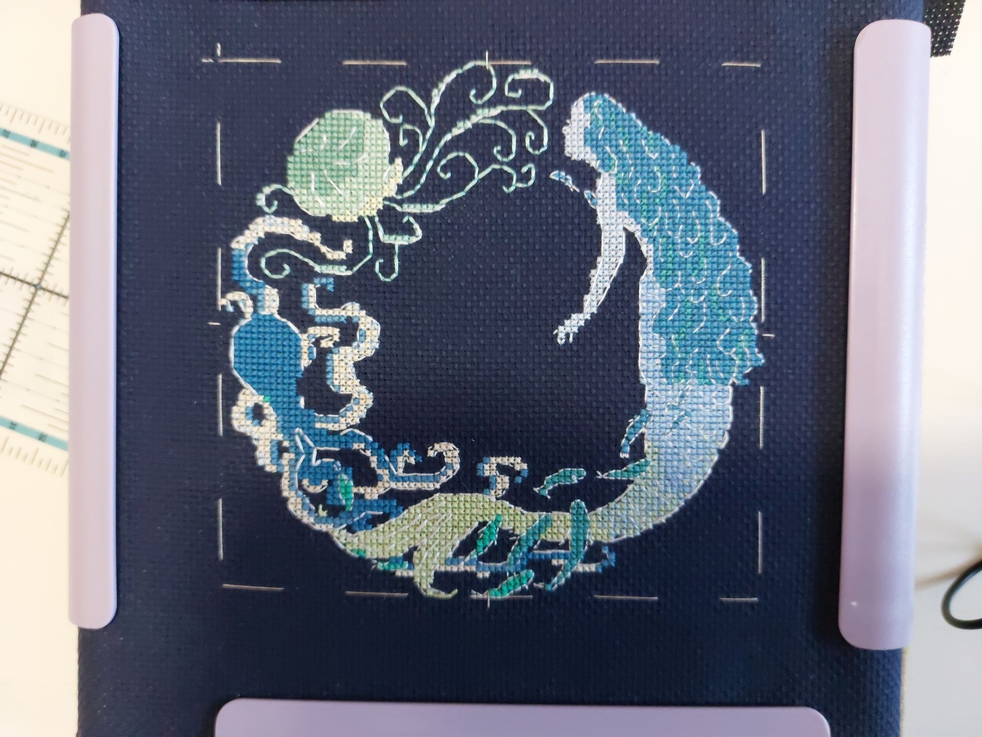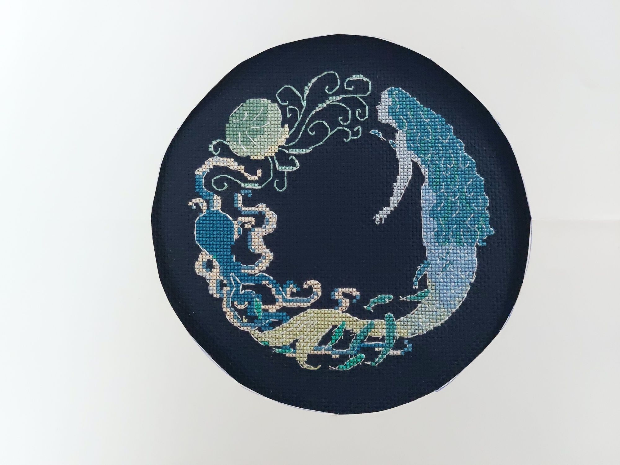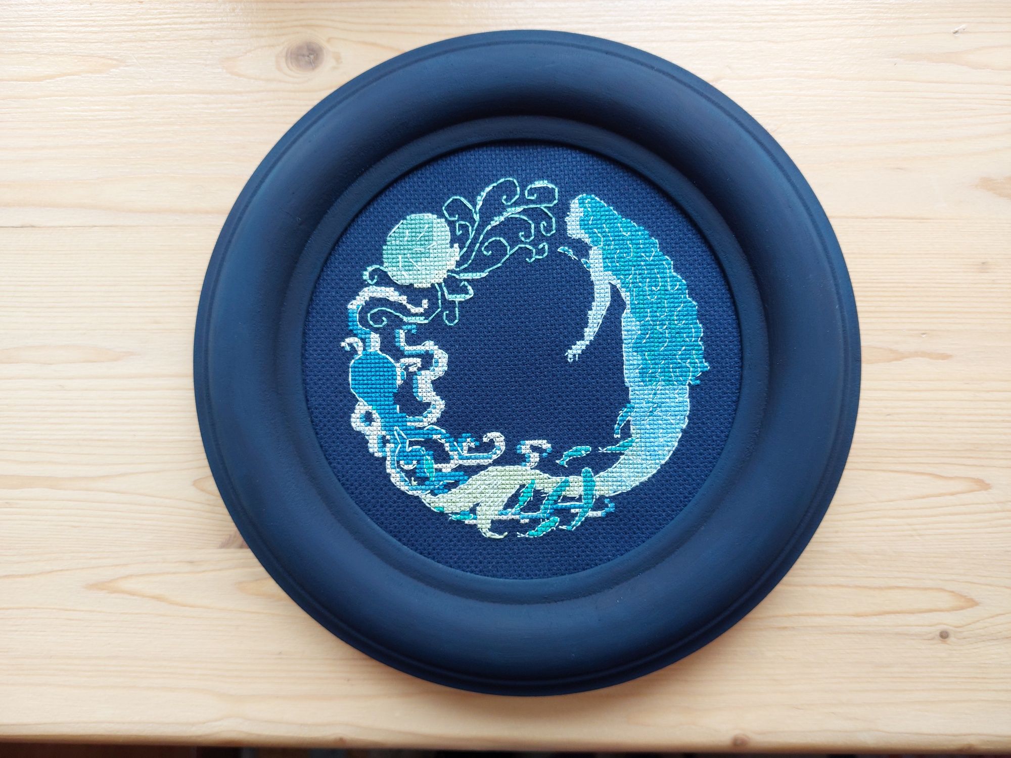 1 сентября Всем привет! И вот оставшиеся итоги за август. Вообще, у меня какой-то плодотворный месяц выдался, много раз ловила себя на мысли «а не забыла ли я что-то сделать, а то как-то слишком подозрительно много свободного времени»)) И долгожданный финиш! Flaming Kapok, Xiu Crafts. Финиш! Было: Стало: Хотела отложить процесс, и даже отложила. Но только на 3 дня) Доставала вышивку, чтобы снять с неё магнит для общего фото, а там вышивки-то немного уже и осталось (относительно всей работы). Что можно сказать по итогу: хорошо, что птиц вышивала почти в самом конце, а то бы точно забросила работу, как это было с предыдущим Xiu. Растительность вышивается легко, но неимоверно скучно и однообразно; ствол и тот был интересней, но и он под конец меня доконал. Цветы, несмотря на кажущуюся насыщенную красноту, вышиваются в основном розовым и оранжевым. Красный, точнее бордовый, присутствует только на в ибранных цветах и только на концах лепестков. Птиц я тоже считала красными, но они оказалась коричневыми (но на них я не в обиде, они такие ми-ми-ми!) Но готовая работа выглядит красиво, да. Этого у неё не отнять) А ещё внушительно: из-за больших припусков не влезает в мой рулон с неоформленными вышивками) А теперь череда «синих» процессов) Озеро, Мир вышивки. Продолжение. Было: Стало: Эх, есть в этой бочке мёда одна ложка дёгтя. На основе остаются белые полосы от снапов (основа не из набора). Если не уйдут после стирки, то надо будет посмотреть, что это за основа и больше её не покупать. А в остальном мне всё нравится, очень приятный процесс. И цветом основы довольна, и что цвета ниток листвы на ней уходят в желтизну тоже очень-очень нравится! Прям-таки ранняя осень получается) Сердечное тепло, РТО. Продолжение. Было: Стало: Не знаю что сказать) Вышивается легко и ненапряжно) И синий цвет такой яркий! Лето, по книге «Вышивка крестом из страны чудес» (ПОДБОР НЕ ПО КЛЮЧУ). Новый процесс! Должно быть: Есть: Опять замена основы с белой на синюю) Цвета не по ключу. Как увидела эту русалку, поняла, что она мне нужна на мою образовывающуюся «морскую» стену, с которой «слетела» Бабочка от Dimensions. Поэтому основу сразу было решено менять на тёмную. Выбор пал на ту же тёмно-синию, что и в Озере использую (тут-то я не планирую снапы переставлять), только 18 каунта, чтобы размер получился примерно как «Бабочки». Из-за того, что цвет основы выбрала тёмный, хотела только заменить русалке цвет кожи (а то чёрный будет не видно) на более светлый оттенок - на тон-два светлее её хвоста. Достала нитки на хвост, поняла, что мне они не нравится, а дальше всё как в тумане... Сейчас вышито по ключу только купол медузы и ещё планируются щупальца осьминога телесного цвета (на счёт последнего не уверена, но ничего лучше подобрать не удалось. С цветом волос русалки промахнулась, но мне так понравилось какими насыщенным голубыми выглядят нитки на этой основе, что оставила как есть (и собрала новые нитки на хвост и кожу). В хвосте сделала более плавный переход цветов: добавила повер вышитого дополнительные стежки полукрестом альтернативного цвета. В рыбах использовано 3 цвета ниток вместо двух, как в схеме, и ни один из них не совпадает с медузой. Ах, да! Купол медузы вышился по ключу чисто случайно: перебирала всю коробку зелёных ниток в поисках чего-то неяркого зелёного без примеси серого, выбрала в итоге два цвета, но сомневала