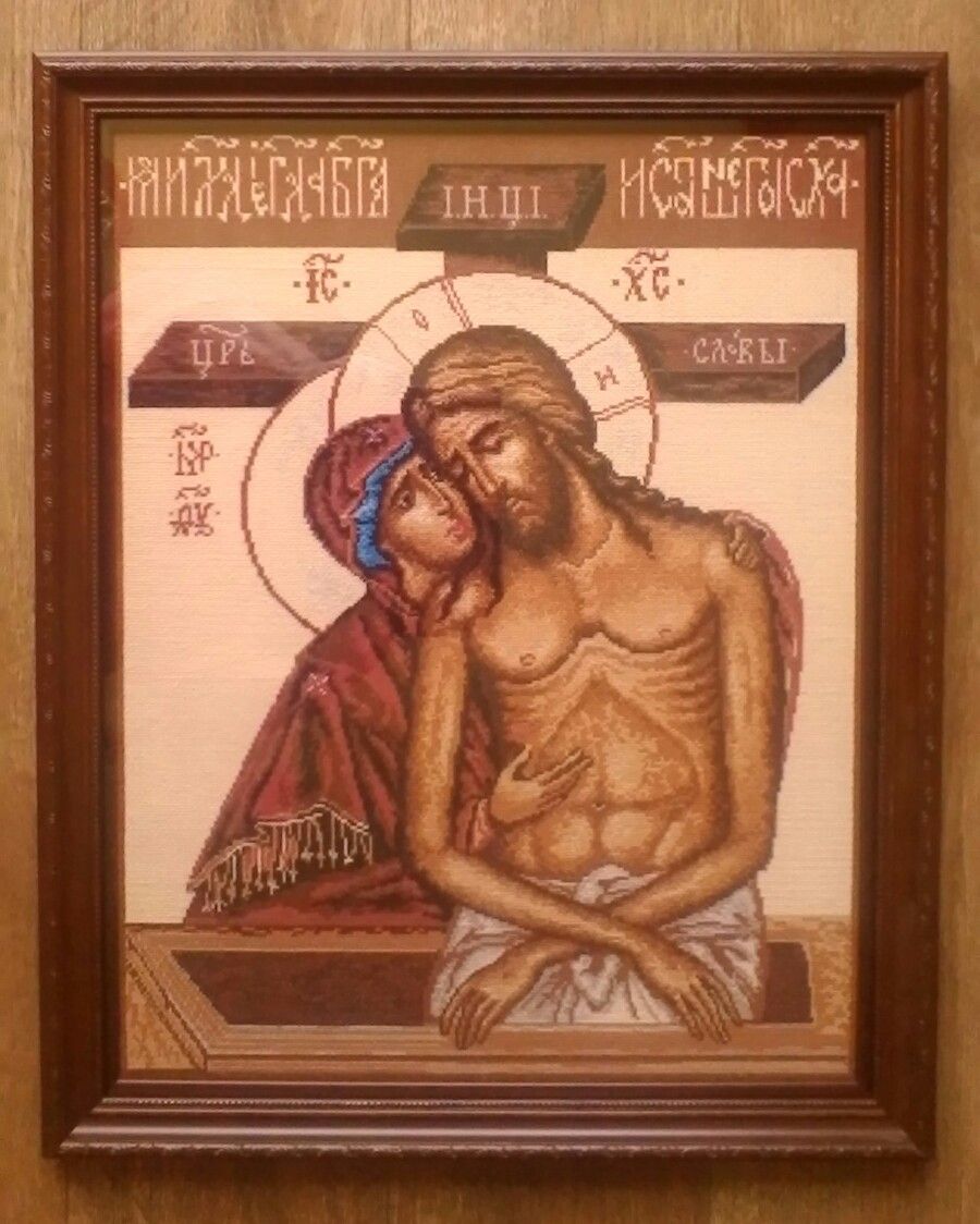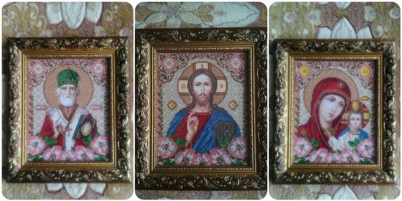 18 октября 2018 Добрый день. Рискну и я со своими работами. 1. Производитель «Вертоградъ» арт. С-907 «Богородица Покрова» атлас для вышивания бисером, размер 21*40 см, подбор бисера мой. Использовала больше 28 цветов. Вышила за месяц (август-сентябрь 2018) оформила сразу же. 2. Триптих от производителя Лиска, формат каждой иконы А-4: ki 4003-F Господь Вседержитель, ki 4001-F Пресвятая Богородица Казанская и ki 4002-F Николай чудотворец. Бисер подбирала сама. Очень понравились принты и лики, жаль, производитель закрылся. Вышивала поэтапно осенью 2017г. Оформила в декабре 2017, к дню рождения подруги. 3. Неизвестный производитель, схема для полного или частичного вышивания нитками мулине и бисером, печатный крест на канве. Арт.1326 размер 35*25,5 см Вышивала бисером, подбор мой. Использовала 42 цвета. Если бы знала, с чем столкнусь, не за что не стала бы связываться. Поэтому работа растянулась на 8 месяцев. katmis, makalicha1970, Гусёна и 107 других сказали спасибо Поделиться сообщением Ссылка на сообщение