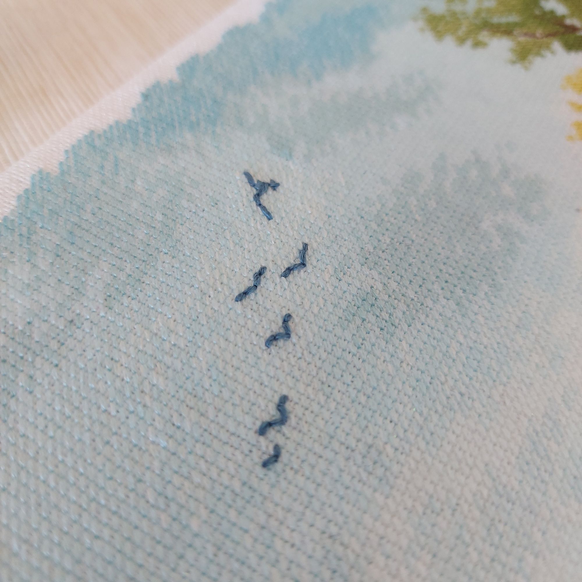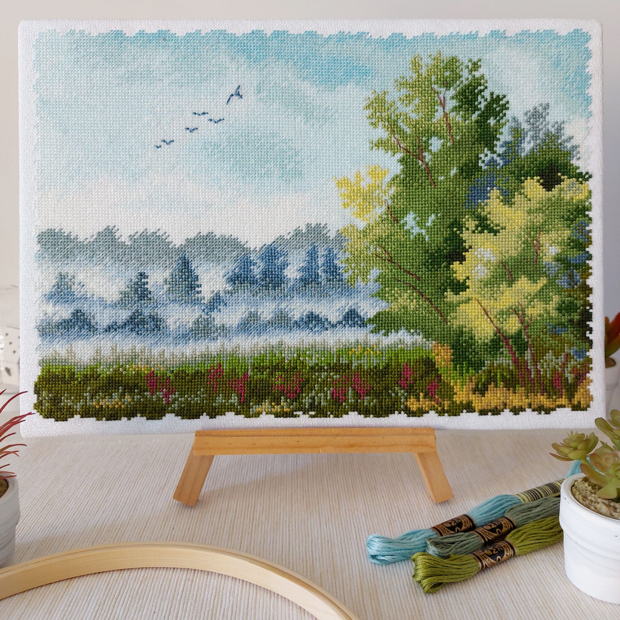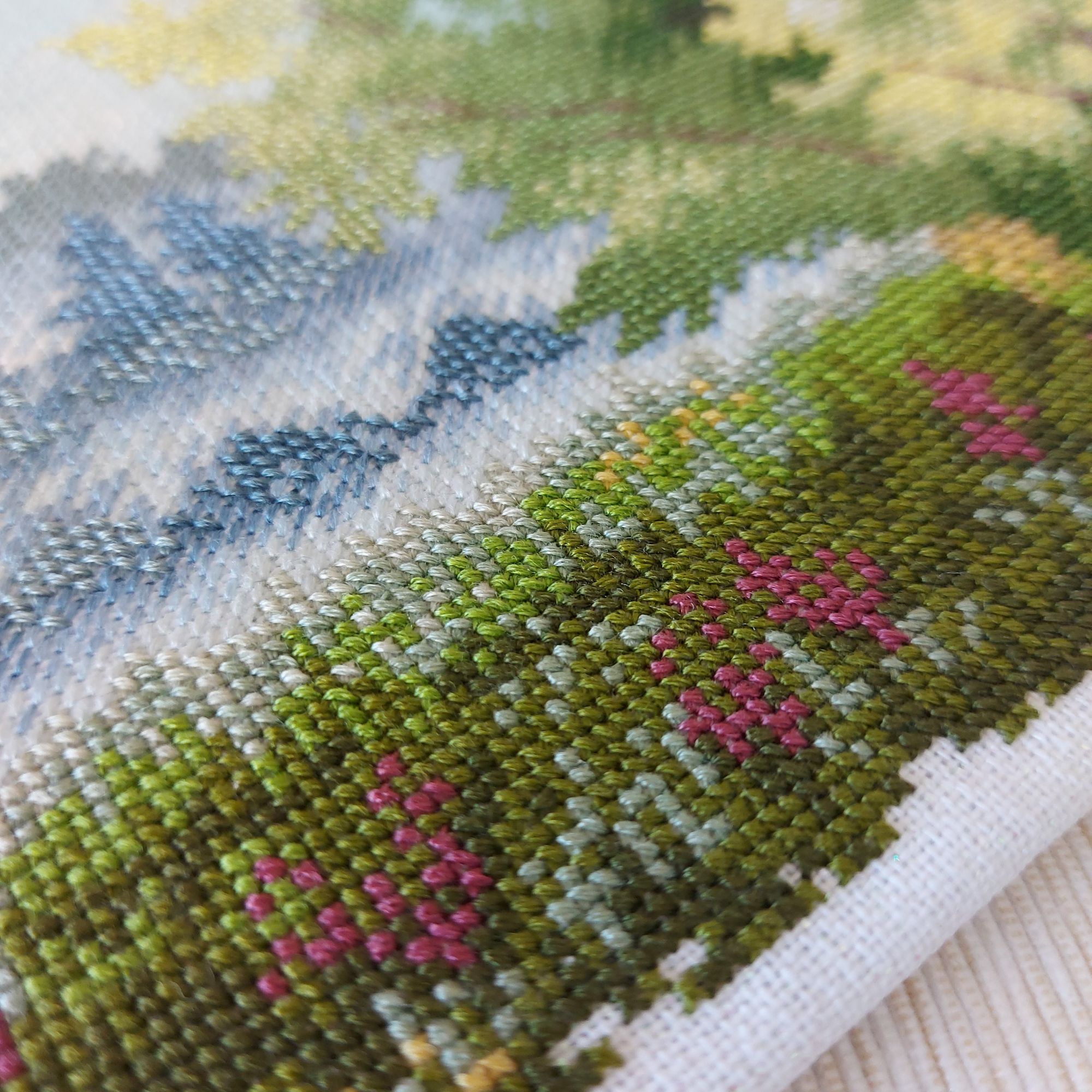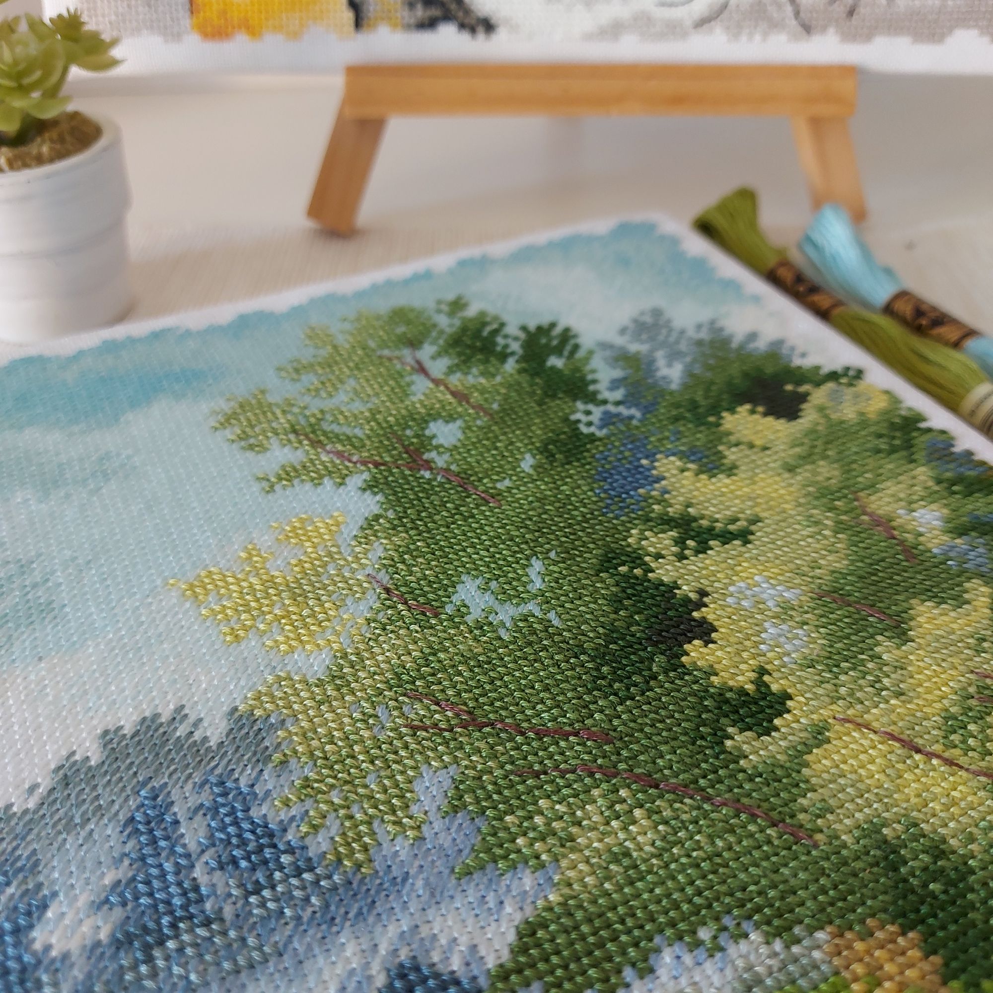 5 марта 2021 Барабанная дробь. С городостью представляю вам живописный "Туман". Вышивала на белой равномерке Мурано с люрексом 32 каунт. Выбрала ее только потому что в магазине не оказалось обыкновенной белой основы, а ждать пару недель не хотелось. Тешила себя надеждой, что люрекс будет красиво блестеть через крестики и полукрестики. Скажу честно - не блестит, зато очень красиво переливается та полоска незашитой ткани, которую я заботливо оставила по краям при оформлении. Кстати, об оформлении, я использовала тот же трюк, что и с большинством других своих работ и просто натянула вышивку на подрамник. Я подробно рассказываю о том, как я это делаю в видео https://www.youtube.com/watch?v=A_apHBcLnFs&t=60s. Посмотрите, если вам интересно - отличный способ экономии вышивального бюджета. Что касается самой вышивки, то работа была достаточно простая. Плюс, в схеме практически нет бэка, несколько веточек на деревьях и птички на горизонте, что на мой взгляд добавляет работе еще больше акварельности. Naduh, Кисуля, Novia и 4 других сказали спасибо Поделиться сообщением Ссылка на сообщение