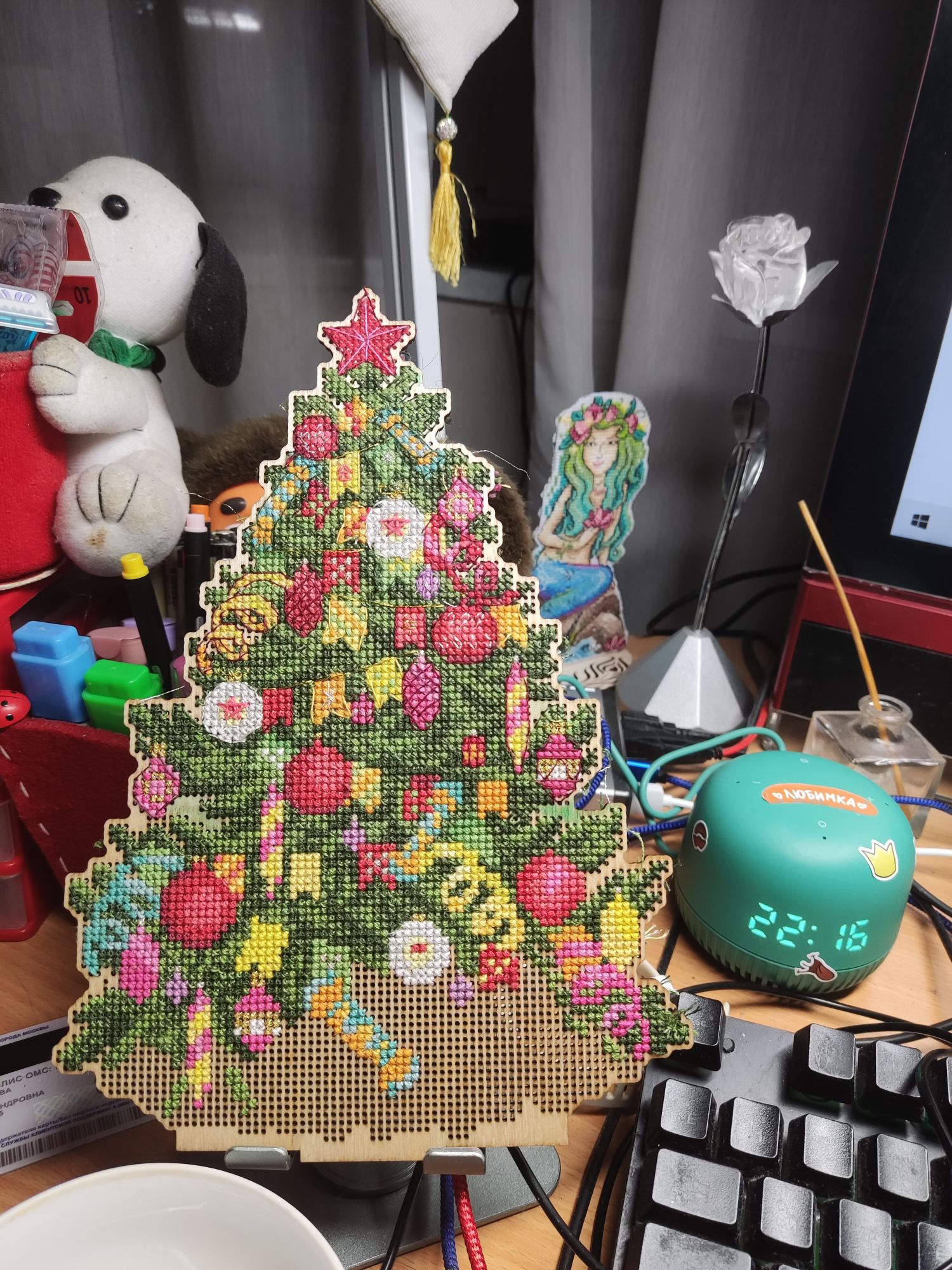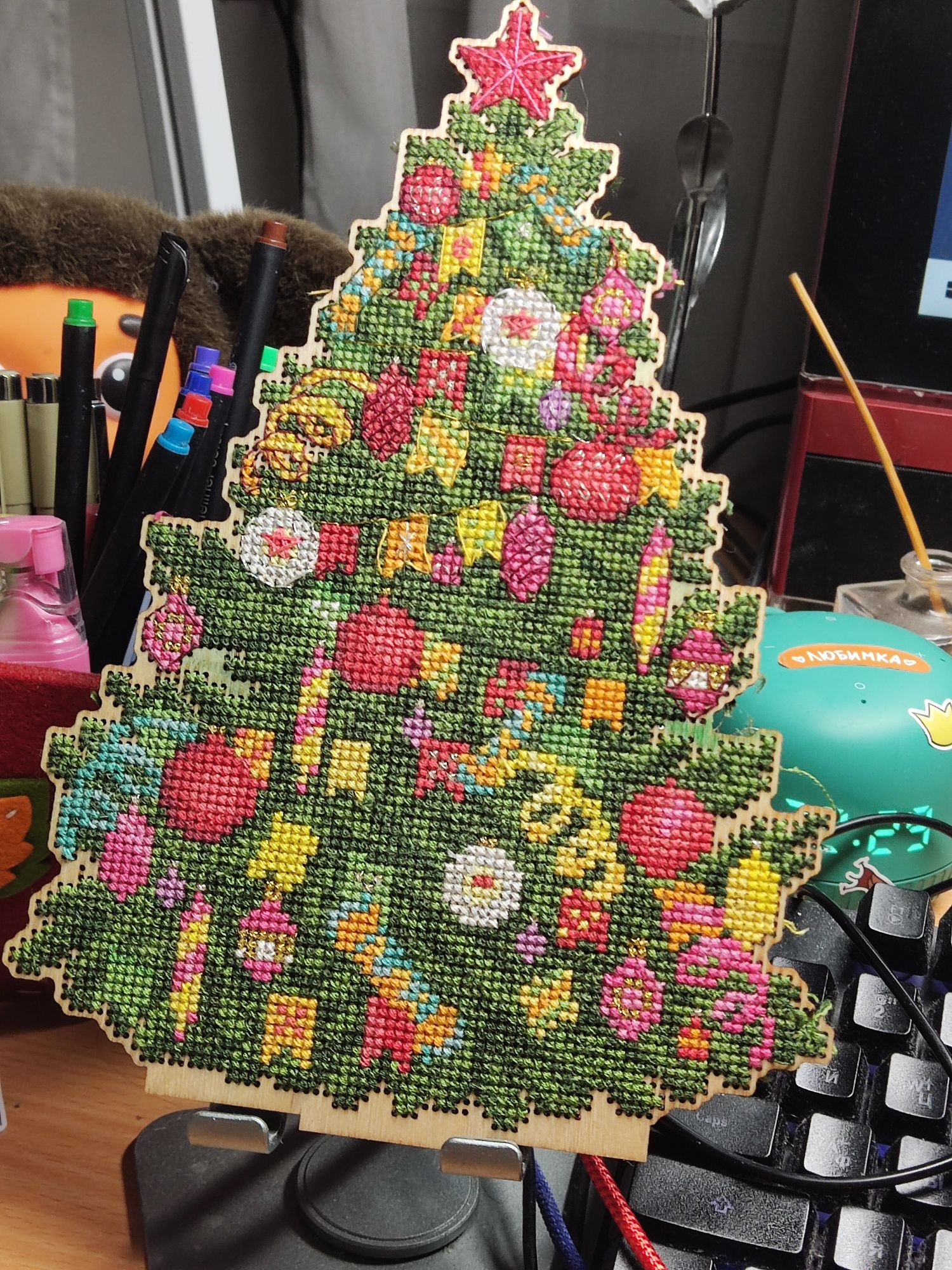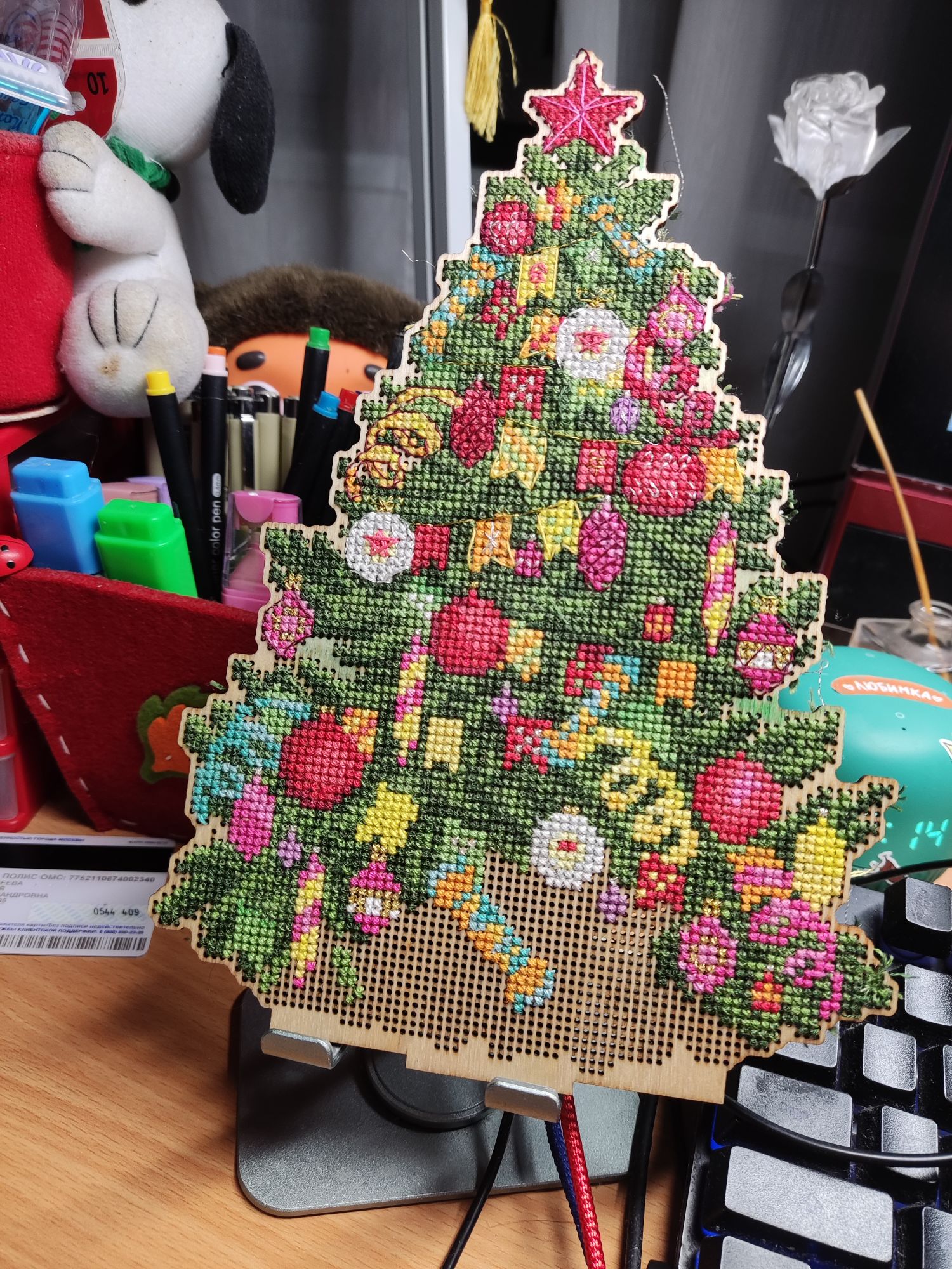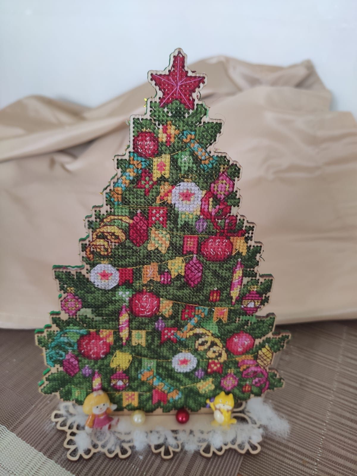 8 апреля 2024 Несу ещё один финиш. Ёлка готова! Замечание по процессу: 1) Определить лицевую сторону заготовки или будет ошибка! 2);Осторожно, заготовка может быть треснутая. Я не стала никому писать и «стянула» всё нитками. Но внимательнее. 3) Мне не хватило темно-зеленого цвета. Даже не пассы, а больше. Хорошо, что в ключе указаны номера Гаммы. 4) Пришивать навесные игрушки не стала, вживую не понравилось. А вприкреп шить не мое, так что золотая гирлянда из набора тоже мимо, но и так отлично выглядит. Игрушки частично ушли на украшение подставки Bogdan сказал(а) спасибо Поделиться сообщением Ссылка на сообщение